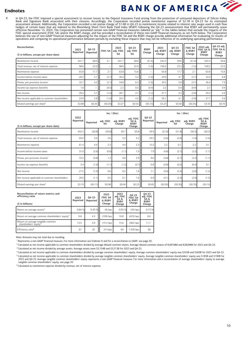 10 Endnotes A In Q4-23, the FDIC imposed a special assessment to recover losses to the Deposit Insurance Fund arising from the protection of uninsured depositors of Silicon Valley Bank and Signature Bank associated with their closures. Accordingly, the Corporation recorded pretax noninterest expense of $2.1B in Q4-23 for its estimated assessment amount. Additionally, the Corporation recorded a net pretax charge of $1.6B in Q4-23 to noninterest income related to interest rate swaps used in cash flow hedges of certain loans that are indexed to the Bloomberg Short-Term Bank Yield Index (BSBY) following the Q4-23 announcement that BSBY will permanently cease effective November 15, 2024. The Corporation has presented certain non-GAAP financial measures (labeled as “adj.” in the tables below) that exclude the impacts of the FDIC special assessment (FDIC SA) and/or the BSBY charge, and has provided a reconciliation of these non-GAAP financial measures as set forth below. The Corporation believes the use of non-GAAP financial measures adjusting for the impact of the FDIC SA and the BSBY charge provide additional information for evaluating its results of operations and comparing its operational performance between periods by excluding these impacts that may not be reflective of its underlying operating performance. Note: Amounts may not total due to rounding. 1 Represents a non-GAAP financial measure. For more information see Endnote H and for a reconciliation to GAAP, see page 20. 2 Calculated as net income applicable to common shareholders divided by average diluted common shares. Average diluted common shares of 8,081MM and 8,062MM for 2023 and Q4-23. 3 Calculated as net income divided by average assets. Average assets were $3,154B and $3,213B for 2023 and Q4-23. 4 Calculated as net income applicable to common shareholders divided by average common shareholders’ equity. Average common shareholders’ equity was $255B and $260B for 2023 and Q4-23. 5 Calculated as net income applicable to common shareholders divided by average tangible common shareholders’ equity. Average tangible common shareholders’ equity was $185B and $190B for 2023 and Q4-23. Average tangible common shareholders’ equity represents a non-GAAP financial measure. For more information and a reconciliation of average shareholders’ equity to average tangible common shareholders’ equity, see page 20. 6 Calculated as noninterest expense divided by revenue, net of interest expense. Reconciliation ($ in billions, except per share data) 2023 Reported Q4-23 Reported FDIC SA 2023 adj. FDIC SA Q4-23 adj. FDIC SA BSBY Charge 2023 adj. BSBY Charge Q4-23 adj. BSBY Charge FDIC SA & BSBY Charge 2023 adj. FDIC SA & BSBY Charge Q4-23 adj. FDIC SA & BSBY Charge Noninterest income $41.7 $8.0 $— $41.7 $8.0 ($1.6) $43.2 $9.6 ($1.6) $43.3 $9.6 Total revenue, net of interest expense 98.6 22.0 — 98.6 22.0 (1.6) 100.2 23.5 (1.6) 100.2 23.5 Noninterest expense 65.8 17.7 2.1 63.8 15.6 — 65.8 17.7 2.1 63.8 15.6 Income before income taxes 28.3 3.1 (2.1) 30.4 5.2 (1.6) 29.9 4.7 (3.7) 32.0 6.8 Pretax, pre-provision income1 32.7 4.2 (2.1) 34.8 6.3 (1.6) 34.3 5.8 (3.7) 36.4 7.9 Income tax expense (benefit) 1.8 — (0.5) 2.3 0.5 (0.4) 2.2 0.4 (0.9) 2.7 0.9 Net income 26.5 3.1 (1.6) 28.1 4.7 (1.2) 27.7 4.3 (2.8) 29.3 5.9 Net income applicable to common shareholders 24.9 2.8 (1.6) 26.5 4.5 (1.2) 26.1 4.1 (2.8) 27.7 5.6 Diluted earnings per share2 $3.08 $0.35 ($0.20) $3.27 $0.55 ($0.15) $3.23 $0.50 ($0.35) $3.42 $0.70 2022 Reported Inc / (Dec) Q4-22 Reported Inc / (Dec) ($ in billions, except per share data) Reported adj. FDIC SA adj. BSBY Charge adj. FDIC SA & BSBY Charge Reported adj. FDIC SA adj. BSBY Charge adj. FDIC SA & BSBY Charge Noninterest income $42.5 ($0.8) ($0.8) $0.7 $0.8 $9.9 ($1.8) ($1.8) ($0.3) ($0.3) Total revenue, net of interest expense 95.0 3.6 3.6 5.3 5.2 24.5 (2.6) (2.6) (1.0) (1.0) Noninterest expense 61.4 4.4 2.3 4.4 2.3 15.5 2.2 0.1 2.2 0.1 Income before income taxes 31.0 (2.6) (0.6) (1.1) 1.0 7.9 (4.8) (2.7) (3.2) (1.1) Pretax, pre-provision income1 33.5 (0.8) 1.3 0.8 2.9 9.0 (4.8) (2.7) (3.2) (1.1) Income tax expense (benefit) 3.4 (1.6) (1.1) (1.2) (0.7) 0.8 (0.8) (0.3) (0.4) 0.1 Net income 27.5 (1.0) 0.6 0.2 1.8 7.1 (4.0) (2.4) (2.8) (1.2) Net income applicable to common shareholders 26.0 (1.1) 0.5 0.1 1.6 6.9 (4.1) (2.4) (2.9) (1.3) Diluted earnings per share2 $3.19 ($0.11) $0.08 $0.04 $0.23 $0.85 ($0.50) ($0.30) ($0.35) ($0.15) Reconciliation of return metrics and efficiency ratio ($ in billions) 2023 Reported Q4-23 Reported 2023 FDIC SA & BSBY Charge 2023 adj. FDIC SA & BSBY Charge Q4-23 FDIC SA & BSBY Charge Q4-23 adj. FDIC SA & BSBY Charge Return on average assets3 0.84 % 0.39 % (9) bps 0.93 % (34) bps 0.73 % Return on average common shareholders’ equity4 9.8 4.3 (109) bps 10.8 (425) bps 8.6 Return on average tangible common shareholders’ equity5 13.5 5.9 (151) bps 15.0 (582) bps 11.7 Efficiency ratio6 67 81 314 bps 64 1,430 bps 66