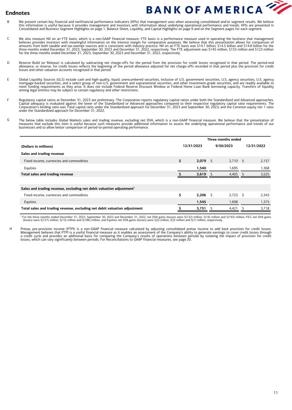 11 Endnotes Three months ended (Dollars in millions) 12/31/2023 9/30/2023 12/31/2022 Sales and trading revenue Fixed-income, currencies and commodities $ 2,079 $ 2,710 $ 2,157 Equities 1,540 1,695 1,368 Total sales and trading revenue $ 3,619 $ 4,405 $ 3,525 Sales and trading revenue, excluding net debit valuation adjustment1 Fixed-income, currencies and commodities $ 2,206 $ 2,723 $ 2,343 Equities 1,545 1,698 1,375 Total sales and trading revenue, excluding net debit valuation adjustment $ 3,751 $ 4,421 $ 3,718 B We present certain key financial and nonfinancial performance indicators (KPIs) that management uses when assessing consolidated and/or segment results. We believe this information is useful because it provides management and investors with information about underlying operational performance and trends. KPIs are presented in Consolidated and Business Segment Highlights on page 1, Balance Sheet, Liquidity, and Capital Highlights on page 9 and on the Segment pages for each segment. C We also measure NII on an FTE basis, which is a non-GAAP financial measure. FTE basis is a performance measure used in operating the business that management believes provides investors with meaningful information on the interest margin for comparative purposes. We believe that this presentation allows for comparison of amounts from both taxable and tax-exempt sources and is consistent with industry practice. NII on an FTE basis was $14.1 billion, $14.5 billion and $14.8 billion for the three months ended December 31, 2023, September 30, 2023 and December 31, 2022, respectively. The FTE adjustment was $145 million, $153 million and $123 million for the three months ended December 31, 2023, September 30, 2023 and December 31, 2022, respectively. D Reserve Build (or Release) is calculated by subtracting net charge-offs for the period from the provision for credit losses recognized in that period. The period-end allowance, or reserve, for credit losses reflects the beginning of the period allowance adjusted for net charge-offs recorded in that period plus the provision for credit losses and other valuation accounts recognized in that period. E Global Liquidity Sources (GLS) include cash and high-quality, liquid, unencumbered securities, inclusive of U.S. government securities, U.S. agency securities, U.S. agency mortgage-backed securities, and a select group of non-U.S. government and supranational securities, and other investment-grade securities, and are readily available to meet funding requirements as they arise. It does not include Federal Reserve Discount Window or Federal Home Loan Bank borrowing capacity. Transfers of liquidity among legal entities may be subject to certain regulatory and other restrictions. F Regulatory capital ratios at December 31, 2023 are preliminary. The Corporation reports regulatory capital ratios under both the Standardized and Advanced approaches. Capital adequacy is evaluated against the lower of the Standardized or Advanced approaches compared to their respective regulatory capital ratio requirements. The Corporation’s binding ratio was Total capital ratio under the Standardized approach for December 31, 2023 and September 30, 2023; and the Common equity tier 1 ratio under the Standardized approach for December 31, 2022. G The below table includes Global Markets sales and trading revenue, excluding net DVA, which is a non-GAAP financial measure. We believe that the presentation of measures that exclude this item is useful because such measures provide additional information to assess the underlying operational performance and trends of our businesses and to allow better comparison of period-to-period operating performance. 1 For the three months ended December 31, 2023, September 30, 2023 and December 31, 2022, net DVA gains (losses) were $(132) million, $(16) million and $(193) million, FICC net DVA gains (losses) were $(127) million, $(13) million and $(186) million, and Equities net DVA gains (losses) were $(5) million, $(3) million and $(7) million, respectively. H Pretax, pre-provision income (PTPI) is a non-GAAP financial measure calculated by adjusting consolidated pretax income to add back provision for credit losses. Management believes that PTPI is a useful financial measure as it enables an assessment of the Company’s ability to generate earnings to cover credit losses through a credit cycle and provides an additional basis for comparing the Company's results of operations between periods by isolating the impact of provision for credit losses, which can vary significantly between periods. For Reconciliations to GAAP financial measures, see page 20.