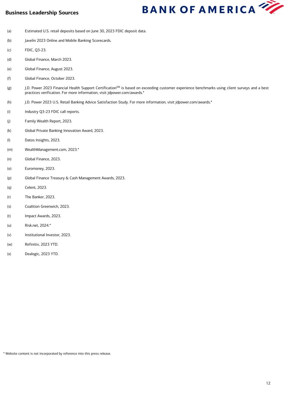 12 (a) Estimated U.S. retail deposits based on June 30, 2023 FDIC deposit data. (b) Javelin 2023 Online and Mobile Banking Scorecards. (c) FDIC, Q3-23. (d) Global Finance, March 2023. (e) Global Finance, August 2023. (f) Global Finance, October 2023. (g) J.D. Power 2023 Financial Health Support CertificationSM is based on exceeding customer experience benchmarks using client surveys and a best practices verification. For more information, visit jdpower.com/awards.* (h) J.D. Power 2023 U.S. Retail Banking Advice Satisfaction Study. For more information, visit jdpower.com/awards.* (i) Industry Q3-23 FDIC call reports. (j) Family Wealth Report, 2023. (k) Global Private Banking Innovation Award, 2023. (l) Datos Insights, 2023. (m) WealthManagement.com, 2023.* (n) Global Finance, 2023. (o) Euromoney, 2023. (p) Global Finance Treasury & Cash Management Awards, 2023. (q) Celent, 2023. (r) The Banker, 2023. (s) Coalition Greenwich, 2023. (t) Impact Awards, 2023. (u) Risk.net, 2024.* (v) Institutional Investor, 2023. (w) Refinitiv, 2023 YTD. (x) Dealogic, 2023 YTD. Business Leadership Sources * Website content is not incorporated by reference into this press release.