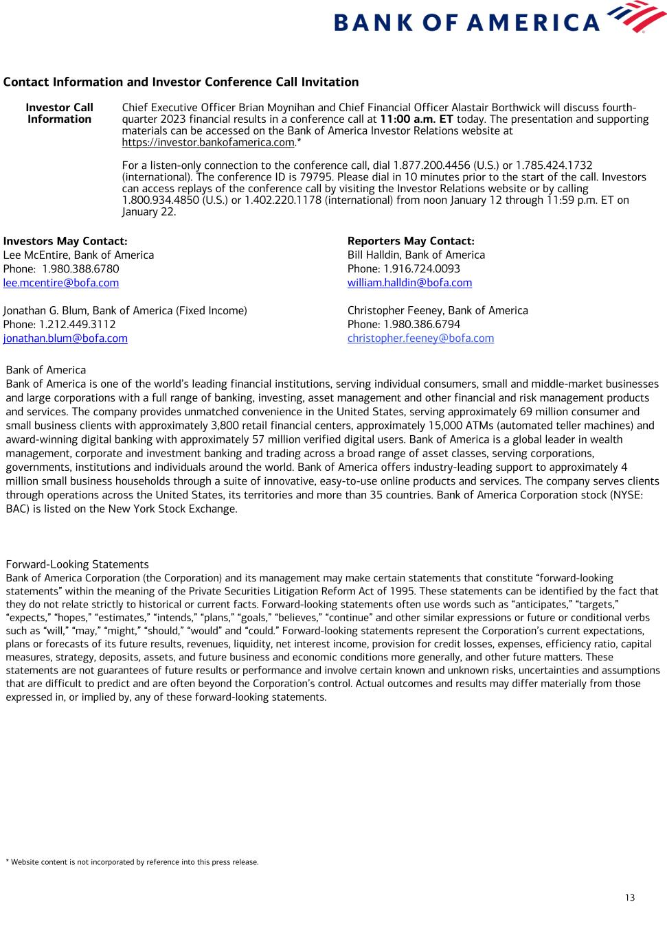 13 Contact Information and Investor Conference Call Invitation Investor Call Information Chief Executive Officer Brian Moynihan and Chief Financial Officer Alastair Borthwick will discuss fourth- quarter 2023 financial results in a conference call at 11:00 a.m. ET today. The presentation and supporting materials can be accessed on the Bank of America Investor Relations website at https://investor.bankofamerica.com.* For a listen-only connection to the conference call, dial 1.877.200.4456 (U.S.) or 1.785.424.1732 (international). The conference ID is 79795. Please dial in 10 minutes prior to the start of the call. Investors can access replays of the conference call by visiting the Investor Relations website or by calling 1.800.934.4850 (U.S.) or 1.402.220.1178 (international) from noon January 12 through 11:59 p.m. ET on January 22. Investors May Contact: Lee McEntire, Bank of America Phone: 1.980.388.6780 lee.mcentire@bofa.com Jonathan G. Blum, Bank of America (Fixed Income) Phone: 1.212.449.3112 jonathan.blum@bofa.com Bank of America Bank of America is one of the world’s leading financial institutions, serving individual consumers, small and middle-market businesses and large corporations with a full range of banking, investing, asset management and other financial and risk management products and services. The company provides unmatched convenience in the United States, serving approximately 69 million consumer and small business clients with approximately 3,800 retail financial centers, approximately 15,000 ATMs (automated teller machines) and award-winning digital banking with approximately 57 million verified digital users. Bank of America is a global leader in wealth management, corporate and investment banking and trading across a broad range of asset classes, serving corporations, governments, institutions and individuals around the world. Bank of America offers industry-leading support to approximately 4 million small business households through a suite of innovative, easy-to-use online products and services. The company serves clients through operations across the United States, its territories and more than 35 countries. Bank of America Corporation stock (NYSE: BAC) is listed on the New York Stock Exchange. Forward-Looking Statements Bank of America Corporation (the Corporation) and its management may make certain statements that constitute “forward-looking statements” within the meaning of the Private Securities Litigation Reform Act of 1995. These statements can be identified by the fact that they do not relate strictly to historical or current facts. Forward-looking statements often use words such as “anticipates,” “targets,” “expects,” “hopes,” “estimates,” “intends,” “plans,” “goals,” “believes,” “continue” and other similar expressions or future or conditional verbs such as “will,” “may,” “might,” “should,” “would” and “could.” Forward-looking statements represent the Corporation’s current expectations, plans or forecasts of its future results, revenues, liquidity, net interest income, provision for credit losses, expenses, efficiency ratio, capital measures, strategy, deposits, assets, and future business and economic conditions more generally, and other future matters. These statements are not guarantees of future results or performance and involve certain known and unknown risks, uncertainties and assumptions that are difficult to predict and are often beyond the Corporation’s control. Actual outcomes and results may differ materially from those expressed in, or implied by, any of these forward-looking statements. * Website content is not incorporated by reference into this press release. Reporters May Contact: Bill Halldin, Bank of America Phone: 1.916.724.0093 william.halldin@bofa.com Christopher Feeney, Bank of America Phone: 1.980.386.6794 christopher.feeney@bofa.com