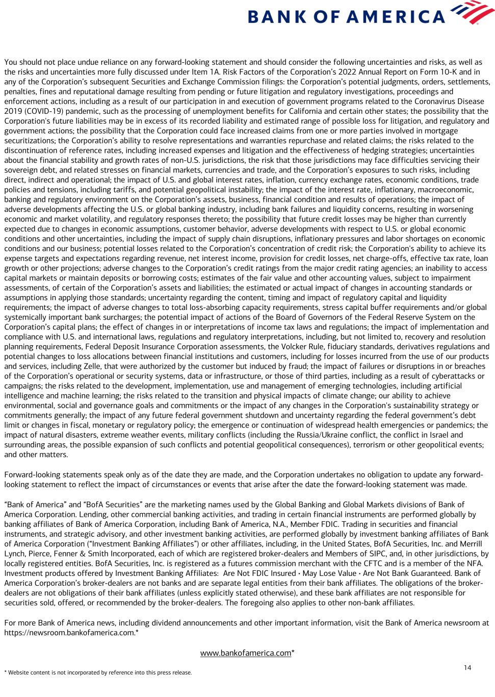 14 You should not place undue reliance on any forward-looking statement and should consider the following uncertainties and risks, as well as the risks and uncertainties more fully discussed under Item 1A. Risk Factors of the Corporation’s 2022 Annual Report on Form 10-K and in any of the Corporation’s subsequent Securities and Exchange Commission filings: the Corporation’s potential judgments, orders, settlements, penalties, fines and reputational damage resulting from pending or future litigation and regulatory investigations, proceedings and enforcement actions, including as a result of our participation in and execution of government programs related to the Coronavirus Disease 2019 (COVID-19) pandemic, such as the processing of unemployment benefits for California and certain other states; the possibility that the Corporation's future liabilities may be in excess of its recorded liability and estimated range of possible loss for litigation, and regulatory and government actions; the possibility that the Corporation could face increased claims from one or more parties involved in mortgage securitizations; the Corporation’s ability to resolve representations and warranties repurchase and related claims; the risks related to the discontinuation of reference rates, including increased expenses and litigation and the effectiveness of hedging strategies; uncertainties about the financial stability and growth rates of non-U.S. jurisdictions, the risk that those jurisdictions may face difficulties servicing their sovereign debt, and related stresses on financial markets, currencies and trade, and the Corporation’s exposures to such risks, including direct, indirect and operational; the impact of U.S. and global interest rates, inflation, currency exchange rates, economic conditions, trade policies and tensions, including tariffs, and potential geopolitical instability; the impact of the interest rate, inflationary, macroeconomic, banking and regulatory environment on the Corporation’s assets, business, financial condition and results of operations; the impact of adverse developments affecting the U.S. or global banking industry, including bank failures and liquidity concerns, resulting in worsening economic and market volatility, and regulatory responses thereto; the possibility that future credit losses may be higher than currently expected due to changes in economic assumptions, customer behavior, adverse developments with respect to U.S. or global economic conditions and other uncertainties, including the impact of supply chain disruptions, inflationary pressures and labor shortages on economic conditions and our business; potential losses related to the Corporation’s concentration of credit risk; the Corporation's ability to achieve its expense targets and expectations regarding revenue, net interest income, provision for credit losses, net charge-offs, effective tax rate, loan growth or other projections; adverse changes to the Corporation’s credit ratings from the major credit rating agencies; an inability to access capital markets or maintain deposits or borrowing costs; estimates of the fair value and other accounting values, subject to impairment assessments, of certain of the Corporation’s assets and liabilities; the estimated or actual impact of changes in accounting standards or assumptions in applying those standards; uncertainty regarding the content, timing and impact of regulatory capital and liquidity requirements; the impact of adverse changes to total loss-absorbing capacity requirements, stress capital buffer requirements and/or global systemically important bank surcharges; the potential impact of actions of the Board of Governors of the Federal Reserve System on the Corporation’s capital plans; the effect of changes in or interpretations of income tax laws and regulations; the impact of implementation and compliance with U.S. and international laws, regulations and regulatory interpretations, including, but not limited to, recovery and resolution planning requirements, Federal Deposit Insurance Corporation assessments, the Volcker Rule, fiduciary standards, derivatives regulations and potential changes to loss allocations between financial institutions and customers, including for losses incurred from the use of our products and services, including Zelle, that were authorized by the customer but induced by fraud; the impact of failures or disruptions in or breaches of the Corporation’s operational or security systems, data or infrastructure, or those of third parties, including as a result of cyberattacks or campaigns; the risks related to the development, implementation, use and management of emerging technologies, including artificial intelligence and machine learning; the risks related to the transition and physical impacts of climate change; our ability to achieve environmental, social and governance goals and commitments or the impact of any changes in the Corporation's sustainability strategy or commitments generally; the impact of any future federal government shutdown and uncertainty regarding the federal government’s debt limit or changes in fiscal, monetary or regulatory policy; the emergence or continuation of widespread health emergencies or pandemics; the impact of natural disasters, extreme weather events, military conflicts (including the Russia/Ukraine conflict, the conflict in Israel and surrounding areas, the possible expansion of such conflicts and potential geopolitical consequences), terrorism or other geopolitical events; and other matters. Forward-looking statements speak only as of the date they are made, and the Corporation undertakes no obligation to update any forward- looking statement to reflect the impact of circumstances or events that arise after the date the forward-looking statement was made. “Bank of America” and “BofA Securities” are the marketing names used by the Global Banking and Global Markets divi