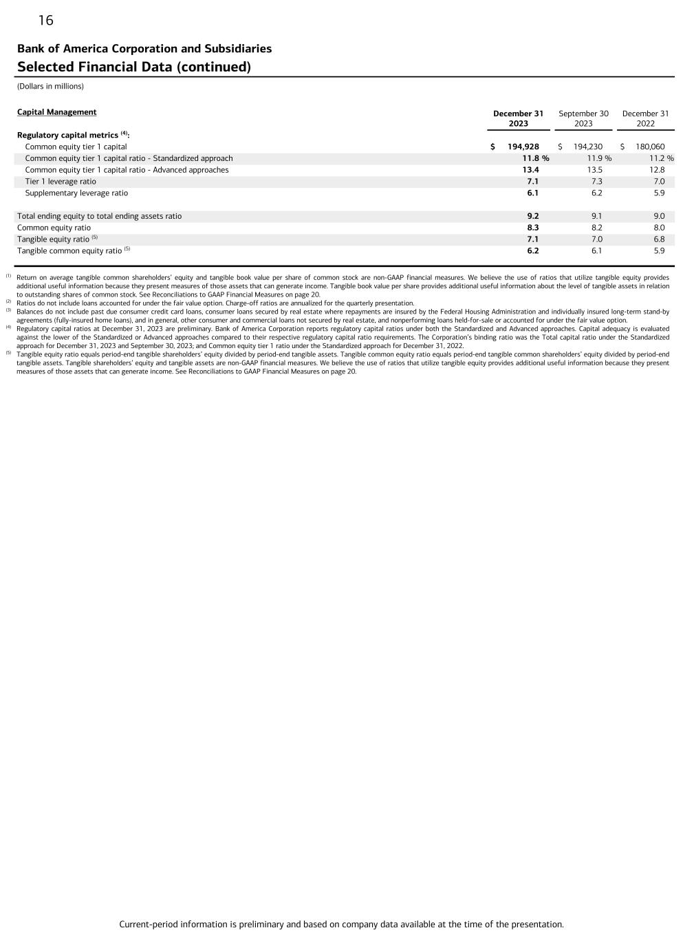 Current-period information is preliminary and based on company data available at the time of the presentation. 16 Bank of America Corporation and Subsidiaries Selected Financial Data (continued) (Dollars in millions) Capital Management December 31 2023 September 30 2023 December 31 2022 Regulatory capital metrics (4): Common equity tier 1 capital $ 194,928 $ 194,230 $ 180,060 Common equity tier 1 capital ratio - Standardized approach 11.8 % 11.9 % 11.2 % Common equity tier 1 capital ratio - Advanced approaches 13.4 13.5 12.8 Tier 1 leverage ratio 7.1 7.3 7.0 Supplementary leverage ratio 6.1 6.2 5.9 Total ending equity to total ending assets ratio 9.2 9.1 9.0 Common equity ratio 8.3 8.2 8.0 Tangible equity ratio (5) 7.1 7.0 6.8 Tangible common equity ratio (5) 6.2 6.1 5.9 (1) Return on average tangible common shareholders’ equity and tangible book value per share of common stock are non-GAAP financial measures. We believe the use of ratios that utilize tangible equity provides additional useful information because they present measures of those assets that can generate income. Tangible book value per share provides additional useful information about the level of tangible assets in relation to outstanding shares of common stock. See Reconciliations to GAAP Financial Measures on page 20. (2) Ratios do not include loans accounted for under the fair value option. Charge-off ratios are annualized for the quarterly presentation. (3) Balances do not include past due consumer credit card loans, consumer loans secured by real estate where repayments are insured by the Federal Housing Administration and individually insured long-term stand-by agreements (fully-insured home loans), and in general, other consumer and commercial loans not secured by real estate, and nonperforming loans held-for-sale or accounted for under the fair value option. (4) Regulatory capital ratios at December 31, 2023 are preliminary. Bank of America Corporation reports regulatory capital ratios under both the Standardized and Advanced approaches. Capital adequacy is evaluated against the lower of the Standardized or Advanced approaches compared to their respective regulatory capital ratio requirements. The Corporation’s binding ratio was the Total capital ratio under the Standardized approach for December 31, 2023 and September 30, 2023; and Common equity tier 1 ratio under the Standardized approach for December 31, 2022. (5) Tangible equity ratio equals period-end tangible shareholders’ equity divided by period-end tangible assets. Tangible common equity ratio equals period-end tangible common shareholders’ equity divided by period-end tangible assets. Tangible shareholders’ equity and tangible assets are non-GAAP financial measures. We believe the use of ratios that utilize tangible equity provides additional useful information because they present measures of those assets that can generate income. See Reconciliations to GAAP Financial Measures on page 20.