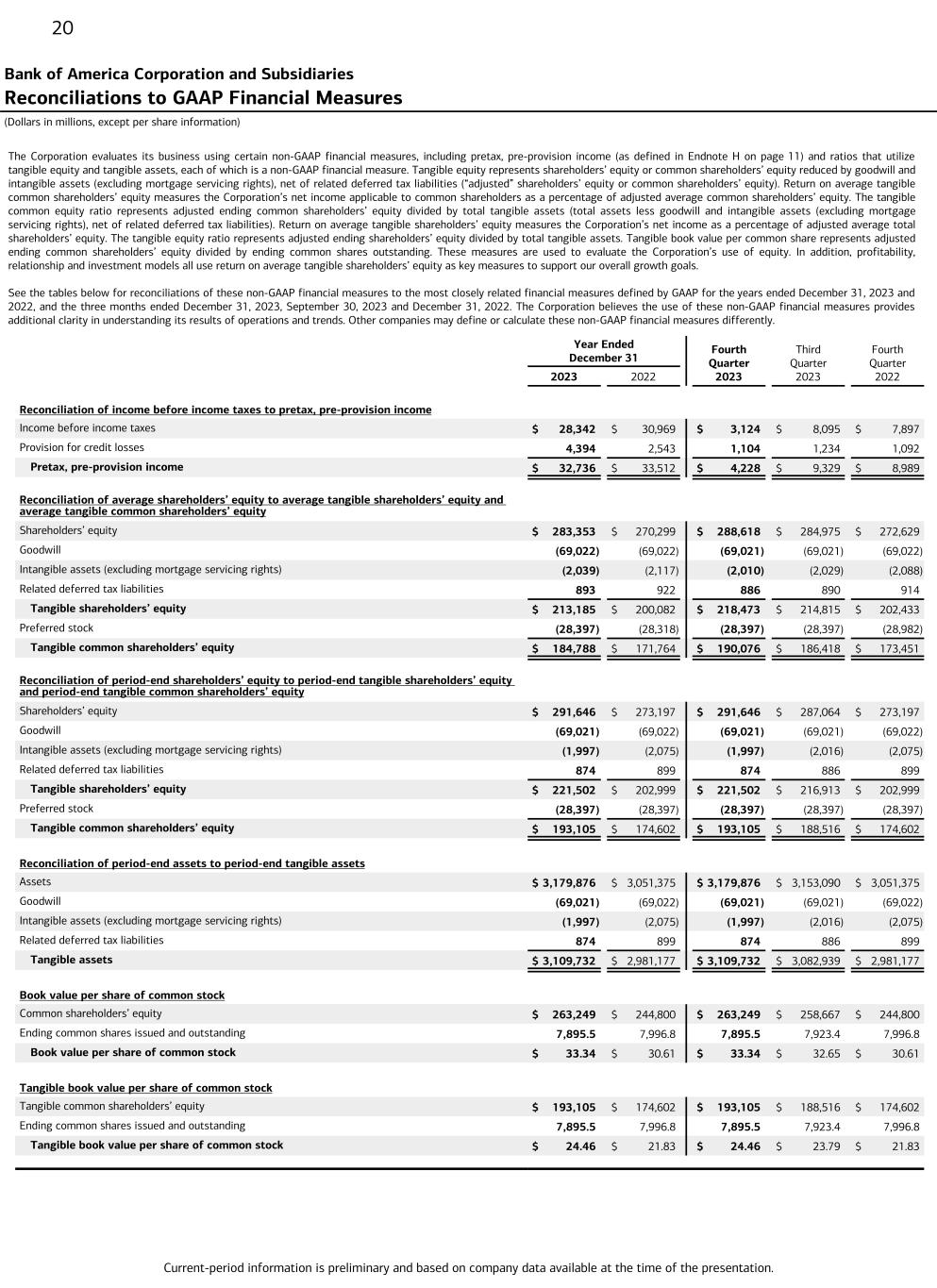Current-period information is preliminary and based on company data available at the time of the presentation. 20 The Corporation evaluates its business using certain non-GAAP financial measures, including pretax, pre-provision income (as defined in Endnote H on page 11) and ratios that utilize tangible equity and tangible assets, each of which is a non-GAAP financial measure. Tangible equity represents shareholders’ equity or common shareholders’ equity reduced by goodwill and intangible assets (excluding mortgage servicing rights), net of related deferred tax liabilities (“adjusted” shareholders’ equity or common shareholders’ equity). Return on average tangible common shareholders’ equity measures the Corporation’s net income applicable to common shareholders as a percentage of adjusted average common shareholders’ equity. The tangible common equity ratio represents adjusted ending common shareholders’ equity divided by total tangible assets (total assets less goodwill and intangible assets (excluding mortgage servicing rights), net of related deferred tax liabilities). Return on average tangible shareholders’ equity measures the Corporation’s net income as a percentage of adjusted average total shareholders’ equity. The tangible equity ratio represents adjusted ending shareholders’ equity divided by total tangible assets. Tangible book value per common share represents adjusted ending common shareholders’ equity divided by ending common shares outstanding. These measures are used to evaluate the Corporation’s use of equity. In addition, profitability, relationship and investment models all use return on average tangible shareholders’ equity as key measures to support our overall growth goals. See the tables below for reconciliations of these non-GAAP financial measures to the most closely related financial measures defined by GAAP for the years ended December 31, 2023 and 2022, and the three months ended December 31, 2023, September 30, 2023 and December 31, 2022. The Corporation believes the use of these non-GAAP financial measures provides additional clarity in understanding its results of operations and trends. Other companies may define or calculate these non-GAAP financial measures differently. Bank of America Corporation and Subsidiaries Reconciliations to GAAP Financial Measures (Dollars in millions, except per share information) Year Ended December 31 Fourth Quarter 2023 Third Quarter 2023 Fourth Quarter 2022 2023 2022 Reconciliation of income before income taxes to pretax, pre-provision income Income before income taxes $ 28,342 $ 30,969 $ 3,124 $ 8,095 $ 7,897 Provision for credit losses 4,394 2,543 1,104 1,234 1,092 Pretax, pre-provision income $ 32,736 $ 33,512 $ 4,228 $ 9,329 $ 8,989 Reconciliation of average shareholders’ equity to average tangible shareholders’ equity and average tangible common shareholders’ equity Shareholders’ equity $ 283,353 $ 270,299 $ 288,618 $ 284,975 $ 272,629 Goodwill (69,022) (69,022) (69,021) (69,021) (69,022) Intangible assets (excluding mortgage servicing rights) (2,039) (2,117) (2,010) (2,029) (2,088) Related deferred tax liabilities 893 922 886 890 914 Tangible shareholders’ equity $ 213,185 $ 200,082 $ 218,473 $ 214,815 $ 202,433 Preferred stock (28,397) (28,318) (28,397) (28,397) (28,982) Tangible common shareholders’ equity $ 184,788 $ 171,764 $ 190,076 $ 186,418 $ 173,451 Reconciliation of period-end shareholders’ equity to period-end tangible shareholders’ equity and period-end tangible common shareholders’ equity Shareholders’ equity $ 291,646 $ 273,197 $ 291,646 $ 287,064 $ 273,197 Goodwill (69,021) (69,022) (69,021) (69,021) (69,022) Intangible assets (excluding mortgage servicing rights) (1,997) (2,075) (1,997) (2,016) (2,075) Related deferred tax liabilities 874 899 874 886 899 Tangible shareholders’ equity $ 221,502 $ 202,999 $ 221,502 $ 216,913 $ 202,999 Preferred stock (28,397) (28,397) (28,397) (28,397) (28,397) Tangible common shareholders’ equity $ 193,105 $ 174,602 $ 193,105 $ 188,516 $ 174,602 Reconciliation of period-end assets to period-end tangible assets Assets $ 3,179,876 $ 3,051,375 $ 3,179,876 $ 3,153,090 $ 3,051,375 Goodwill (69,021) (69,022) (69,021) (69,021) (69,022) Intangible assets (excluding mortgage servicing rights) (1,997) (2,075) (1,997) (2,016) (2,075) Related deferred tax liabilities 874 899 874 886 899 Tangible assets $ 3,109,732 $ 2,981,177 $ 3,109,732 $ 3,082,939 $ 2,981,177 Book value per share of common stock Common shareholders’ equity $ 263,249 $ 244,800 $ 263,249 $ 258,667 $ 244,800 Ending common shares issued and outstanding 7,895.5 7,996.8 7,895.5 7,923.4 7,996.8 Book value per share of common stock $ 33.34 $ 30.61 $ 33.34 $ 32.65 $ 30.61 Tangible book value per share of common stock Tangible common shareholders’ equity $ 193,105 $ 174,602 $ 193,105 $ 188,516 $ 174,602 Ending common shares issued and outstanding 7,895.5 7,996.8 7,895.5 7,923.4 7,996.8 Tangible book value per share of common stock $ 24.46 $ 21.83 $ 24.46 $ 23.79 $ 21.83