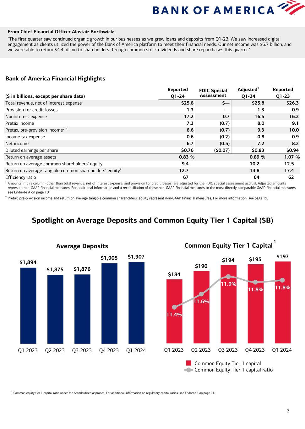 1 Q1-24 Financial Highlights3(B) Q1-24 Business Segment Highlights3,4(B) Consumer Banking Global Wealth and Investment Management Global Banking Global Markets See pages 10 and 11 for endnotes. Amounts may not total due to rounding. 1 Revenue, net of interest expense. 2 Adjusted net income, adjusted EPS, adjusted noninterest expense, adjusted ROE, and adjusted ROTCE represent non-GAAP financial measures. For more information and a reconciliation to the most directly comparable GAAP financial measures, see Endnote A on page 10. Q1-24 adjusted noninterest expense of $16.5B is calculated as reported noninterest expense of $17.2B, less the FDIC special assessment of $0.7B. 3 Financial Highlights and Business Segment Highlights are compared to the year-ago quarter unless noted. Loan and deposit balances are shown on an average basis unless noted. 4 The Corporation reports the results of operations of its four business segments and All Other on a fully taxable-equivalent (FTE) basis. 5 Represents the percentage of consumer checking accounts that are estimated to be the customer’s primary account based on multiple relationship factors (e.g., linked to their direct deposit). 6 Source: Dealogic as of March 31, 2024. 7 Preliminary as of March 31, 2024. 8 Includes repurchases to offset shares awarded under equity-based compensation plans. 9 Tangible book value per common share and return on average tangible common shareholders’ equity ratio represent non-GAAP financial measures. For more information, see page 19. • Net income of $6.7 billion, or $0.76 per diluted share, compared to $8.2 billion, or $0.94 per diluted share in Q1-23 – Adjusted net income of $7.2 billion (excluding FDIC special assessment), or adjusted diluted earnings per share of $0.832 • Revenue, net of interest expense, of $25.8 billion decreased $440 million, or 2%, including higher investment banking and asset management fees, as well as sales and trading revenue, and lower net interest income (NII) – NII decreased 3% to $14.0 billion ($14.2 billion FTE),(C) as higher deposit costs more than offset higher asset yields and modest loan growth • Provision for credit losses of $1.3 billion, up from $1.1 billion in Q4-23 and $931 million in Q1-23 – Net reserve release of $179 million vs. $88 million in Q4-23 and net reserve build of $124 million in Q1-23(D) – Net charge-offs of $1.5 billion increased from $1.2 billion in Q4-23 and $807 million in Q1-23 • Noninterest expense of $17.2 billion increased $1.0 billion, or 6% – Excluding FDIC special assessment, adjusted noninterest expense of $16.5 billion increased approximately $300 million, or 2%2 • Average deposit balances of $1.91 trillion increased $14 billion vs. Q1-23 • End of period deposit balances increased $23 billion to $1.95 trillion vs. Q4-23 • Average loans and leases of $1.05 trillion were up 1% vs. Q1-23 • Average Global Liquidity Sources of $909 billion(E) • Common equity tier 1 (CET1) capital of $197 billion increased $2 billion from Q4-23 • CET1 ratio of 11.8% (Standardized);(F) 184 bps above regulatory minimum • Returned $4.4 billion to shareholders through common stock dividends and share repurchases8 • Book value per common share rose 7% to $33.71; tangible book value per common share rose 9% to $24.799 • Return on average common shareholders' equity (ROE) ratio of 9.4%; return on average tangible common shareholders' equity (ROTCE) ratio of 12.7%;9 adjusted ROE of 10.2%2 and adjusted ROTCE of 13.8%2 • Net income of $1.7 billion • Sales and trading revenue up less than 1% to $5.1 billion, including net debit valuation adjustment (DVA) losses of $85 million; Fixed Income, Currencies and Commodities (FICC) revenue down 6% to $3.2 billion, and Equities revenue up 14% to $1.9 billion • Excluding net DVA,(G) sales and trading revenue up 2% to $5.2 billion; FICC revenue down 4% to $3.3 billion, and Equities revenue up 15% to $1.9 billion • Zero days of trading losses in Q1-24 From Chair and CEO Brian Moynihan: “We reported a strong quarter as our businesses performed well, adding clients and deepening relationships. We reached 36.9 million consumer checking accounts, with 21 consecutive quarters of net checking account growth. Our Wealth Management team generated record revenue, with record client balances, and investment banking rebounded. Bank of America’s sales and trading businesses continued their strong 2023 momentum this quarter, reporting the best first quarter in over a decade. Continued strong earnings and strong expense management both position our company to continue to drive our market leading positions across our businesses.” • Net income of $1.0 billion • Record revenue of $5.6 billion increased 5% • Client balances of nearly $4 trillion, up 13%, driven by higher market valuations and positive net client flows • AUM flows of $25 billion in Q1-24 • Client Activity – Added over 7,300 net new relationships across Merrill and Private Bank – AUM balances of $1.7 trillion, up $263 billion – 76% of Merrill eligible accounts opened digitally • Net income of $2.0 billion • Total investment banking fees (excl. self-led) of $1.6 billion, up 35% • No. 3 in investment banking fees6 • Client Activity – Average deposits of $526 billion increased $33 billion, or 7% – Added 25% more Global Commercial Banking new clients vs. Q1-237 • Net income of $2.7 billion • Revenue of $10.2 billion, down 5% • Average deposits of $952 billion, down 7%; 32% above pre-pandemic levels • Average loans and leases of $313 billion increased $9 billion, or 3% • Combined credit / debit card spend of $219 billion, up 5% • Client Activity – Added ~245,000 net new consumer checking accounts in Q1-24; 21st consecutive quarter of growth – Record 36.9 million consumer checking accounts with 92% being primary5 – Small Business checking accounts of 3.9 million, up 2% – Record consumer investment assets 