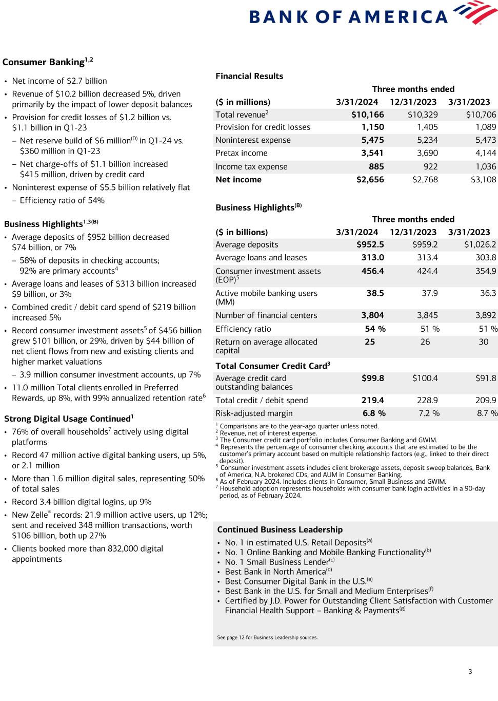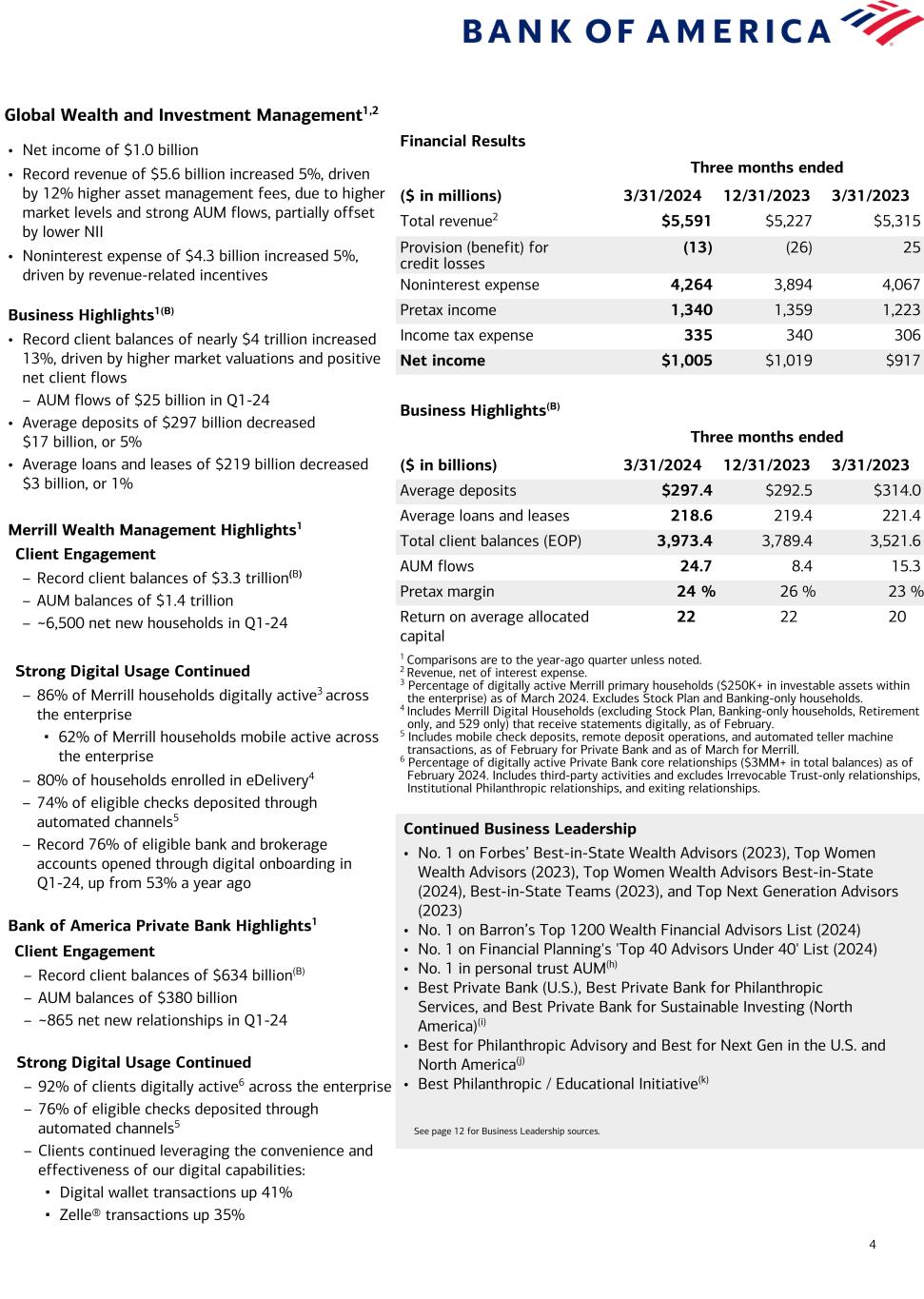 3 Consumer Banking1,2 Financial Results Three months ended ($ in millions) 3/31/2024 12/31/2023 3/31/2023 Total revenue2 $10,166 $10,329 $10,706 Provision for credit losses 1,150 1,405 1,089 Noninterest expense 5,475 5,234 5,473 Pretax income 3,541 3,690 4,144 Income tax expense 885 922 1,036 Net income $2,656 $2,768 $3,108 Business Highlights(B) Three months ended ($ in billions) 3/31/2024 12/31/2023 3/31/2023 Average deposits $952.5 $959.2 $1,026.2 Average loans and leases 313.0 313.4 303.8 Consumer investment assets (EOP)5 456.4 424.4 354.9 Active mobile banking users (MM) 38.5 37.9 36.3 Number of financial centers 3,804 3,845 3,892 Efficiency ratio 54 % 51 % 51 % Return on average allocated capital 25 26 30 Total Consumer Credit Card3 Average credit card outstanding balances $99.8 $100.4 $91.8 Total credit / debit spend 219.4 228.9 209.9 Risk-adjusted margin 6.8 % 7.2 % 8.7 % 1 Comparisons are to the year-ago quarter unless noted. 2 Revenue, net of interest expense. 3 The Consumer credit card portfolio includes Consumer Banking and GWIM. 4 Represents the percentage of consumer checking accounts that are estimated to be the customer’s primary account based on multiple relationship factors (e.g., linked to their direct deposit). 5 Consumer investment assets includes client brokerage assets, deposit sweep balances, Bank of America, N.A. brokered CDs, and AUM in Consumer Banking. 6 As of February 2024. Includes clients in Consumer, Small Business and GWIM. 7 Household adoption represents households with consumer bank login activities in a 90-day period, as of February 2024. • Net income of $2.7 billion • Revenue of $10.2 billion decreased 5%, driven primarily by the impact of lower deposit balances • Provision for credit losses of $1.2 billion vs. $1.1 billion in Q1-23 – Net reserve build of $6 million(D) in Q1-24 vs. $360 million in Q1-23 – Net charge-offs of $1.1 billion increased $415 million, driven by credit card • Noninterest expense of $5.5 billion relatively flat – Efficiency ratio of 54% Business Highlights1,3(B) • Average deposits of $952 billion decreased $74 billion, or 7% – 58% of deposits in checking accounts; 92% are primary accounts4 • Average loans and leases of $313 billion increased $9 billion, or 3% • Combined credit / debit card spend of $219 billion increased 5% • Record consumer investment assets5 of $456 billion grew $101 billion, or 29%, driven by $44 billion of net client flows from new and existing clients and higher market valuations – 3.9 million consumer investment accounts, up 7% • 11.0 million Total clients enrolled in Preferred Rewards, up 8%, with 99% annualized retention rate6 Strong Digital Usage Continued1 • 76% of overall households7 actively using digital platforms • Record 47 million active digital banking users, up 5%, or 2.1 million • More than 1.6 million digital sales, representing 50% of total sales • Record 3.4 billion digital logins, up 9% • New Zelle® records: 21.9 million active users, up 12%; sent and received 348 million transactions, worth $106 billion, both up 27% • Clients booked more than 832,000 digital appointments Continued Business Leadership • No. 1 in estimated U.S. Retail Deposits(a) • No. 1 Online Banking and Mobile Banking Functionality(b) • No. 1 Small Business Lender(c) • Best Bank in North America(d) • Best Consumer Digital Bank in the U.S.(e) • Best Bank in the U.S. for Small and Medium Enterprises(f) • Certified by J.D. Power for Outstanding Client Satisfaction with Customer Financial Health Support – Banking & Payments(g) See page 12 for Business Leadership sources.
