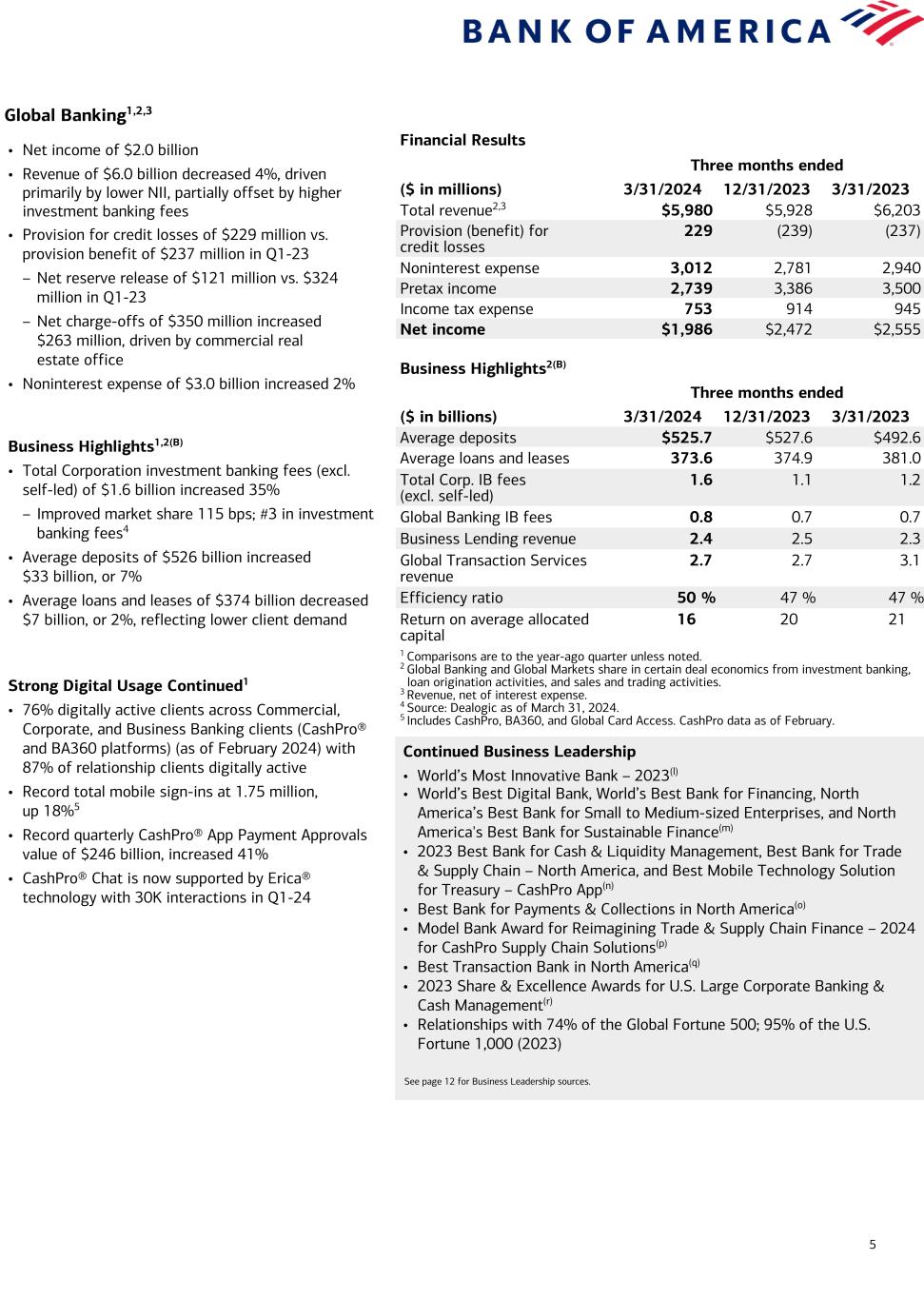 4 Global Wealth and Investment Management1,2 Financial Results Three months ended ($ in millions) 3/31/2024 12/31/2023 3/31/2023 Total revenue2 $5,591 $5,227 $5,315 Provision (benefit) for credit losses (13) (26) 25 Noninterest expense 4,264 3,894 4,067 Pretax income 1,340 1,359 1,223 Income tax expense 335 340 306 Net income $1,005 $1,019 $917 Business Highlights(B) Three months ended ($ in billions) 3/31/2024 12/31/2023 3/31/2023 Average deposits $297.4 $292.5 $314.0 Average loans and leases 218.6 219.4 221.4 Total client balances (EOP) 3,973.4 3,789.4 3,521.6 AUM flows 24.7 8.4 15.3 Pretax margin 24 % 26 % 23 % Return on average allocated capital 22 22 20 1 Comparisons are to the year-ago quarter unless noted. 2 Revenue, net of interest expense. 3 Percentage of digitally active Merrill primary households ($250K+ in investable assets within the enterprise) as of March 2024. Excludes Stock Plan and Banking-only households. 4 Includes Merrill Digital Households (excluding Stock Plan, Banking-only households, Retirement only, and 529 only) that receive statements digitally, as of February. 5 Includes mobile check deposits, remote deposit operations, and automated teller machine transactions, as of February for Private Bank and as of March for Merrill. 6 Percentage of digitally active Private Bank core relationships ($3MM+ in total balances) as of February 2024. Includes third-party activities and excludes Irrevocable Trust-only relationships, Institutional Philanthropic relationships, and exiting relationships. Continued Business Leadership • No. 1 on Forbes’ Best-in-State Wealth Advisors (2023), Top Women Wealth Advisors (2023), Top Women Wealth Advisors Best-in-State (2024), Best-in-State Teams (2023), and Top Next Generation Advisors (2023) • No. 1 on Barron’s Top 1200 Wealth Financial Advisors List (2024) • No. 1 on Financial Planning's 'Top 40 Advisors Under 40' List (2024) • No. 1 in personal trust AUM(h) • Best Private Bank (U.S.), Best Private Bank for Philanthropic Services, and Best Private Bank for Sustainable Investing (North America)(i) • Best for Philanthropic Advisory and Best for Next Gen in the U.S. and North America(j) • Best Philanthropic / Educational Initiative(k) See page 12 for Business Leadership sources. • Net income of $1.0 billion • Record revenue of $5.6 billion increased 5%, driven by 12% higher asset management fees, due to higher market levels and strong AUM flows, partially offset by lower NII • Noninterest expense of $4.3 billion increased 5%, driven by revenue-related incentives Business Highlights1(B) • Record client balances of nearly $4 trillion increased 13%, driven by higher market valuations and positive net client flows – AUM flows of $25 billion in Q1-24 • Average deposits of $297 billion decreased $17 billion, or 5% • Average loans and leases of $219 billion decreased $3 billion, or 1% Merrill Wealth Management Highlights1 Client Engagement – Record client balances of $3.3 trillion(B) – AUM balances of $1.4 trillion – ~6,500 net new households in Q1-24 Strong Digital Usage Continued – 86% of Merrill households digitally active3 across the enterprise ▪ 62% of Merrill households mobile active across the enterprise – 80% of households enrolled in eDelivery4 – 74% of eligible checks deposited through automated channels5 – Record 76% of eligible bank and brokerage accounts opened through digital onboarding in Q1-24, up from 53% a year ago Client Engagement – Record client balances of $634 billion(B) – AUM balances of $380 billion – ~865 net new relationships in Q1-24 Bank of America Private Bank Highlights1 Strong Digital Usage Continued – 92% of clients digitally active6 across the enterprise – 76% of eligible checks deposited through automated channels5 – Clients continued leveraging the convenience and effectiveness of our digital capabilities: ▪ Digital wallet transactions up 41% ▪ Zelle® transactions up 35%