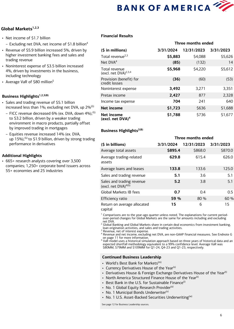 6 Global Markets1,2,3 Financial Results Three months ended ($ in millions) 3/31/2024 12/31/2023 3/31/2023 Total revenue2,3 $5,883 $4,088 $5,626 Net DVA4 (85) (132) 14 Total revenue (excl. net DVA)2,3,4 $5,968 $4,220 $5,612 Provision (benefit) for credit losses (36) (60) (53) Noninterest expense 3,492 3,271 3,351 Pretax income 2,427 877 2,328 Income tax expense 704 241 640 Net income $1,723 $636 $1,688 Net income (excl. net DVA)4 $1,788 $736 $1,677 Business Highlights2(B) Three months ended ($ in billions) 3/31/2024 12/31/2023 3/31/2023 Average total assets $895.4 $868.0 $870.0 Average trading-related assets 629.8 615.4 626.0 Average loans and leases 133.8 133.6 125.0 Sales and trading revenue 5.1 3.6 5.1 Sales and trading revenue (excl. net DVA)4(G) 5.2 3.8 5.1 Global Markets IB fees 0.7 0.4 0.5 Efficiency ratio 59 % 80 % 60 % Return on average allocated capital 15 6 15 1 Comparisons are to the year-ago quarter unless noted. The explanations for current period- over-period changes for Global Markets are the same for amounts including and excluding net DVA. 2 Global Banking and Global Markets share in certain deal economics from investment banking, loan origination activities, and sales and trading activities. 3 Revenue, net of interest expense. 4 Revenue and net income, excluding net DVA, are non-GAAP financial measures. See Endnote G on page 11 for more information. 5 VaR model uses a historical simulation approach based on three years of historical data and an expected shortfall methodology equivalent to a 99% confidence level. Average VaR was $80MM, $79MM and $109MM for Q1-24, Q4-23 and Q1-23, respectively. • Net income of $1.7 billion – Excluding net DVA, net income of $1.8 billion4 • Revenue of $5.9 billion increased 5%, driven by higher investment banking fees and sales and trading revenue • Noninterest expense of $3.5 billion increased 4%, driven by investments in the business, including technology • Average VaR of $80 million5 Business Highlights1,2,3(B) • Sales and trading revenue of $5.1 billion increased less than 1%; excluding net DVA, up 2%(G) – FICC revenue decreased 6% (ex. DVA, down 4%),(G) to $3.2 billion, driven by a weaker trading environment in macro products, partially offset by improved trading in mortgages – Equities revenue increased 14% (ex. DVA, up 15%),(G) to $1.9 billion, driven by strong trading performance in derivatives Additional Highlights • 665+ research analysts covering over 3,500 companies; 1,250+ corporate bond issuers across 55+ economies and 25 industries Continued Business Leadership • World's Best Bank for Markets(m) • Currency Derivatives House of the Year(s) • Derivatives House & Foreign Exchange Derivatives House of the Year(t) • North America Structured Finance House of the Year(t) • Best Bank in the U.S. for Sustainable Finance(i) • No. 1 Global Equity Research Provider(u) • No. 1 Municipal Bonds Underwriter(v) • No. 1 U.S. Asset-Backed Securities Underwriting(w) See page 12 for Business Leadership sources.