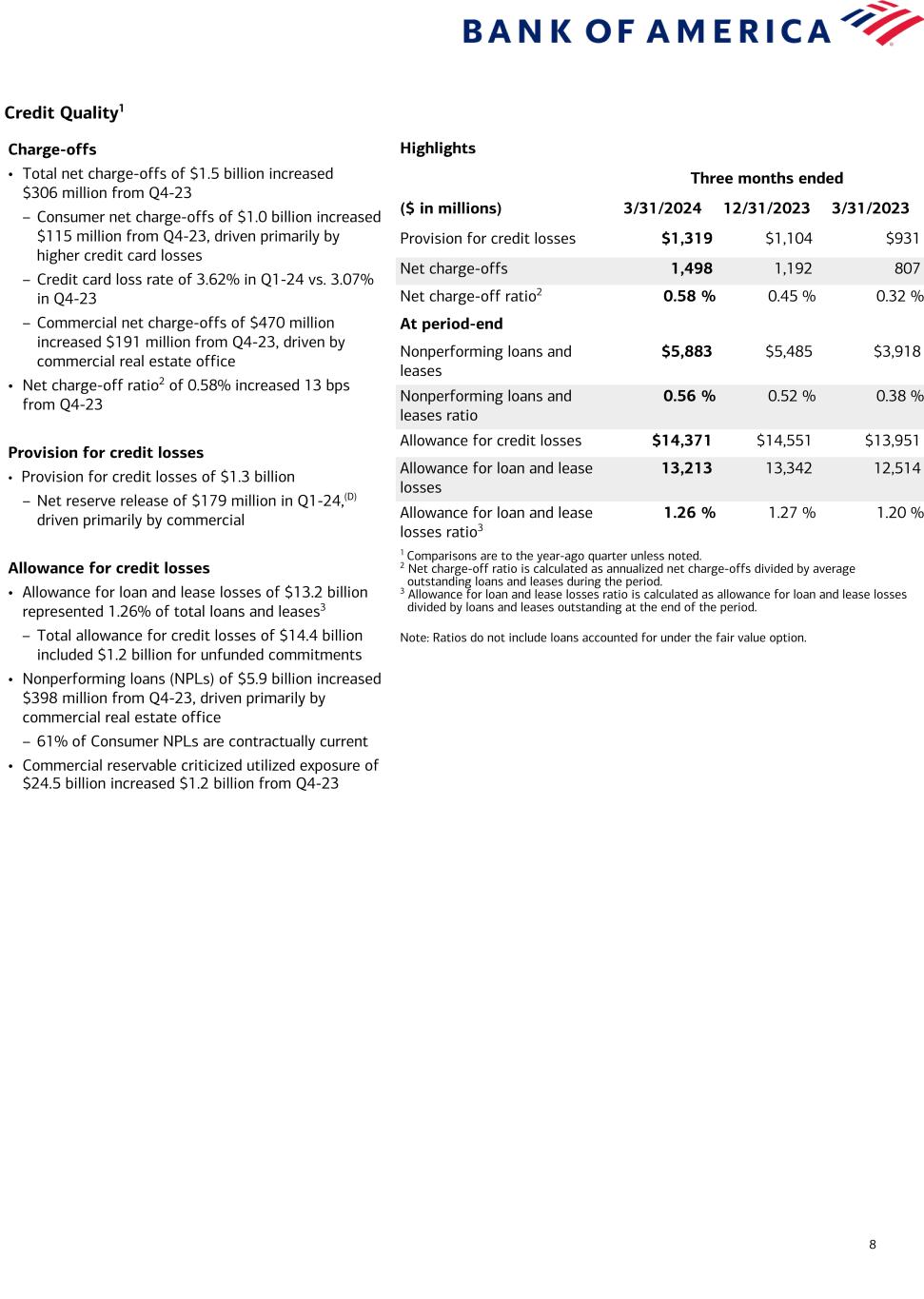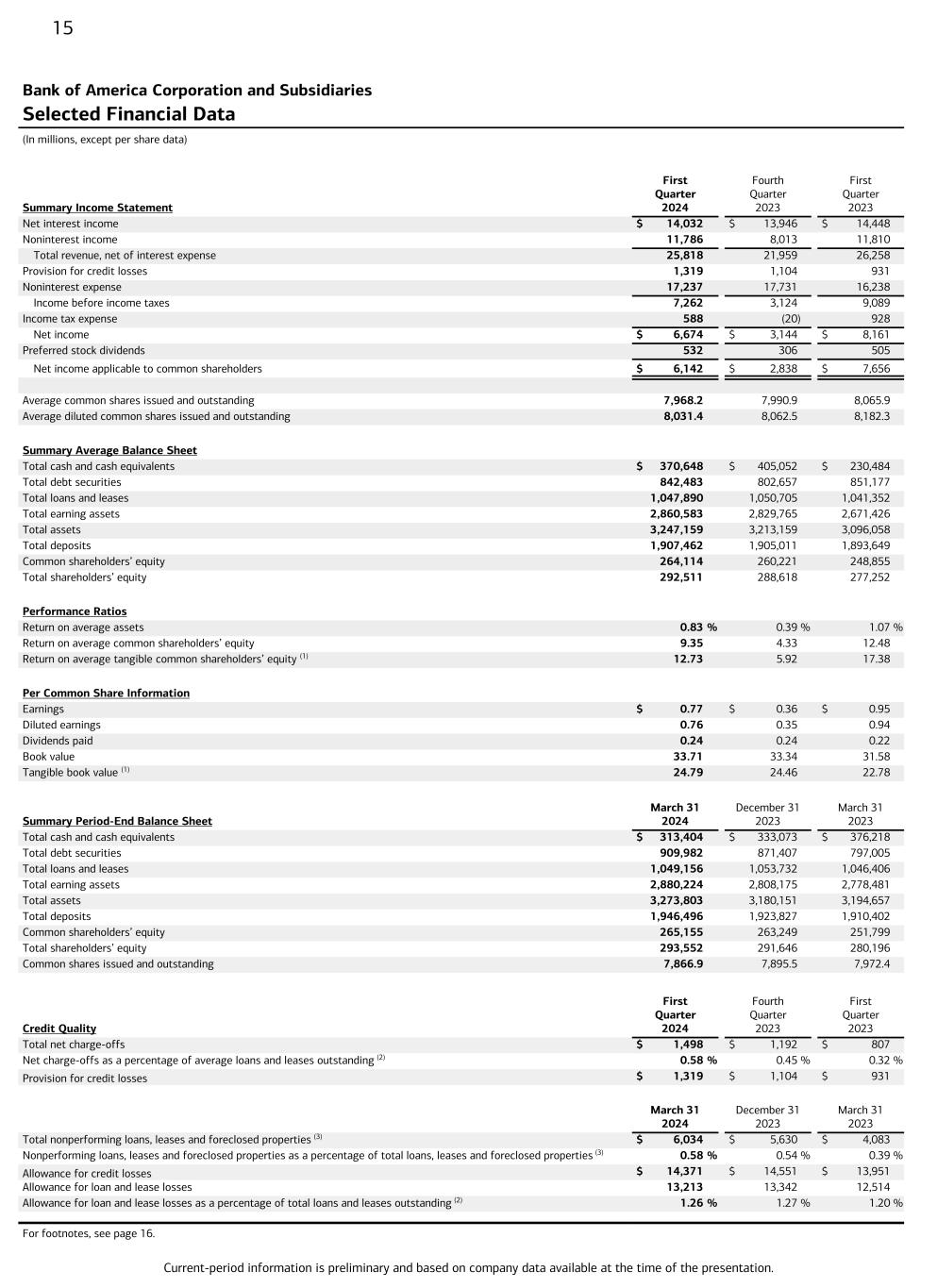 Current-period information is preliminary and based on company data available at the time of the presentation. 15 Bank of America Corporation and Subsidiaries Selected Financial Data (In millions, except per share data) First Quarter 2024 Fourth Quarter 2023 First Quarter 2023Summary Income Statement Net interest income $ 14,032 $ 13,946 $ 14,448 Noninterest income 11,786 8,013 11,810 Total revenue, net of interest expense 25,818 21,959 26,258 Provision for credit losses 1,319 1,104 931 Noninterest expense 17,237 17,731 16,238 Income before income taxes 7,262 3,124 9,089 Income tax expense 588 (20) 928 Net income $ 6,674 $ 3,144 $ 8,161 Preferred stock dividends 532 306 505 Net income applicable to common shareholders $ 6,142 $ 2,838 $ 7,656 Average common shares issued and outstanding 7,968.2 7,990.9 8,065.9 Average diluted common shares issued and outstanding 8,031.4 8,062.5 8,182.3 Summary Average Balance Sheet Total cash and cash equivalents $ 370,648 $ 405,052 $ 230,484 Total debt securities 842,483 802,657 851,177 Total loans and leases 1,047,890 1,050,705 1,041,352 Total earning assets 2,860,583 2,829,765 2,671,426 Total assets 3,247,159 3,213,159 3,096,058 Total deposits 1,907,462 1,905,011 1,893,649 Common shareholders’ equity 264,114 260,221 248,855 Total shareholders’ equity 292,511 288,618 277,252 Performance Ratios Return on average assets 0.83 % 0.39 % 1.07 % Return on average common shareholders’ equity 9.35 4.33 12.48 Return on average tangible common shareholders’ equity (1) 12.73 5.92 17.38 Per Common Share Information Earnings $ 0.77 $ 0.36 $ 0.95 Diluted earnings 0.76 0.35 0.94 Dividends paid 0.24 0.24 0.22 Book value 33.71 33.34 31.58 Tangible book value (1) 24.79 24.46 22.78 Summary Period-End Balance Sheet March 31 2024 December 31 2023 March 31 2023 Total cash and cash equivalents $ 313,404 $ 333,073 $ 376,218 Total debt securities 909,982 871,407 797,005 Total loans and leases 1,049,156 1,053,732 1,046,406 Total earning assets 2,880,224 2,808,175 2,778,481 Total assets 3,273,803 3,180,151 3,194,657 Total deposits 1,946,496 1,923,827 1,910,402 Common shareholders’ equity 265,155 263,249 251,799 Total shareholders’ equity 293,552 291,646 280,196 Common shares issued and outstanding 7,866.9 7,895.5 7,972.4 First Quarter 2024 Fourth Quarter 2023 First Quarter 2023Credit Quality Total net charge-offs $ 1,498 $ 1,192 $ 807 Net charge-offs as a percentage of average loans and leases outstanding (2) 0.58 % 0.45 % 0.32 % Provision for credit losses $ 1,319 $ 1,104 $ 931 March 31 2024 December 31 2023 March 31 2023 Total nonperforming loans, leases and foreclosed properties (3) $ 6,034 $ 5,630 $ 4,083 Nonperforming loans, leases and foreclosed properties as a percentage of total loans, leases and foreclosed properties (3) 0.58 % 0.54 % 0.39 % Allowance for credit losses $ 14,371 $ 14,551 $ 13,951 Allowance for loan and lease losses 13,213 13,342 12,514 Allowance for loan and lease losses as a percentage of total loans and leases outstanding (2) 1.26 % 1.27 % 1.20 % For footnotes, see page 16.
