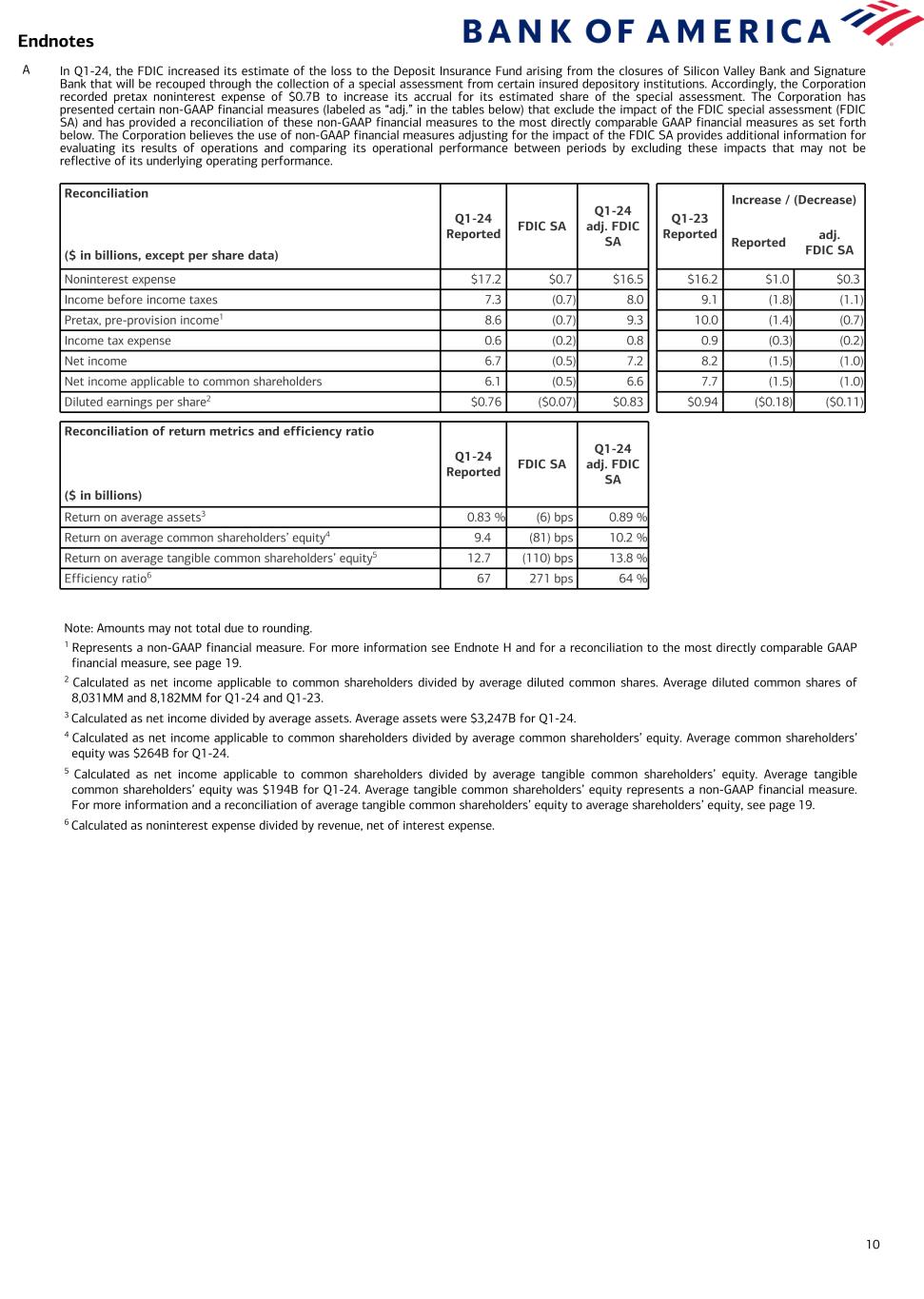 Current-period information is preliminary and based on company data available at the time of the presentation. 19 The Corporation evaluates its business using certain non-GAAP financial measures, including pretax, pre-provision income (as defined in Endnote H on page 11) and ratios that utilize tangible equity and tangible assets, each of which is a non-GAAP financial measure. Tangible equity represents shareholders’ equity or common shareholders’ equity reduced by goodwill and intangible assets (excluding mortgage servicing rights), net of related deferred tax liabilities (“adjusted” shareholders’ equity or common shareholders’ equity). Return on average tangible common shareholders’ equity measures the Corporation’s net income applicable to common shareholders as a percentage of adjusted average common shareholders’ equity. The tangible common equity ratio represents adjusted ending common shareholders’ equity divided by total tangible assets (total assets less goodwill and intangible assets (excluding mortgage servicing rights), net of related deferred tax liabilities). Return on average tangible shareholders’ equity measures the Corporation’s net income as a percentage of adjusted average total shareholders’ equity. The tangible equity ratio represents adjusted ending shareholders’ equity divided by total tangible assets. Tangible book value per common share represents adjusted ending common shareholders’ equity divided by ending common shares outstanding. These measures are used to evaluate the Corporation’s use of equity. In addition, profitability, relationship and investment models all use return on average tangible shareholders’ equity as key measures to support our overall growth goals. See the tables below for reconciliations of these non-GAAP financial measures to the most directly comparable financial measures defined by GAAP for the three months ended March 31, 2024, December 31, 2023 and March 31, 2023. The Corporation believes the use of these non-GAAP financial measures provides additional clarity in understanding its results of operations and trends. Other companies may define or calculate these non-GAAP financial measures differently. Bank of America Corporation and Subsidiaries Reconciliations to GAAP Financial Measures (Dollars in millions, except per share information) First Quarter 2024 Fourth Quarter 2023 First Quarter 2023 Reconciliation of income before income taxes to pretax, pre-provision income Income before income taxes $ 7,262 $ 3,124 $ 9,089 Provision for credit losses 1,319 1,104 931 Pretax, pre-provision income $ 8,581 $ 4,228 $ 10,020 Reconciliation of average shareholders’ equity to average tangible shareholders’ equity and average tangible common shareholders’ equity Shareholders’ equity $ 292,511 $ 288,618 $ 277,252 Goodwill (69,021) (69,021) (69,022) Intangible assets (excluding mortgage servicing rights) (1,990) (2,010) (2,068) Related deferred tax liabilities 874 886 899 Tangible shareholders’ equity $ 222,374 $ 218,473 $ 207,061 Preferred stock (28,397) (28,397) (28,397) Tangible common shareholders’ equity $ 193,977 $ 190,076 $ 178,664 Reconciliation of period-end shareholders’ equity to period-end tangible shareholders’ equity and period-end tangible common shareholders’ equity Shareholders’ equity $ 293,552 $ 291,646 $ 280,196 Goodwill (69,021) (69,021) (69,022) Intangible assets (excluding mortgage servicing rights) (1,977) (1,997) (2,055) Related deferred tax liabilities 869 874 895 Tangible shareholders’ equity $ 223,423 $ 221,502 $ 210,014 Preferred stock (28,397) (28,397) (28,397) Tangible common shareholders’ equity $ 195,026 $ 193,105 $ 181,617 Reconciliation of period-end assets to period-end tangible assets Assets $ 3,273,803 $ 3,180,151 $ 3,194,657 Goodwill (69,021) (69,021) (69,022) Intangible assets (excluding mortgage servicing rights) (1,977) (1,997) (2,055) Related deferred tax liabilities 869 874 895 Tangible assets $ 3,203,674 $ 3,110,007 $ 3,124,475 Book value per share of common stock Common shareholders’ equity $ 265,155 $ 263,249 $ 251,799 Ending common shares issued and outstanding 7,866.9 7,895.5 7,972.4 Book value per share of common stock $ 33.71 $ 33.34 $ 31.58 Tangible book value per share of common stock Tangible common shareholders’ equity $ 195,026 $ 193,105 $ 181,617 Ending common shares issued and outstanding 7,866.9 7,895.5 7,972.4 Tangible book value per share of common stock $ 24.79 $ 24.46 $ 22.78