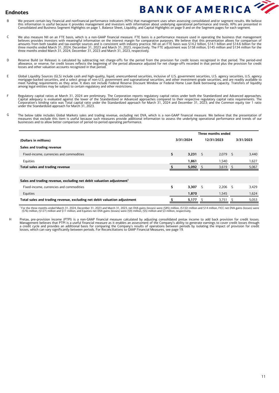 10 Endnotes A In Q1-24, the FDIC increased its estimate of the loss to the Deposit Insurance Fund arising from the closures of Silicon Valley Bank and Signature Bank that will be recouped through the collection of a special assessment from certain insured depository institutions. Accordingly, the Corporation recorded pretax noninterest expense of $0.7B to increase its accrual for its estimated share of the special assessment. The Corporation has presented certain non-GAAP financial measures (labeled as “adj.” in the tables below) that exclude the impact of the FDIC special assessment (FDIC SA) and has provided a reconciliation of these non-GAAP financial measures to the most directly comparable GAAP financial measures as set forth below. The Corporation believes the use of non-GAAP financial measures adjusting for the impact of the FDIC SA provides additional information for evaluating its results of operations and comparing its operational performance between periods by excluding these impacts that may not be reflective of its underlying operating performance. Note: Amounts may not total due to rounding. 1 Represents a non-GAAP financial measure. For more information see Endnote H and for a reconciliation to the most directly comparable GAAP financial measure, see page 19. 2 Calculated as net income applicable to common shareholders divided by average diluted common shares. Average diluted common shares of 8,031MM and 8,182MM for Q1-24 and Q1-23. 3 Calculated as net income divided by average assets. Average assets were $3,247B for Q1-24. 4 Calculated as net income applicable to common shareholders divided by average common shareholders’ equity. Average common shareholders’ equity was $264B for Q1-24. 5 Calculated as net income applicable to common shareholders divided by average tangible common shareholders’ equity. Average tangible common shareholders’ equity was $194B for Q1-24. Average tangible common shareholders’ equity represents a non-GAAP financial measure. For more information and a reconciliation of average tangible common shareholders’ equity to average shareholders’ equity, see page 19. 6 Calculated as noninterest expense divided by revenue, net of interest expense. Reconciliation Q1-24 Reported FDIC SA Q1-24 adj. FDIC SA Q1-23 Reported Increase / (Decrease) ($ in billions, except per share data) Reported adj. FDIC SA Noninterest expense $17.2 $0.7 $16.5 $16.2 $1.0 $0.3 Income before income taxes 7.3 (0.7) 8.0 9.1 (1.8) (1.1) Pretax, pre-provision income1 8.6 (0.7) 9.3 10.0 (1.4) (0.7) Income tax expense 0.6 (0.2) 0.8 0.9 (0.3) (0.2) Net income 6.7 (0.5) 7.2 8.2 (1.5) (1.0) Net income applicable to common shareholders 6.1 (0.5) 6.6 7.7 (1.5) (1.0) Diluted earnings per share2 $0.76 ($0.07) $0.83 $0.94 ($0.18) ($0.11) Reconciliation of return metrics and efficiency ratio ($ in billions) Q1-24 Reported FDIC SA Q1-24 adj. FDIC SA Return on average assets3 0.83 % (6) bps 0.89 % Return on average common shareholders’ equity4 9.4 (81) bps 10.2 % Return on average tangible common shareholders’ equity5 12.7 (110) bps 13.8 % Efficiency ratio6 67 271 bps 64 %
