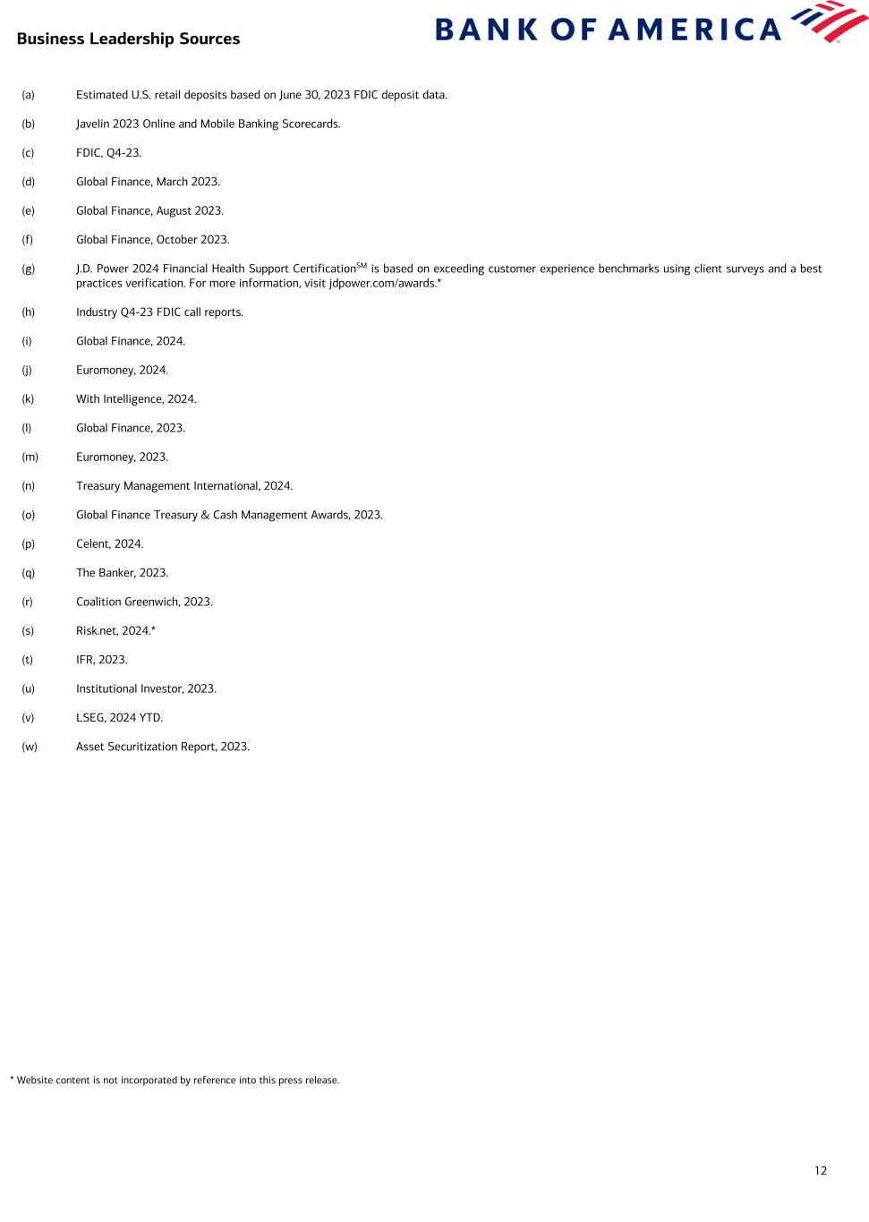 12 (a) Estimated U.S. retail deposits based on June 30, 2023 FDIC deposit data. (b) Javelin 2023 Online and Mobile Banking Scorecards. (c) FDIC, Q4-23. (d) Global Finance, March 2023. (e) Global Finance, August 2023. (f) Global Finance, October 2023. (g) J.D. Power 2024 Financial Health Support CertificationSM is based on exceeding customer experience benchmarks using client surveys and a best practices verification. For more information, visit jdpower.com/awards.* (h) Industry Q4-23 FDIC call reports. (i) Global Finance, 2024. (j) Euromoney, 2024. (k) With Intelligence, 2024. (l) Global Finance, 2023. (m) Euromoney, 2023. (n) Treasury Management International, 2024. (o) Global Finance Treasury & Cash Management Awards, 2023. (p) Celent, 2024. (q) The Banker, 2023. (r) Coalition Greenwich, 2023. (s) Risk.net, 2024.* (t) IFR, 2023. (u) Institutional Investor, 2023. (v) LSEG, 2024 YTD. (w) Asset Securitization Report, 2023. Business Leadership Sources * Website content is not incorporated by reference into this press release.