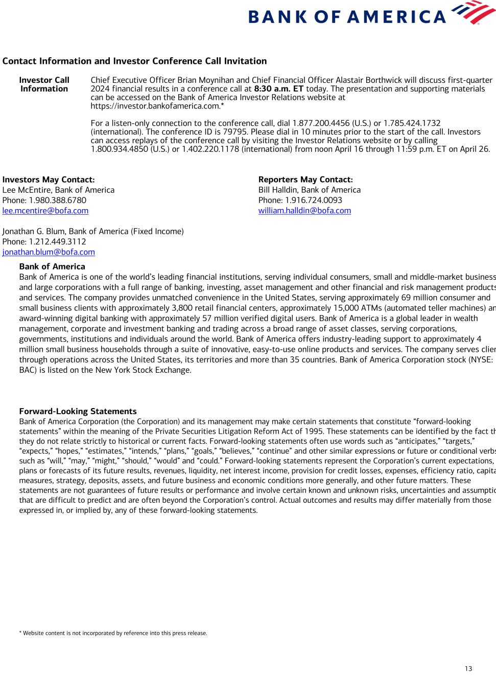 13 Contact Information and Investor Conference Call Invitation Investor Call Information Chief Executive Officer Brian Moynihan and Chief Financial Officer Alastair Borthwick will discuss first-quarter 2024 financial results in a conference call at 8:30 a.m. ET today. The presentation and supporting materials can be accessed on the Bank of America Investor Relations website at https://investor.bankofamerica.com.* For a listen-only connection to the conference call, dial 1.877.200.4456 (U.S.) or 1.785.424.1732 (international). The conference ID is 79795. Please dial in 10 minutes prior to the start of the call. Investors can access replays of the conference call by visiting the Investor Relations website or by calling 1.800.934.4850 (U.S.) or 1.402.220.1178 (international) from noon April 16 through 11:59 p.m. ET on April 26. Investors May Contact: Lee McEntire, Bank of America Phone: 1.980.388.6780 lee.mcentire@bofa.com Jonathan G. Blum, Bank of America (Fixed Income) Phone: 1.212.449.3112 jonathan.blum@bofa.com Bank of America Bank of America is one of the world’s leading financial institutions, serving individual consumers, small and middle-market businesses and large corporations with a full range of banking, investing, asset management and other financial and risk management products and services. The company provides unmatched convenience in the United States, serving approximately 69 million consumer and small business clients with approximately 3,800 retail financial centers, approximately 15,000 ATMs (automated teller machines) and award-winning digital banking with approximately 57 million verified digital users. Bank of America is a global leader in wealth management, corporate and investment banking and trading across a broad range of asset classes, serving corporations, governments, institutions and individuals around the world. Bank of America offers industry-leading support to approximately 4 million small business households through a suite of innovative, easy-to-use online products and services. The company serves clients through operations across the United States, its territories and more than 35 countries. Bank of America Corporation stock (NYSE: BAC) is listed on the New York Stock Exchange. Forward-Looking Statements Bank of America Corporation (the Corporation) and its management may make certain statements that constitute “forward-looking statements” within the meaning of the Private Securities Litigation Reform Act of 1995. These statements can be identified by the fact that they do not relate strictly to historical or current facts. Forward-looking statements often use words such as “anticipates,” “targets,” “expects,” “hopes,” “estimates,” “intends,” “plans,” “goals,” “believes,” “continue” and other similar expressions or future or conditional verbs such as “will,” “may,” “might,” “should,” “would” and “could.” Forward-looking statements represent the Corporation’s current expectations, plans or forecasts of its future results, revenues, liquidity, net interest income, provision for credit losses, expenses, efficiency ratio, capital measures, strategy, deposits, assets, and future business and economic conditions more generally, and other future matters. These statements are not guarantees of future results or performance and involve certain known and unknown risks, uncertainties and assumptions that are difficult to predict and are often beyond the Corporation’s control. Actual outcomes and results may differ materially from those expressed in, or implied by, any of these forward-looking statements. * Website content is not incorporated by reference into this press release. Reporters May Contact: Bill Halldin, Bank of America Phone: 1.916.724.0093 william.halldin@bofa.com