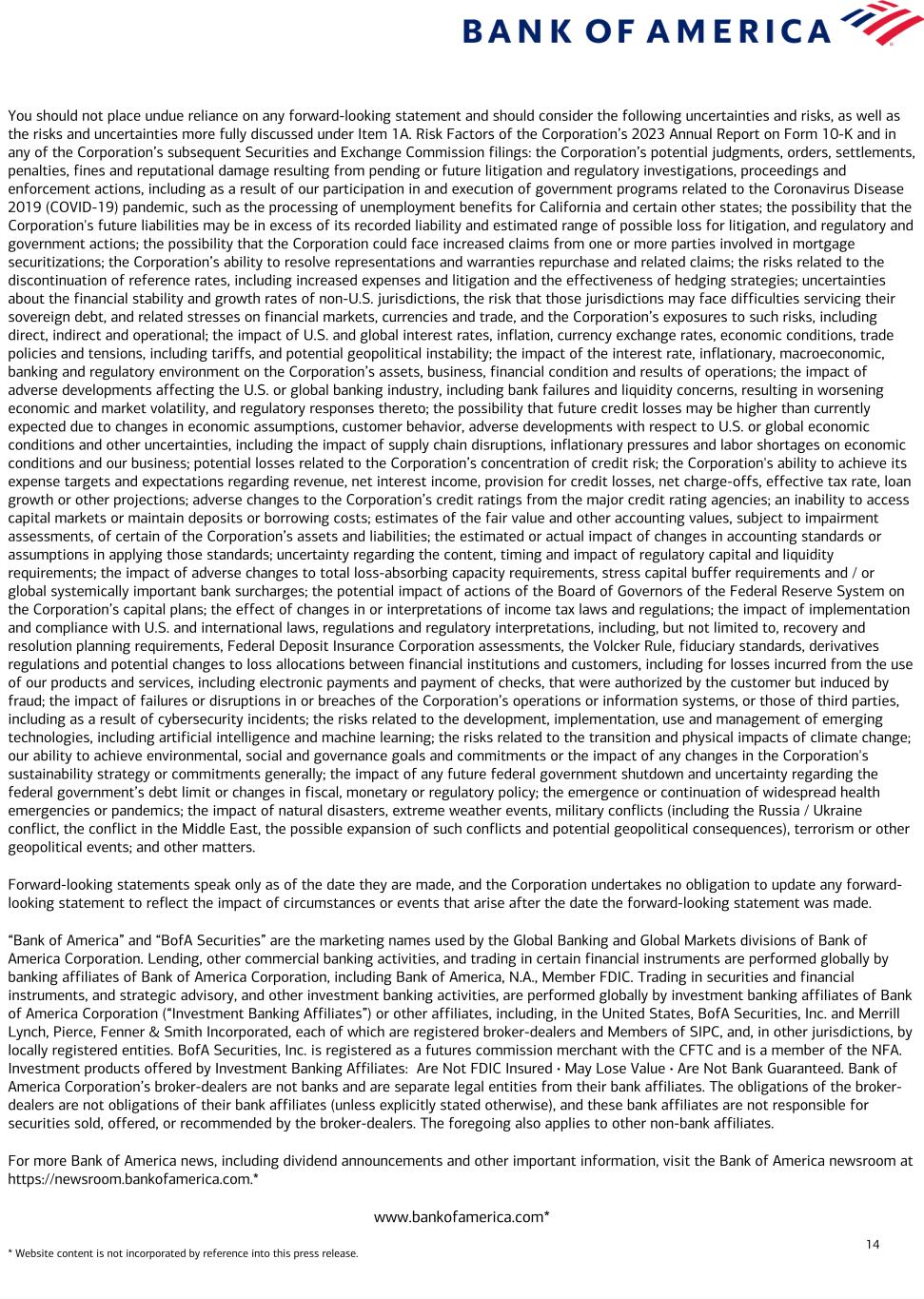 14 You should not place undue reliance on any forward-looking statement and should consider the following uncertainties and risks, as well as the risks and uncertainties more fully discussed under Item 1A. Risk Factors of the Corporation’s 2023 Annual Report on Form 10-K and in any of the Corporation’s subsequent Securities and Exchange Commission filings: the Corporation’s potential judgments, orders, settlements, penalties, fines and reputational damage resulting from pending or future litigation and regulatory investigations, proceedings and enforcement actions, including as a result of our participation in and execution of government programs related to the Coronavirus Disease 2019 (COVID-19) pandemic, such as the processing of unemployment benefits for California and certain other states; the possibility that the Corporation's future liabilities may be in excess of its recorded liability and estimated range of possible loss for litigation, and regulatory and government actions; the possibility that the Corporation could face increased claims from one or more parties involved in mortgage securitizations; the Corporation’s ability to resolve representations and warranties repurchase and related claims; the risks related to the discontinuation of reference rates, including increased expenses and litigation and the effectiveness of hedging strategies; uncertainties about the financial stability and growth rates of non-U.S. jurisdictions, the risk that those jurisdictions may face difficulties servicing their sovereign debt, and related stresses on financial markets, currencies and trade, and the Corporation’s exposures to such risks, including direct, indirect and operational; the impact of U.S. and global interest rates, inflation, currency exchange rates, economic conditions, trade policies and tensions, including tariffs, and potential geopolitical instability; the impact of the interest rate, inflationary, macroeconomic, banking and regulatory environment on the Corporation’s assets, business, financial condition and results of operations; the impact of adverse developments affecting the U.S. or global banking industry, including bank failures and liquidity concerns, resulting in worsening economic and market volatility, and regulatory responses thereto; the possibility that future credit losses may be higher than currently expected due to changes in economic assumptions, customer behavior, adverse developments with respect to U.S. or global economic conditions and other uncertainties, including the impact of supply chain disruptions, inflationary pressures and labor shortages on economic conditions and our business; potential losses related to the Corporation’s concentration of credit risk; the Corporation's ability to achieve its expense targets and expectations regarding revenue, net interest income, provision for credit losses, net charge-offs, effective tax rate, loan growth or other projections; adverse changes to the Corporation’s credit ratings from the major credit rating agencies; an inability to access capital markets or maintain deposits or borrowing costs; estimates of the fair value and other accounting values, subject to impairment assessments, of certain of the Corporation’s assets and liabilities; the estimated or actual impact of changes in accounting standards or assumptions in applying those standards; uncertainty regarding the content, timing and impact of regulatory capital and liquidity requirements; the impact of adverse changes to total loss-absorbing capacity requirements, stress capital buffer requirements and / or global systemically important bank surcharges; the potential impact of actions of the Board of Governors of the Federal Reserve System on the Corporation’s capital plans; the effect of changes in or interpretations of income tax laws and regulations; the impact of implementation and compliance with U.S. and international laws, regulations and regulatory interpretations, including, but not limited to, recovery and resolution planning requirements, Federal Deposit Insurance Corporation assessments, the Volcker Rule, fiduciary standards, derivatives regulations and potential changes to loss allocations between financial institutions and customers, including for losses incurred from the use of our products and services, including electronic payments and payment of checks, that were authorized by the customer but induced by fraud; the impact of failures or disruptions in or breaches of the Corporation’s operations or information systems, or those of third parties, including as a result of cybersecurity incidents; the risks related to the development, implementation, use and management of emerging technologies, including artificial intelligence and machine learning; the risks related to the transition and physical impacts of climate change; our ability to achieve environmental, social and governance goals and commitments or the impact of any changes in the Corporation's sustainability strategy or commitments generally; the impact of any future federal government shutdown and uncertainty regarding the federal government’s debt limit or changes in fiscal, monetary or regulatory policy; the emergence or continuation of widespread health emergencies or pandemics; the impact of natural disasters, extreme weather events, military conflicts (including the Russia / Ukraine conflict, the conflict in the Middle East, the possible expansion of such conflicts and potential geopolitical consequences), terrorism or other geopolitical events; and other matters. Forward-looking statements speak only as of the date they are made, and the Corporation undertakes no obligation to update any forward- looking statement to reflect the impact of circumstances or events that arise after the date the forward-looking statement was made. “Bank of America” and “BofA Securities” are the marketing names used by the Global Banking and Global Markets d