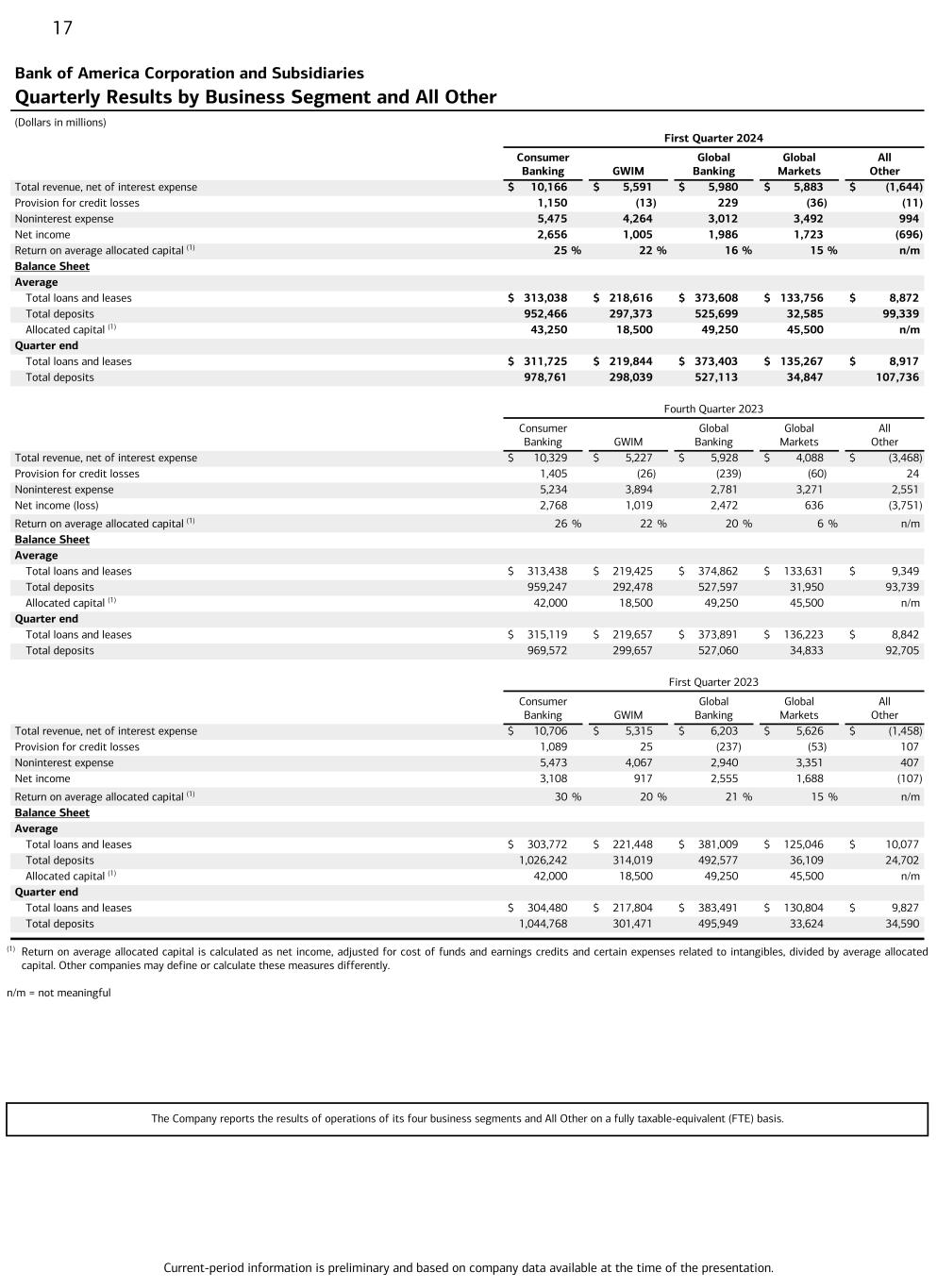 Current-period information is preliminary and based on company data available at the time of the presentation. 17 Bank of America Corporation and Subsidiaries Quarterly Results by Business Segment and All Other (Dollars in millions) First Quarter 2024 Consumer Banking GWIM Global Banking Global Markets All Other Total revenue, net of interest expense $ 10,166 $ 5,591 $ 5,980 $ 5,883 $ (1,644) Provision for credit losses 1,150 (13) 229 (36) (11) Noninterest expense 5,475 4,264 3,012 3,492 994 Net income 2,656 1,005 1,986 1,723 (696) Return on average allocated capital (1) 25 % 22 % 16 % 15 % n/m Balance Sheet Average Total loans and leases $ 313,038 $ 218,616 $ 373,608 $ 133,756 $ 8,872 Total deposits 952,466 297,373 525,699 32,585 99,339 Allocated capital (1) 43,250 18,500 49,250 45,500 n/m Quarter end Total loans and leases $ 311,725 $ 219,844 $ 373,403 $ 135,267 $ 8,917 Total deposits 978,761 298,039 527,113 34,847 107,736 Fourth Quarter 2023 Consumer Banking GWIM Global Banking Global Markets All Other Total revenue, net of interest expense $ 10,329 $ 5,227 $ 5,928 $ 4,088 $ (3,468) Provision for credit losses 1,405 (26) (239) (60) 24 Noninterest expense 5,234 3,894 2,781 3,271 2,551 Net income (loss) 2,768 1,019 2,472 636 (3,751) Return on average allocated capital (1) 26 % 22 % 20 % 6 % n/m Balance Sheet Average Total loans and leases $ 313,438 $ 219,425 $ 374,862 $ 133,631 $ 9,349 Total deposits 959,247 292,478 527,597 31,950 93,739 Allocated capital (1) 42,000 18,500 49,250 45,500 n/m Quarter end Total loans and leases $ 315,119 $ 219,657 $ 373,891 $ 136,223 $ 8,842 Total deposits 969,572 299,657 527,060 34,833 92,705 First Quarter 2023 Consumer Banking GWIM Global Banking Global Markets All Other Total revenue, net of interest expense $ 10,706 $ 5,315 $ 6,203 $ 5,626 $ (1,458) Provision for credit losses 1,089 25 (237) (53) 107 Noninterest expense 5,473 4,067 2,940 3,351 407 Net income 3,108 917 2,555 1,688 (107) Return on average allocated capital (1) 30 % 20 % 21 % 15 % n/m Balance Sheet Average Total loans and leases $ 303,772 $ 221,448 $ 381,009 $ 125,046 $ 10,077 Total deposits 1,026,242 314,019 492,577 36,109 24,702 Allocated capital (1) 42,000 18,500 49,250 45,500 n/m Quarter end Total loans and leases $ 304,480 $ 217,804 $ 383,491 $ 130,804 $ 9,827 Total deposits 1,044,768 301,471 495,949 33,624 34,590 (1) Return on average allocated capital is calculated as net income, adjusted for cost of funds and earnings credits and certain expenses related to intangibles, divided by average allocated capital. Other companies may define or calculate these measures differently. n/m = not meaningful The Company reports the results of operations of its four business segments and All Other on a fully taxable-equivalent (FTE) basis.