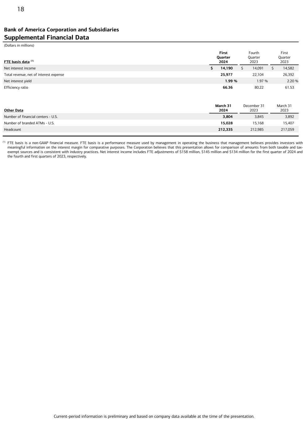Current-period information is preliminary and based on company data available at the time of the presentation. 18 Bank of America Corporation and Subsidiaries Supplemental Financial Data (Dollars in millions) First Quarter 2024 Fourth Quarter 2023 First Quarter 2023FTE basis data (1) Net interest income $ 14,190 $ 14,091 $ 14,582 Total revenue, net of interest expense 25,977 22,104 26,392 Net interest yield 1.99 % 1.97 % 2.20 % Efficiency ratio 66.36 80.22 61.53 Other Data March 31 2024 December 31 2023 March 31 2023 Number of financial centers - U.S. 3,804 3,845 3,892 Number of branded ATMs - U.S. 15,028 15,168 15,407 Headcount 212,335 212,985 217,059 (1) FTE basis is a non-GAAP financial measure. FTE basis is a performance measure used by management in operating the business that management believes provides investors with meaningful information on the interest margin for comparative purposes. The Corporation believes that this presentation allows for comparison of amounts from both taxable and tax- exempt sources and is consistent with industry practices. Net interest income includes FTE adjustments of $158 million, $145 million and $134 million for the first quarter of 2024 and the fourth and first quarters of 2023, respectively.