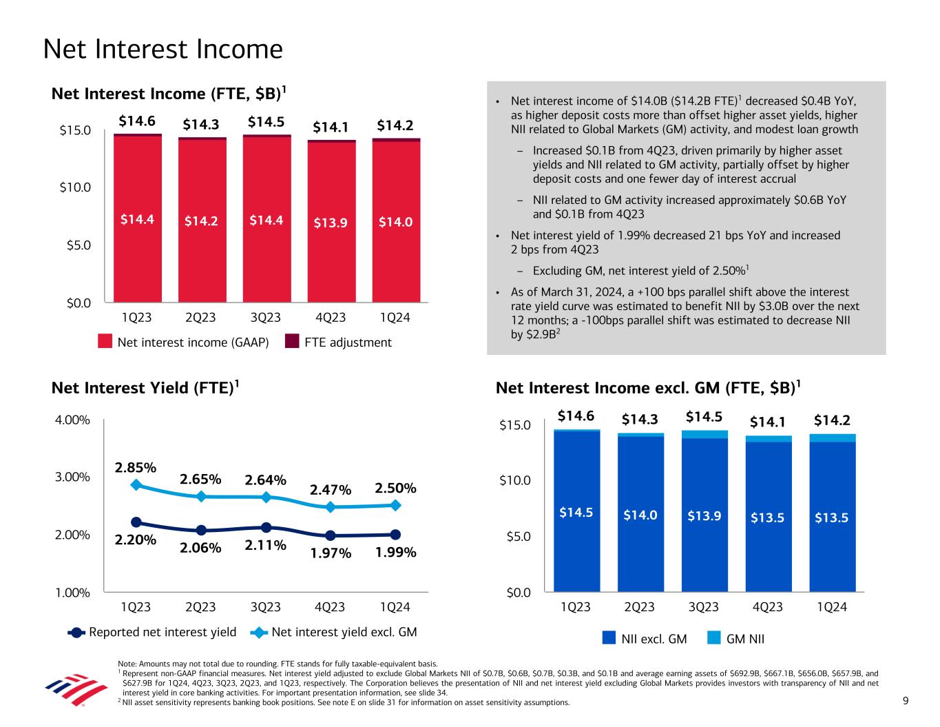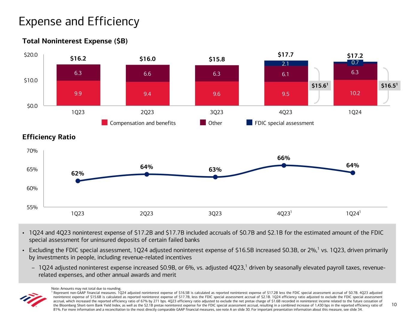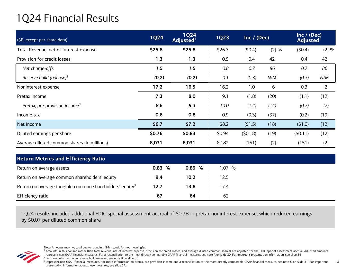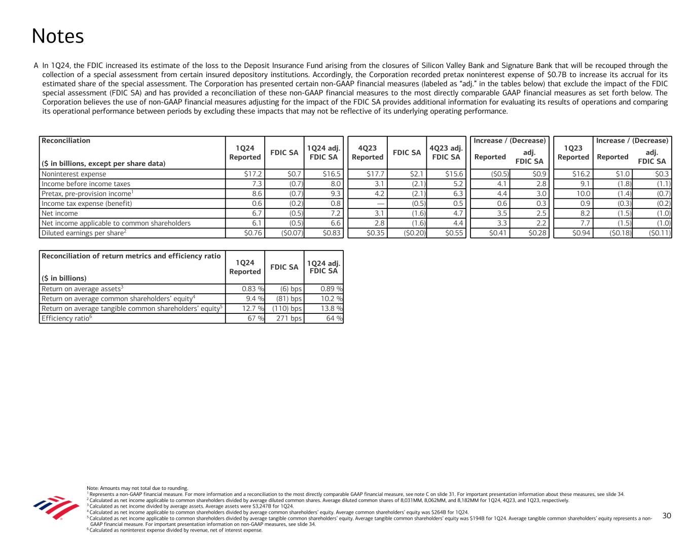 Note: Amounts may not total due to rounding. 1 Represents a non-GAAP financial measure. For more information and a reconciliation to the most directly comparable GAAP financial measure, see note C on slide 31. For important presentation information about these measures, see slide 34. 2 Calculated as net income applicable to common shareholders divided by average diluted common shares. Average diluted common shares of 8,031MM, 8,062MM, and 8,182MM for 1Q24, 4Q23, and 1Q23, respectively. 3 Calculated as net income divided by average assets. Average assets were $3,247B for 1Q24. 4 Calculated as net income applicable to common shareholders divided by average common shareholders’ equity. Average common shareholders’ equity was $264B for 1Q24. 5 Calculated as net income applicable to common shareholders divided by average tangible common shareholders’ equity. Average tangible common shareholders’ equity was $194B for 1Q24. Average tangible common shareholders’ equity represents a non- GAAP financial measure. For important presentation information on non-GAAP measures, see slide 34. 6 Calculated as noninterest expense divided by revenue, net of interest expense. A In 1Q24, the FDIC increased its estimate of the loss to the Deposit Insurance Fund arising from the closures of Silicon Valley Bank and Signature Bank that will be recouped through the collection of a special assessment from certain insured depository institutions. Accordingly, the Corporation recorded pretax noninterest expense of $0.7B to increase its accrual for its estimated share of the special assessment. The Corporation has presented certain non-GAAP financial measures (labeled as “adj.” in the tables below) that exclude the impact of the FDIC special assessment (FDIC SA) and has provided a reconciliation of these non-GAAP financial measures to the most directly comparable GAAP financial measures as set forth below. The Corporation believes the use of non-GAAP financial measures adjusting for the impact of the FDIC SA provides additional information for evaluating its results of operations and comparing its operational performance between periods by excluding these impacts that may not be reflective of its underlying operating performance. Notes 30 Reconciliation of return metrics and efficiency ratio ($ in billions) 1Q24 Reported FDIC SA 1Q24 adj. FDIC SA Return on average assets3 0.83 % (6) bps 0.89 % Return on average common shareholders’ equity4 9.4 % (81) bps 10.2 % Return on average tangible common shareholders’ equity5 12.7 % (110) bps 13.8 % Efficiency ratio6 67 % 271 bps 64 % Reconciliation 1Q24 Reported FDIC SA 1Q24 adj. FDIC SA 4Q23 Reported FDIC SA 4Q23 adj. FDIC SA Increase / (Decrease) 1Q23 Reported Increase / (Decrease) ($ in billions, except per share data) Reported adj. FDIC SA Reported adj. FDIC SA Noninterest expense $17.2 $0.7 $16.5 $17.7 $2.1 $15.6 ($0.5) $0.9 $16.2 $1.0 $0.3 Income before income taxes 7.3 (0.7) 8.0 3.1 (2.1) 5.2 4.1 2.8 9.1 (1.8) (1.1) Pretax, pre-provision income1 8.6 (0.7) 9.3 4.2 (2.1) 6.3 4.4 3.0 10.0 (1.4) (0.7) Income tax expense (benefit) 0.6 (0.2) 0.8 — (0.5) 0.5 0.6 0.3 0.9 (0.3) (0.2) Net income 6.7 (0.5) 7.2 3.1 (1.6) 4.7 3.5 2.5 8.2 (1.5) (1.0) Net income applicable to common shareholders 6.1 (0.5) 6.6 2.8 (1.6) 4.4 3.3 2.2 7.7 (1.5) (1.0) Diluted earnings per share2 $0.76 ($0.07) $0.83 $0.35 ($0.20) $0.55 $0.41 $0.28 $0.94 ($0.18) ($0.11)