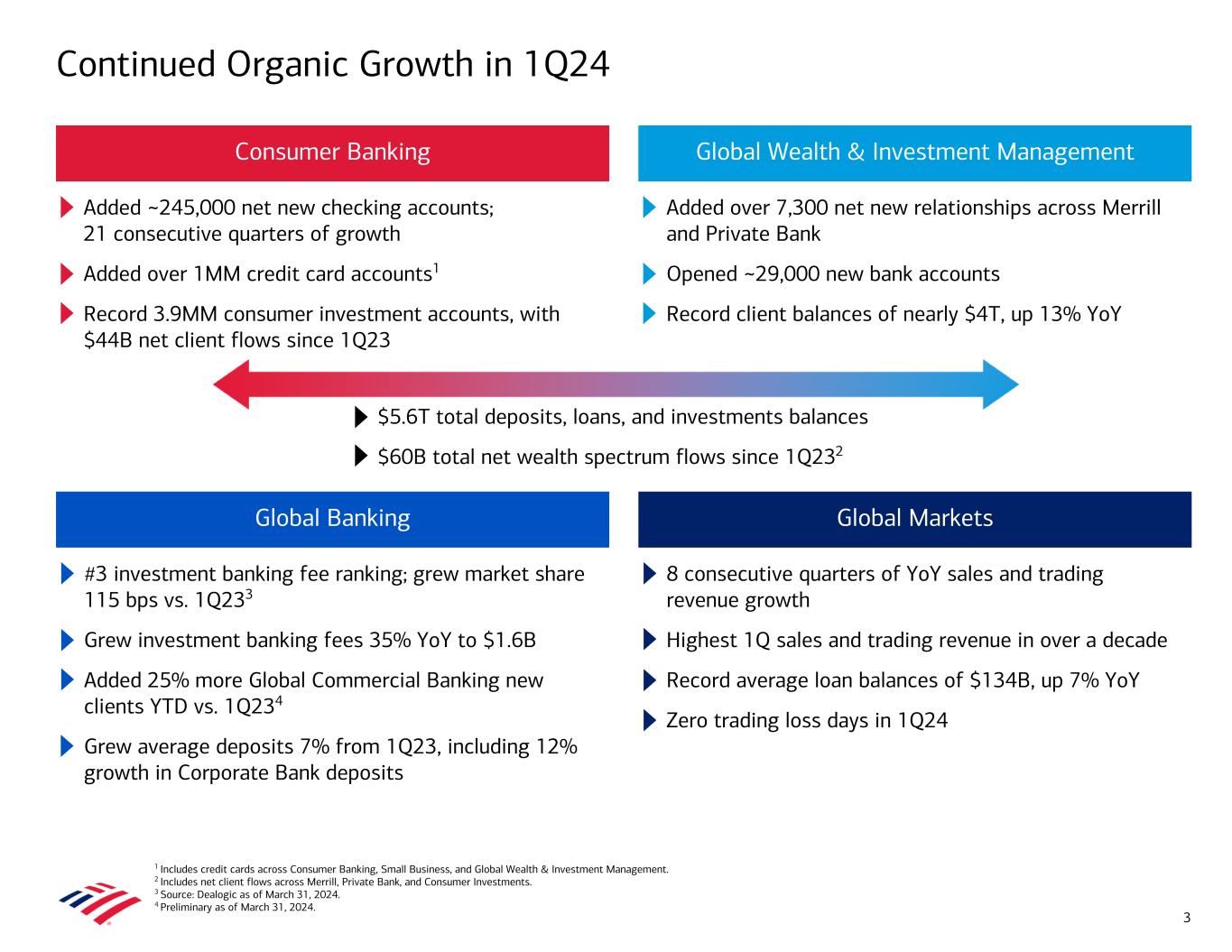 1 Includes credit cards across Consumer Banking, Small Business, and Global Wealth & Investment Management. 2 Includes net client flows across Merrill, Private Bank, and Consumer Investments. 3 Source: Dealogic as of March 31, 2024. 4 Preliminary as of March 31, 2024. #3 investment banking fee ranking; grew market share 115 bps vs. 1Q233 Grew investment banking fees 35% YoY to $1.6B Added 25% more Global Commercial Banking new clients YTD vs. 1Q234 Grew average deposits 7% from 1Q23, including 12% growth in Corporate Bank deposits Added over 7,300 net new relationships across Merrill and Private Bank Opened ~29,000 new bank accounts Record client balances of nearly $4T, up 13% YoY Continued Organic Growth in 1Q24 3 Consumer Banking Global Wealth & Investment Management Global Banking Global Markets Added ~245,000 net new checking accounts; 21 consecutive quarters of growth Added over 1MM credit card accounts1 Record 3.9MM consumer investment accounts, with $44B net client flows since 1Q23 $5.6T total deposits, loans, and investments balances $60B total net wealth spectrum flows since 1Q232 8 consecutive quarters of YoY sales and trading revenue growth Highest 1Q sales and trading revenue in over a decade Record average loan balances of $134B, up 7% YoY Zero trading loss days in 1Q24