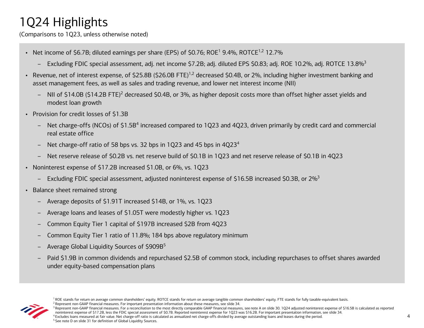 1 ROE stands for return on average common shareholders’ equity. ROTCE stands for return on average tangible common shareholders’ equity. FTE stands for fully taxable-equivalent basis. 2 Represent non-GAAP financial measures. For important presentation information about these measures, see slide 34. 3 Represent non-GAAP financial measures. For a reconciliation to the most directly comparable GAAP financial measures, see note A on slide 30. 1Q24 adjusted noninterest expense of $16.5B is calculated as reported noninterest expense of $17.2B, less the FDIC special assessment of $0.7B. Reported noninterest expense for 1Q23 was $16.2B. For important presentation information, see slide 34. 4 Excludes loans measured at fair value. Net charge-off ratio is calculated as annualized net charge-offs divided by average outstanding loans and leases during the period. 5 See note D on slide 31 for definition of Global Liquidity Sources. 1Q24 Highlights (Comparisons to 1Q23, unless otherwise noted) • Net income of $6.7B; diluted earnings per share (EPS) of $0.76; ROE1 9.4%, ROTCE1,2 12.7% – Excluding FDIC special assessment, adj. net income $7.2B; adj. diluted EPS $0.83; adj. ROE 10.2%, adj. ROTCE 13.8%3 • Revenue, net of interest expense, of $25.8B ($26.0B FTE)1,2 decreased $0.4B, or 2%, including higher investment banking and asset management fees, as well as sales and trading revenue, and lower net interest income (NII) – NII of $14.0B ($14.2B FTE)2 decreased $0.4B, or 3%, as higher deposit costs more than offset higher asset yields and modest loan growth • Provision for credit losses of $1.3B – Net charge-offs (NCOs) of $1.5B4 increased compared to 1Q23 and 4Q23, driven primarily by credit card and commercial real estate office – Net charge-off ratio of 58 bps vs. 32 bps in 1Q23 and 45 bps in 4Q234 – Net reserve release of $0.2B vs. net reserve build of $0.1B in 1Q23 and net reserve release of $0.1B in 4Q23 • Noninterest expense of $17.2B increased $1.0B, or 6%, vs. 1Q23 – Excluding FDIC special assessment, adjusted noninterest expense of $16.5B increased $0.3B, or 2%3 • Balance sheet remained strong – Average deposits of $1.91T increased $14B, or 1%, vs. 1Q23 – Average loans and leases of $1.05T were modestly higher vs. 1Q23 – Common Equity Tier 1 capital of $197B increased $2B from 4Q23 – Common Equity Tier 1 ratio of 11.8%; 184 bps above regulatory minimum – Average Global Liquidity Sources of $909B5 – Paid $1.9B in common dividends and repurchased $2.5B of common stock, including repurchases to offset shares awarded under equity-based compensation plans 4