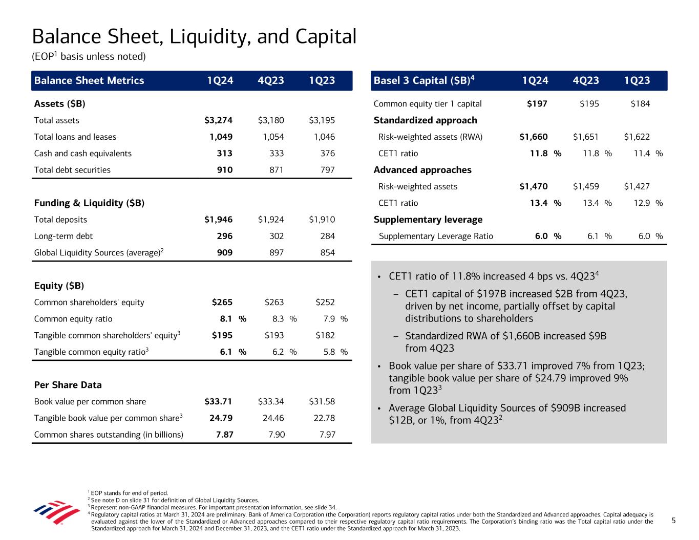Balance Sheet Metrics 1Q24 4Q23 1Q23 Basel 3 Capital ($B)4 1Q24 4Q23 1Q23 Assets ($B) Common equity tier 1 capital $197 $195 $184 Total assets $3,274 $3,180 $3,195 Standardized approach Total loans and leases 1,049 1,054 1,046 Risk-weighted assets (RWA) $1,660 $1,651 $1,622 Cash and cash equivalents 313 333 376 CET1 ratio 11.8 % 11.8 % 11.4 % Total debt securities 910 871 797 Advanced approaches Risk-weighted assets $1,470 $1,459 $1,427 Funding & Liquidity ($B) CET1 ratio 13.4 % 13.4 % 12.9 % Total deposits $1,946 $1,924 $1,910 Supplementary leverage Long-term debt 296 302 284 Supplementary Leverage Ratio 6.0 % 6.1 % 6.0 % Global Liquidity Sources (average)2 909 897 854 Equity ($B) Common shareholders' equity $265 $263 $252 Common equity ratio 8.1 % 8.3 % 7.9 % Tangible common shareholders' equity3 $195 $193 $182 Tangible common equity ratio3 6.1 % 6.2 % 5.8 % Per Share Data Book value per common share $33.71 $33.34 $31.58 Tangible book value per common share3 24.79 24.46 22.78 Common shares outstanding (in billions) 7.87 7.90 7.97 1 EOP stands for end of period. 2 See note D on slide 31 for definition of Global Liquidity Sources. 3 Represent non-GAAP financial measures. For important presentation information, see slide 34. 4 Regulatory capital ratios at March 31, 2024 are preliminary. Bank of America Corporation (the Corporation) reports regulatory capital ratios under both the Standardized and Advanced approaches. Capital adequacy is evaluated against the lower of the Standardized or Advanced approaches compared to their respective regulatory capital ratio requirements. The Corporation’s binding ratio was the Total capital ratio under the Standardized approach for March 31, 2024 and December 31, 2023, and the CET1 ratio under the Standardized approach for March 31, 2023. Balance Sheet, Liquidity, and Capital (EOP1 basis unless noted) 5 • CET1 ratio of 11.8% increased 4 bps vs. 4Q234 – CET1 capital of $197B increased $2B from 4Q23, driven by net income, partially offset by capital distributions to shareholders – Standardized RWA of $1,660B increased $9B from 4Q23 • Book value per share of $33.71 improved 7% from 1Q23; tangible book value per share of $24.79 improved 9% from 1Q233 • Average Global Liquidity Sources of $909B increased $12B, or 1%, from 4Q232