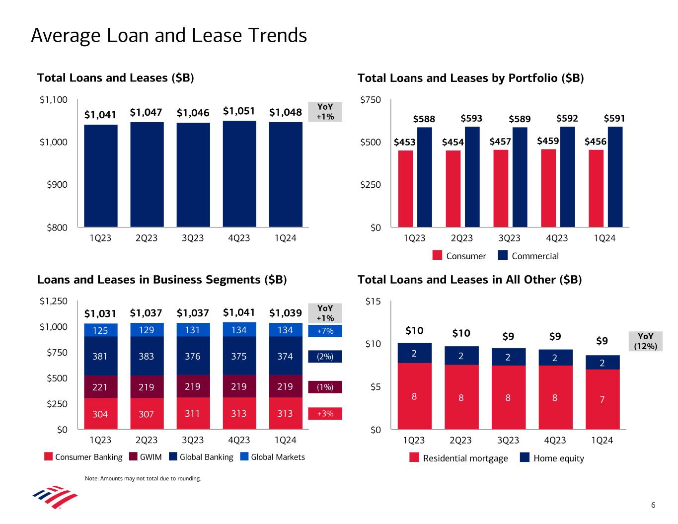 $1,031 $1,037 $1,037 $1,041 $1,039 304 307 311 313 313 221 219 219 219 219 381 383 376 375 374 125 129 131 134 134 Consumer Banking GWIM Global Banking Global Markets 1Q23 2Q23 3Q23 4Q23 1Q24 $0 $250 $500 $750 $1,000 $1,250 $1,041 $1,047 $1,046 $1,051 $1,048 1Q23 2Q23 3Q23 4Q23 1Q24 $800 $900 $1,000 $1,100 +3% (1%) (2%) +7% Average Loan and Lease Trends YoY +1% YoY +1% YoY (12%) Note: Amounts may not total due to rounding. Total Loans and Leases in All Other ($B) Loans and Leases in Business Segments ($B) Total Loans and Leases by Portfolio ($B)Total Loans and Leases ($B) $453 $454 $457 $459 $456 $588 $593 $589 $592 $591 Consumer Commercial 1Q23 2Q23 3Q23 4Q23 1Q24 $0 $250 $500 $750 6 8 8 8 8 7 2 2 2 2 2 $10 $10 $9 $9 $9 Residential mortgage Home equity 1Q23 2Q23 3Q23 4Q23 1Q24 $0 $5 $10 $15