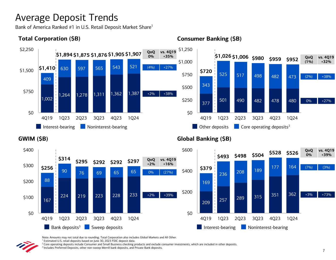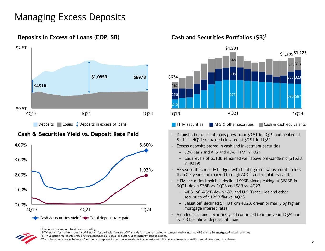 Consumer Banking ($B) GWIM ($B) Global Banking ($B) Total Corporation ($B) Average Deposit Trends Bank of America Ranked #1 in U.S. Retail Deposit Market Share1 Note: Amounts may not total due to rounding. Total Corporation also includes Global Markets and All Other. 1 Estimated U.S. retail deposits based on June 30, 2023 FDIC deposit data. 2 Core operating deposits include Consumer and Small Business checking products and exclude consumer investments, which are included in other deposits. 3 Includes Preferred Deposits, other non-sweep Merrill bank deposits, and Private Bank deposits. $256 $314 $295 $292 $292 $297 167 224 219 223 228 233 88 90 76 69 65 65 Bank deposits Sweep deposits 4Q19 1Q23 2Q23 3Q23 4Q23 1Q24 $0 $100 $200 $300 $400 $1,410 $1,894 $1,875 $1,876 $1,905 $1,907 1,002 1,264 1,278 1,311 1,362 1,387 409 630 597 565 543 521 Interest-bearing Noninterest-bearing 4Q19 1Q23 2Q23 3Q23 4Q23 1Q24 $0 $750 $1,500 $2,250 $379 $493 $498 $504 $528 $526 209 257 289 315 351 362 169 236 208 189 177 164 Interest-bearing Noninterest-bearing 4Q19 1Q23 2Q23 3Q23 4Q23 1Q24 $0 $200 $400 $600 +2% 0% +2% (4%) QoQ 0% QoQ +2% QoQ (1%) +3% (7%) 0% QoQ 0% 7 $720 $1,026 $1,006 $980 $959 $952 377 501 490 482 478 480 343 525 517 498 482 473 Other deposits Core operating deposits 4Q19 1Q23 2Q23 3Q23 4Q23 1Q24 $0 $250 $500 $750 $1,000 $1,250 (2%) 2 +38% +27% vs. 4Q19 +35% +39% (27%) vs. 4Q19 +16% +27% +38% vs. 4Q19 +32% +73% (3%) vs. 4Q19 +39% 3