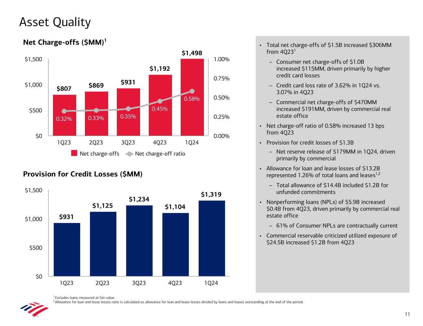 $16.2 $16.0 $15.8 $17.7 $17.2 9.9 9.4 9.6 9.5 10.2 6.3 6.6 6.3 6.1 6.3 2.1 0.7 Compensation and benefits Other FDIC special assessment 1Q23 2Q23 3Q23 4Q23 1Q24 $0.0 $10.0 $20.0 62% 64% 63% 66% 64% 1Q23 2Q23 3Q23 4Q23 1Q24 55% 60% 65% 70% Total Noninterest Expense ($B) Efficiency Ratio Expense and Efficiency 10 • 1Q24 and 4Q23 noninterest expense of $17.2B and $17.7B included accruals of $0.7B and $2.1B for the estimated amount of the FDIC special assessment for uninsured deposits of certain failed banks • Excluding the FDIC special assessment, 1Q24 adjusted noninterest expense of $16.5B increased $0.3B, or 2%,1 vs. 1Q23, driven primarily by investments in people, including revenue-related incentives – 1Q24 adjusted noninterest expense increased $0.9B, or 6%, vs. adjusted 4Q23,1 driven by seasonally elevated payroll taxes, revenue- related expenses, and other annual awards and merit 1 $16.51 Note: Amounts may not total due to rounding. 1 Represent non-GAAP financial measures. 1Q24 adjusted noninterest expense of $16.5B is calculated as reported noninterest expense of $17.2B less the FDIC special assessment accrual of $0.7B. 4Q23 adjusted noninterest expense of $15.6B is calculated as reported noninterest expense of $17.7B, less the FDIC special assessment accrual of $2.1B. 1Q24 efficiency ratio adjusted to exclude the FDIC special assessment accrual, which increased the reported efficiency ratio of 67% by 271 bps. 4Q23 efficiency ratio adjusted to exclude the net pretax charge of $1.6B recorded in noninterest income related to the future cessation of the Bloomberg Short-term Bank Yield Index, as well as the $2.1B pretax noninterest expense for the FDIC special assessment accrual, resulting in a combined increase of 1,430 bps in the reported efficiency ratio of 81%. For more information and a reconciliation to the most directly comparable GAAP financial measures, see note A on slide 30. For important presentation information about this measure, see slide 34. $15.61 1 .