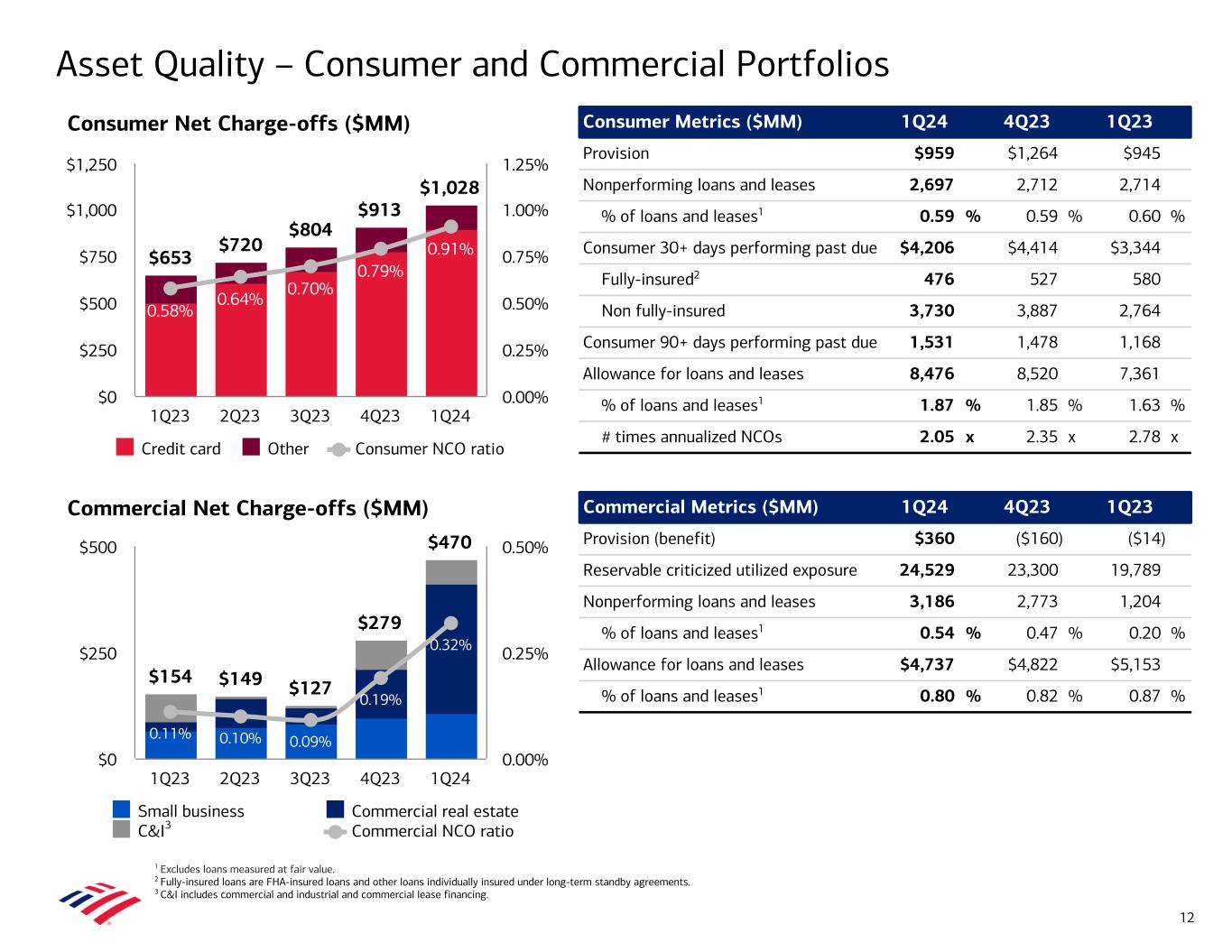 Asset Quality 1 Excludes loans measured at fair value. 2 Allowance for loan and lease losses ratio is calculated as allowance for loan and lease losses divided by loans and leases outstanding at the end of the period. Provision for Credit Losses ($MM) Net Charge-offs ($MM)1 $931 $1,125 $1,234 $1,104 $1,319 1Q23 2Q23 3Q23 4Q23 1Q24 $0 $500 $1,000 $1,500 $807 $869 $931 $1,192 $1,498 0.32% 0.33% 0.35% 0.45% 0.58% Net charge-offs Net charge-off ratio 1Q23 2Q23 3Q23 4Q23 1Q24 $0 $500 $1,000 $1,500 0.00% 0.25% 0.50% 0.75% 1.00% 11 • Total net charge-offs of $1.5B increased $306MM from 4Q231 – Consumer net charge-offs of $1.0B increased $115MM, driven primarily by higher credit card losses – Credit card loss rate of 3.62% in 1Q24 vs. 3.07% in 4Q23 – Commercial net charge-offs of $470MM increased $191MM, driven by commercial real estate office • Net charge-off ratio of 0.58% increased 13 bps from 4Q23 • Provision for credit losses of $1.3B – Net reserve release of $179MM in 1Q24, driven primarily by commercial • Allowance for loan and lease losses of $13.2B represented 1.26% of total loans and leases1,2 – Total allowance of $14.4B included $1.2B for unfunded commitments • Nonperforming loans (NPLs) of $5.9B increased $0.4B from 4Q23, driven primarily by commercial real estate office – 61% of Consumer NPLs are contractually current • Commercial reservable criticized utilized exposure of $24.5B increased $1.2B from 4Q23