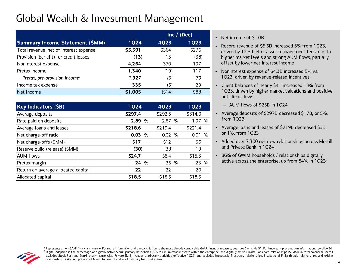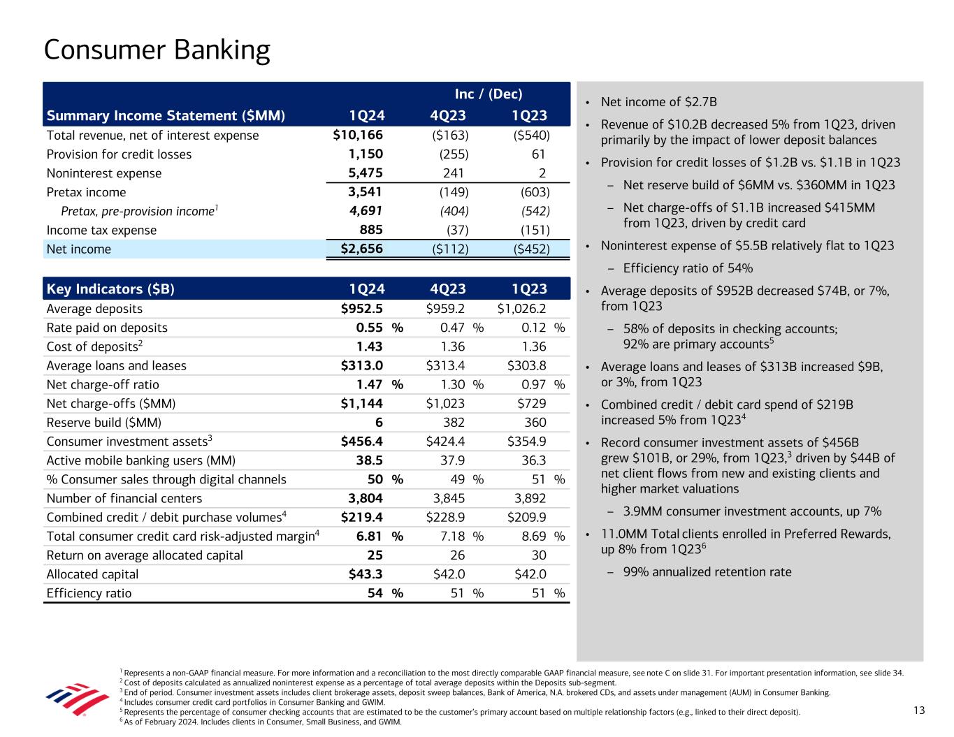 • Net income of $2.7B • Revenue of $10.2B decreased 5% from 1Q23, driven primarily by the impact of lower deposit balances • Provision for credit losses of $1.2B vs. $1.1B in 1Q23 – Net reserve build of $6MM vs. $360MM in 1Q23 – Net charge-offs of $1.1B increased $415MM from 1Q23, driven by credit card • Noninterest expense of $5.5B relatively flat to 1Q23 – Efficiency ratio of 54% • Average deposits of $952B decreased $74B, or 7%, from 1Q23 – 58% of deposits in checking accounts; 92% are primary accounts5 • Average loans and leases of $313B increased $9B, or 3%, from 1Q23 • Combined credit / debit card spend of $219B increased 5% from 1Q234 • Record consumer investment assets of $456B grew $101B, or 29%, from 1Q23,3 driven by $44B of net client flows from new and existing clients and higher market valuations – 3.9MM consumer investment accounts, up 7% • 11.0MM Total clients enrolled in Preferred Rewards, up 8% from 1Q236 – 99% annualized retention rate Consumer Banking 1 Represents a non-GAAP financial measure. For more information and a reconciliation to the most directly comparable GAAP financial measure, see note C on slide 31. For important presentation information, see slide 34. 2 Cost of deposits calculated as annualized noninterest expense as a percentage of total average deposits within the Deposits sub-segment. 3 End of period. Consumer investment assets includes client brokerage assets, deposit sweep balances, Bank of America, N.A. brokered CDs, and assets under management (AUM) in Consumer Banking. 4 Includes consumer credit card portfolios in Consumer Banking and GWIM. 5 Represents the percentage of consumer checking accounts that are estimated to be the customer’s primary account based on multiple relationship factors (e.g., linked to their direct deposit). 6 As of February 2024. Includes clients in Consumer, Small Business, and GWIM. Inc / (Dec) Summary Income Statement ($MM) 1Q24 4Q23 1Q23 Total revenue, net of interest expense $10,166 ($163) ($540) Provision for credit losses 1,150 (255) 61 Noninterest expense 5,475 241 2 Pretax income 3,541 (149) (603) Pretax, pre-provision income1 4,691 (404) (542) Income tax expense 885 (37) (151) Net income $2,656 ($112) ($452) Key Indicators ($B) 1Q24 4Q23 1Q23 Average deposits $952.5 $959.2 $1,026.2 Rate paid on deposits 0.55 % 0.47 % 0.12 % Cost of deposits2 1.43 1.36 1.36 Average loans and leases $313.0 $313.4 $303.8 Net charge-off ratio 1.47 % 1.30 % 0.97 % Net charge-offs ($MM) $1,144 $1,023 $729 Reserve build ($MM) 6 382 360 Consumer investment assets3 $456.4 $424.4 $354.9 Active mobile banking users (MM) 38.5 37.9 36.3 % Consumer sales through digital channels 50 % 49 % 51 % Number of financial centers 3,804 3,845 3,892 Combined credit / debit purchase volumes4 $219.4 $228.9 $209.9 Total consumer credit card risk-adjusted margin4 6.81 % 7.18 % 8.69 % Return on average allocated capital 25 26 30 Allocated capital $43.3 $42.0 $42.0 Efficiency ratio 54 % 51 % 51 % 13