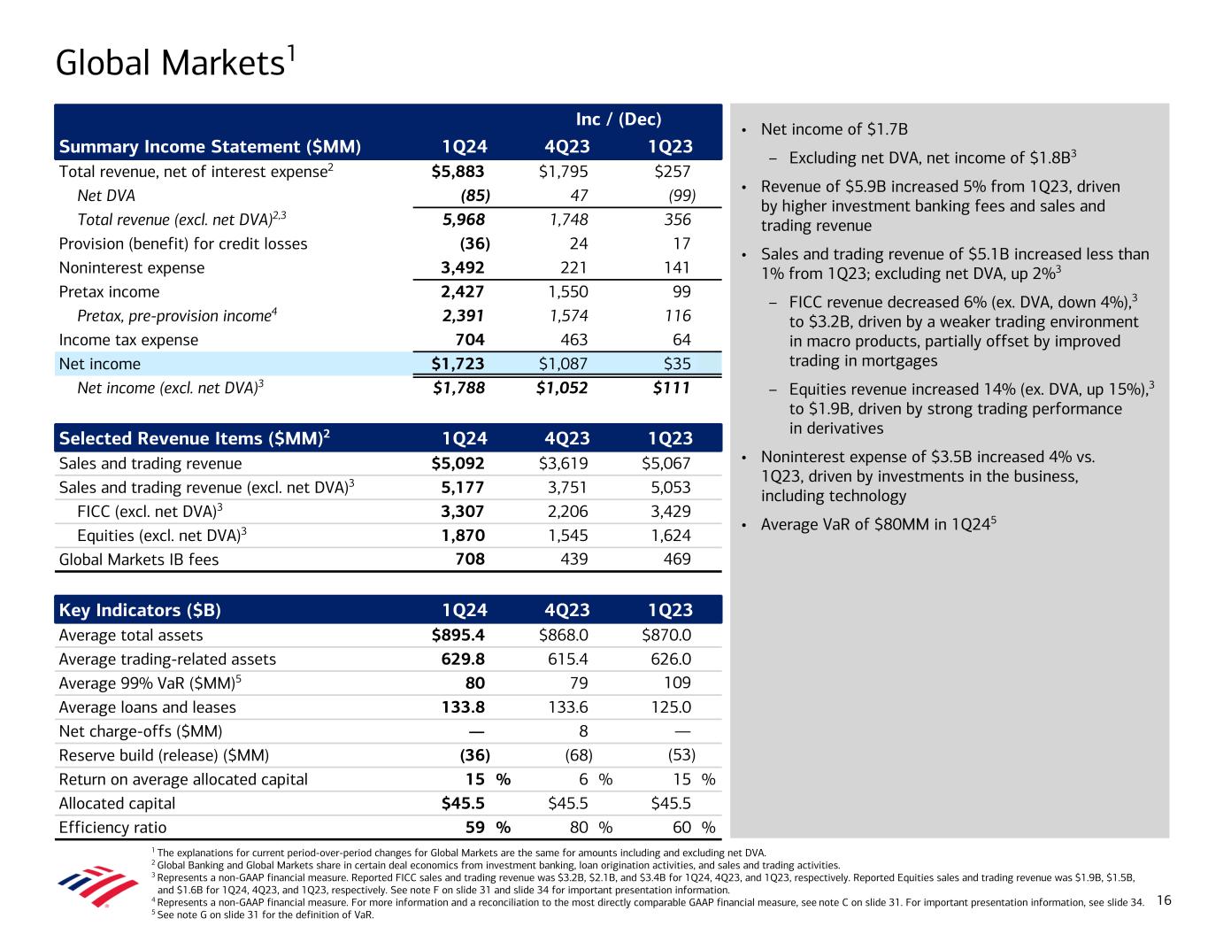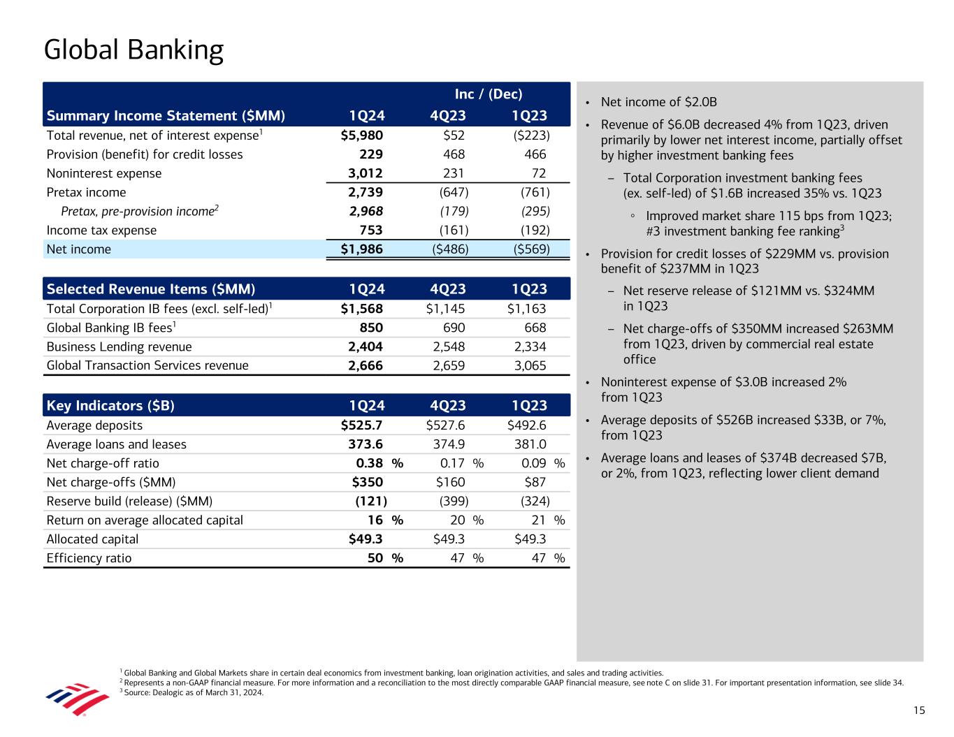 • Net income of $2.0B • Revenue of $6.0B decreased 4% from 1Q23, driven primarily by lower net interest income, partially offset by higher investment banking fees – Total Corporation investment banking fees (ex. self-led) of $1.6B increased 35% vs. 1Q23 ◦ Improved market share 115 bps from 1Q23; #3 investment banking fee ranking3 • Provision for credit losses of $229MM vs. provision benefit of $237MM in 1Q23 – Net reserve release of $121MM vs. $324MM in 1Q23 – Net charge-offs of $350MM increased $263MM from 1Q23, driven by commercial real estate office • Noninterest expense of $3.0B increased 2% from 1Q23 • Average deposits of $526B increased $33B, or 7%, from 1Q23 • Average loans and leases of $374B decreased $7B, or 2%, from 1Q23, reflecting lower client demand Global Banking 1 Global Banking and Global Markets share in certain deal economics from investment banking, loan origination activities, and sales and trading activities. 2 Represents a non-GAAP financial measure. For more information and a reconciliation to the most directly comparable GAAP financial measure, see note C on slide 31. For important presentation information, see slide 34. 3 Source: Dealogic as of March 31, 2024. Inc / (Dec) Summary Income Statement ($MM) 1Q24 4Q23 1Q23 Total revenue, net of interest expense1 $5,980 $52 ($223) Provision (benefit) for credit losses 229 468 466 Noninterest expense 3,012 231 72 Pretax income 2,739 (647) (761) Pretax, pre-provision income2 2,968 (179) (295) Income tax expense 753 (161) (192) Net income $1,986 ($486) ($569) Selected Revenue Items ($MM) 1Q24 4Q23 1Q23 Total Corporation IB fees (excl. self-led)1 $1,568 $1,145 $1,163 Global Banking IB fees1 850 690 668 Business Lending revenue 2,404 2,548 2,334 Global Transaction Services revenue 2,666 2,659 3,065 Key Indicators ($B) 1Q24 4Q23 1Q23 Average deposits $525.7 $527.6 $492.6 Average loans and leases 373.6 374.9 381.0 Net charge-off ratio 0.38 % 0.17 % 0.09 % Net charge-offs ($MM) $350 $160 $87 Reserve build (release) ($MM) (121) (399) (324) Return on average allocated capital 16 % 20 % 21 % Allocated capital $49.3 $49.3 $49.3 Efficiency ratio 50 % 47 % 47 % 15