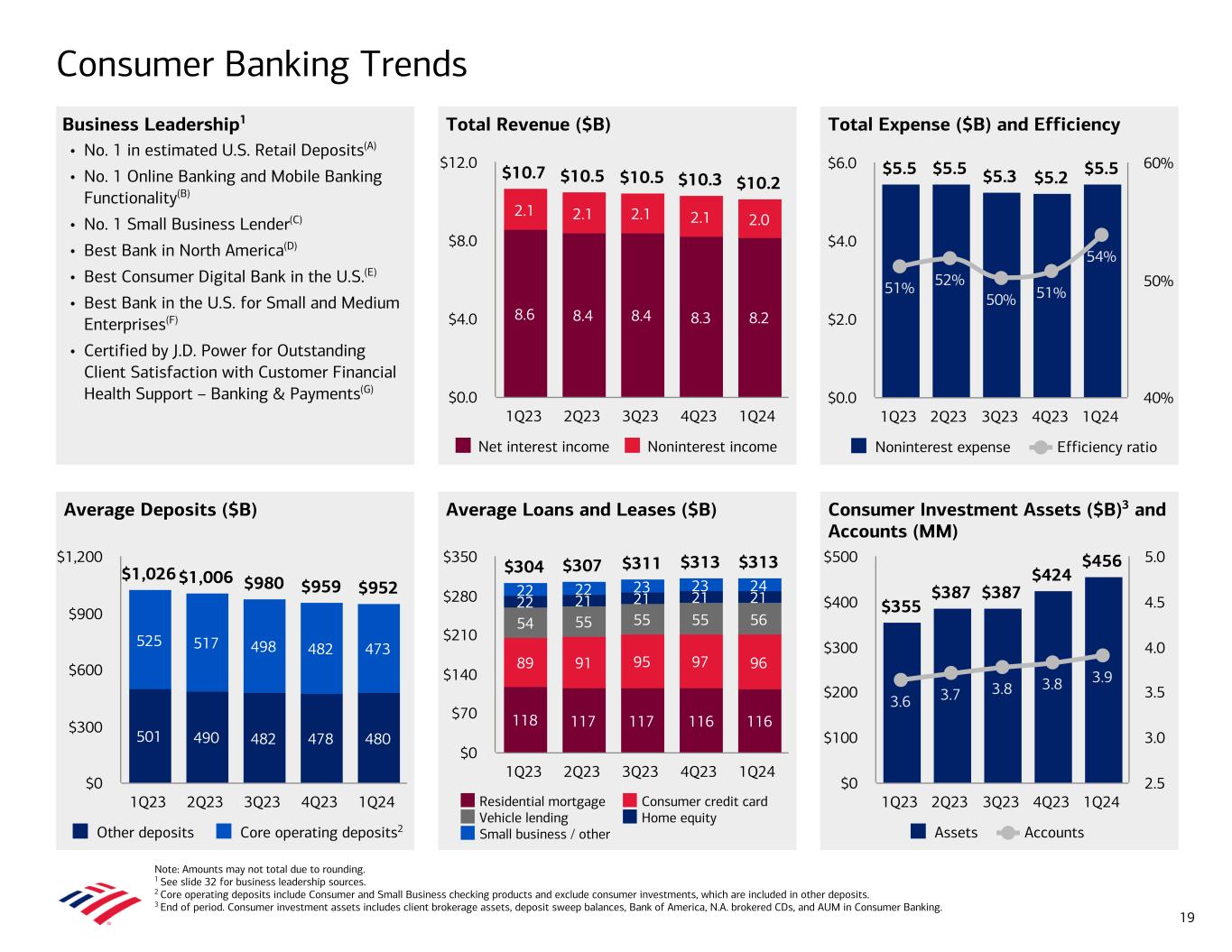 Total Expense ($B) and Efficiency Total Revenue ($B) Average Deposits ($B) Consumer Investment Assets ($B)3 and Accounts (MM) Average Loans and Leases ($B) Consumer Banking Trends Note: Amounts may not total due to rounding. 1 See slide 32 for business leadership sources. 2 Core operating deposits include Consumer and Small Business checking products and exclude consumer investments, which are included in other deposits. 3 End of period. Consumer investment assets includes client brokerage assets, deposit sweep balances, Bank of America, N.A. brokered CDs, and AUM in Consumer Banking. $10.7 $10.5 $10.5 $10.3 $10.2 8.6 8.4 8.4 8.3 8.2 2.1 2.1 2.1 2.1 2.0 Net interest income Noninterest income 1Q23 2Q23 3Q23 4Q23 1Q24 $0.0 $4.0 $8.0 $12.0 $5.5 $5.5 $5.3 $5.2 $5.5 51% 52% 50% 51% 54% Noninterest expense Efficiency ratio 1Q23 2Q23 3Q23 4Q23 1Q24 $0.0 $2.0 $4.0 $6.0 40% 50% 60% $1,026$1,006 $980 $959 $952 501 490 482 478 480 525 517 498 482 473 Other deposits Core operating deposits 1Q23 2Q23 3Q23 4Q23 1Q24 $0 $300 $600 $900 $1,200 $304 $307 $311 $313 $313 118 117 117 116 116 89 91 95 97 96 54 55 55 55 56 22 21 21 21 2122 22 23 23 24 Residential mortgage Consumer credit card Vehicle lending Home equity Small business / other 1Q23 2Q23 3Q23 4Q23 1Q24 $0 $70 $140 $210 $280 $350 19 $355 $387 $387 $424 $456 3.6 3.7 3.8 3.8 3.9 Assets Accounts 1Q23 2Q23 3Q23 4Q23 1Q24 $0 $100 $200 $300 $400 $500 2.5 3.0 3.5 4.0 4.5 5.0 Business Leadership1 • No. 1 in estimated U.S. Retail Deposits(A) • No. 1 Online Banking and Mobile Banking Functionality(B) • No. 1 Small Business Lender(C) • Best Bank in North America(D) • Best Consumer Digital Bank in the U.S.(E) • Best Bank in the U.S. for Small and Medium Enterprises(F) • Certified by J.D. Power for Outstanding Client Satisfaction with Customer Financial Health Support – Banking & Payments(G) 2