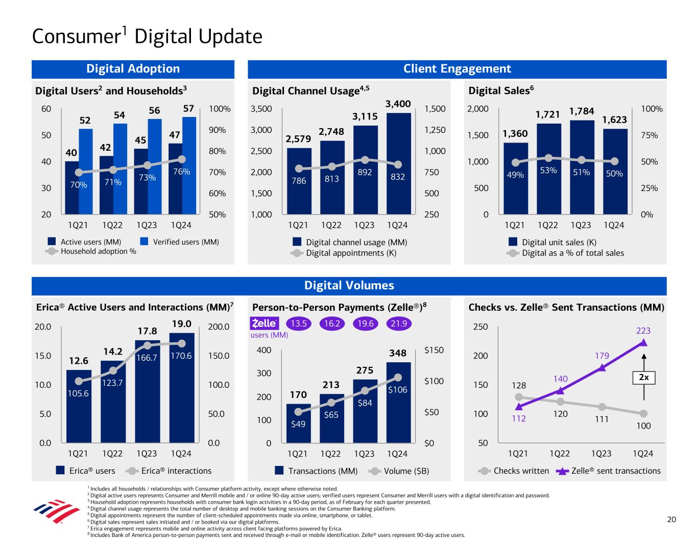 Erica® Active Users and Interactions (MM)7 Checks vs. Zelle® Sent Transactions (MM) Digital Sales6Digital Users2 and Households3 Digital Channel Usage4,5 1,360 1,721 1,784 1,623 49% 53% 51% 50% Digital unit sales (K) Digital as a % of total sales 1Q21 1Q22 1Q23 1Q24 0 500 1,000 1,500 2,000 0% 25% 50% 75% 100% 2,579 2,748 3,115 3,400 786 813 892 832 Digital channel usage (MM) Digital appointments (K) 1Q21 1Q22 1Q23 1Q24 1,000 1,500 2,000 2,500 3,000 3,500 250 500 750 1,000 1,250 1,500 40 42 45 47 52 54 56 57 70% 71% 73% 76% Active users (MM) Verified users (MM) Household adoption % 1Q21 1Q22 1Q23 1Q24 20 30 40 50 60 50% 60% 70% 80% 90% 100% Client Engagement Person-to-Person Payments (Zelle®)8 Digital Volumes 170 213 275 348 $49 $65 $84 $106 Transactions (MM) Volume ($B) 1Q21 1Q22 1Q23 1Q24 0 100 200 300 400 $0 $50 $100 $150 Consumer1 Digital Update 1 Includes all households / relationships with Consumer platform activity, except where otherwise noted. 2 Digital active users represents Consumer and Merrill mobile and / or online 90-day active users; verified users represent Consumer and Merrill users with a digital identification and password. 3 Household adoption represents households with consumer bank login activities in a 90-day period, as of February for each quarter presented. 4 Digital channel usage represents the total number of desktop and mobile banking sessions on the Consumer Banking platform. 5 Digital appointments represent the number of client-scheduled appointments made via online, smartphone, or tablet. 6 Digital sales represent sales initiated and / or booked via our digital platforms. 7 Erica engagement represents mobile and online activity across client facing platforms powered by Erica. 8 Includes Bank of America person-to-person payments sent and received through e-mail or mobile identification. Zelle® users represent 90-day active users. 13.5 16.2 19.6 21.9 users (MM) 20 Digital Adoption 12.6 14.2 17.8 19.0 105.6 123.7 166.7 170.6 Erica® users Erica® interactions 1Q21 1Q22 1Q23 1Q24 0.0 5.0 10.0 15.0 20.0 0.0 50.0 100.0 150.0 200.0 128 120 111 100 112 140 179 223 Checks written Zelle® sent transactions 1Q21 1Q22 1Q23 1Q24 50 100 150 200 250 2x