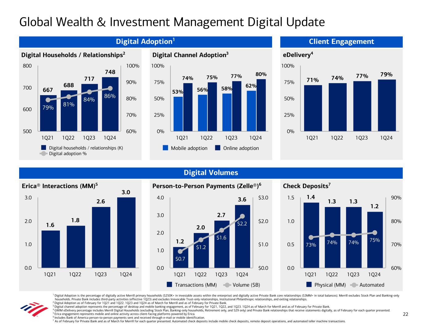 Erica® Interactions (MM)5 1.6 1.8 2.6 3.0 1Q21 1Q22 1Q23 1Q24 0.0 1.0 2.0 3.0 Person-to-Person Payments (Zelle®)6 Check Deposits7 eDelivery4Digital Households / Relationships2 Digital Channel Adoption3 71% 74% 77% 79% 1Q21 1Q22 1Q23 1Q24 0% 25% 50% 75% 100% 53% 56% 58% 62% 74% 75% 77% 80% Mobile adoption Online adoption 1Q21 1Q22 1Q23 1Q24 0% 25% 50% 75% 100% 667 688 717 748 79% 81% 84% 86% Digital households / relationships (K) Digital adoption % 1Q21 1Q22 1Q23 1Q24 500 600 700 800 60% 70% 80% 90% 100% Client Engagement Digital Volumes Global Wealth & Investment Management Digital Update 1 Digital Adoption is the percentage of digitally active Merrill primary households ($250K+ in investable assets within the enterprise) and digitally active Private Bank core relationships ($3MM+ in total balances). Merrill excludes Stock Plan and Banking-only households. Private Bank includes third-party activities (effective 1Q23) and excludes Irrevocable Trust-only relationships, Institutional Philanthropic relationships, and exiting relationships. 2 Digital Adoption as of February for 1Q21 and 1Q22. 1Q23 and 1Q24 as of March for Merrill and as of February for Private Bank. 3 Digital channel adoption represents the percentage of desktop and mobile banking engagement, as of February for 1Q21, 1Q22, and 1Q23. 1Q24 as of March for Merrill and as of February for Private Bank. 4 GWIM eDelivery percentage includes Merrill Digital Households (excluding Stock Plan, Banking-only households, Retirement only, and 529 only) and Private Bank relationships that receive statements digitally, as of February for each quarter presented. 5 Erica engagement represents mobile and online activity across client-facing platforms powered by Erica. 6 Includes Bank of America person-to-person payments sent and received through e-mail or mobile identification. 7 As of February for Private Bank and as of March for Merrill for each quarter presented. Automated check deposits include mobile check deposits, remote deposit operations, and automated teller machine transactions. 22 Digital Adoption1 1.4 1.3 1.3 1.2 73% 74% 74% 75% Physical (MM) Automated 1Q21 1Q22 1Q23 1Q24 0.0 0.5 1.0 1.5 60% 70% 80% 90% 1.2 2.0 2.7 3.6 $0.7 $1.2 $1.6 $2.2 Transactions (MM) Volume ($B) 1Q21 1Q22 1Q23 1Q24 0.0 1.0 2.0 3.0 4.0 $0.0 $1.0 $2.0 $3.0