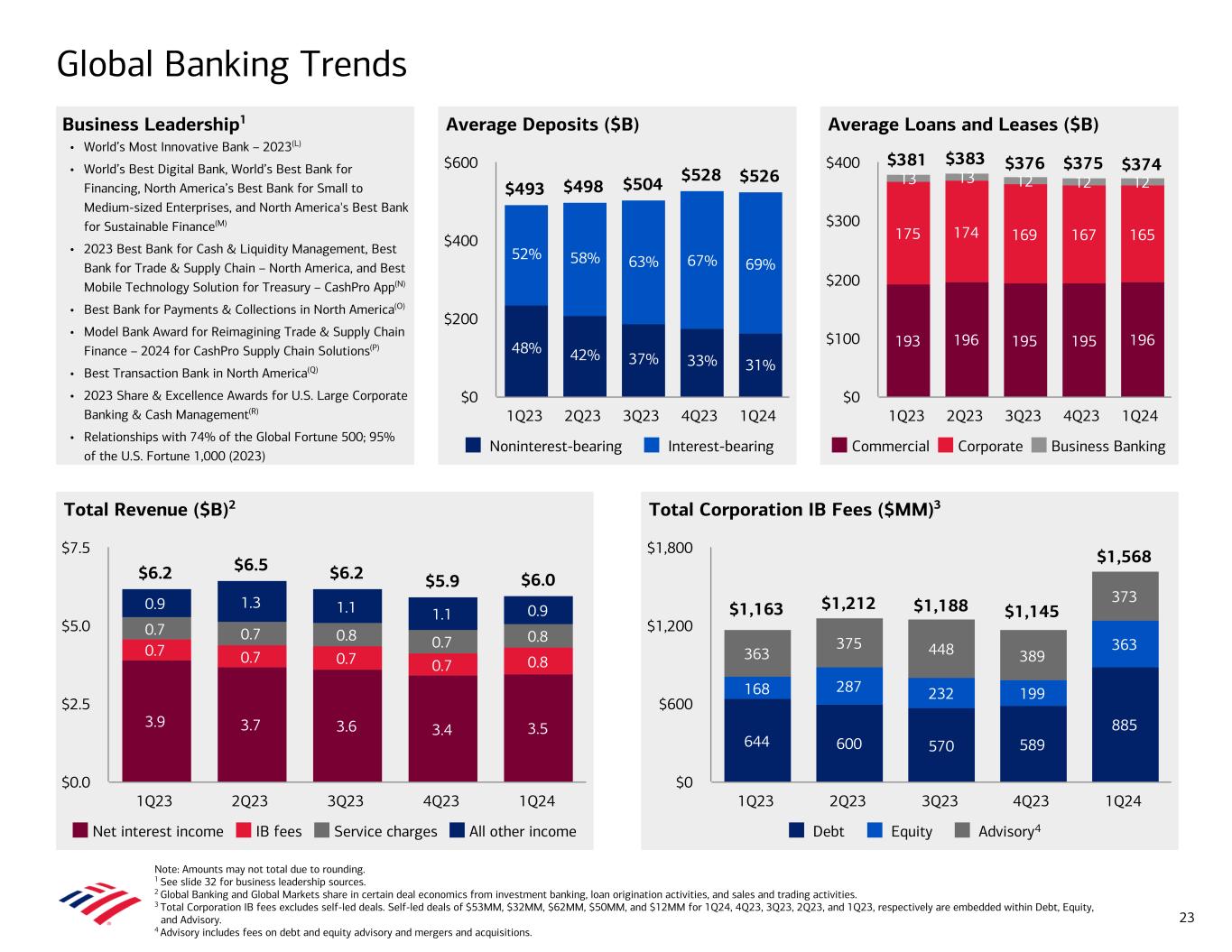 Global Banking Trends Note: Amounts may not total due to rounding. 1 See slide 32 for business leadership sources. 2 Global Banking and Global Markets share in certain deal economics from investment banking, loan origination activities, and sales and trading activities. 3 Total Corporation IB fees excludes self-led deals. Self-led deals of $53MM, $32MM, $62MM, $50MM, and $12MM for 1Q24, 4Q23, 3Q23, 2Q23, and 1Q23, respectively are embedded within Debt, Equity, and Advisory. 4 Advisory includes fees on debt and equity advisory and mergers and acquisitions. Average Deposits ($B)Business Leadership1 • World’s Most Innovative Bank – 2023(L) • World’s Best Digital Bank, World’s Best Bank for Financing, North America’s Best Bank for Small to Medium-sized Enterprises, and North America's Best Bank for Sustainable Finance(M) • 2023 Best Bank for Cash & Liquidity Management, Best Bank for Trade & Supply Chain – North America, and Best Mobile Technology Solution for Treasury – CashPro App(N) • Best Bank for Payments & Collections in North America(O) • Model Bank Award for Reimagining Trade & Supply Chain Finance – 2024 for CashPro Supply Chain Solutions(P) • Best Transaction Bank in North America(Q) • 2023 Share & Excellence Awards for U.S. Large Corporate Banking & Cash Management(R) • Relationships with 74% of the Global Fortune 500; 95% of the U.S. Fortune 1,000 (2023) Average Loans and Leases ($B) Total Revenue ($B)2 Total Corporation IB Fees ($MM)3 $6.2 $6.5 $6.2 $5.9 $6.0 3.9 3.7 3.6 3.4 3.5 0.7 0.7 0.7 0.7 0.8 0.7 0.7 0.8 0.7 0.8 0.9 1.3 1.1 1.1 0.9 Net interest income IB fees Service charges All other income 1Q23 2Q23 3Q23 4Q23 1Q24 $0.0 $2.5 $5.0 $7.5 644 600 570 589 885 168 287 232 199 363 363 375 448 389 373 $1,163 $1,212 $1,188 $1,145 $1,568 Debt Equity Advisory 1Q23 2Q23 3Q23 4Q23 1Q24 $0 $600 $1,200 $1,800 193 196 195 195 196 175 174 169 167 165 13 13 12 12 12 $381 $383 $376 $375 $374 Commercial Corporate Business Banking 1Q23 2Q23 3Q23 4Q23 1Q24 $0 $100 $200 $300 $400 4 $493 $498 $504 $528 $526 Noninterest-bearing Interest-bearing 1Q23 2Q23 3Q23 4Q23 1Q24 $0 $200 $400 $600 23 48% 42% 37% 33% 31% 52% 58% 63% 67% 69%