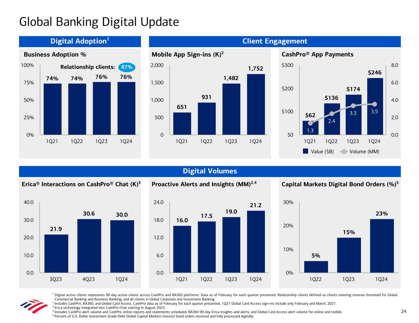 1 Digital active clients represents 90-day active clients across CashPro and BA360 platforms. Data as of February for each quarter presented. Relationship clients defined as clients meeting revenue threshold for Global Commercial Banking and Business Banking, and all clients in Global Corporate and Investment Banking. 2 Includes CashPro, BA360, and Global Card Access. CashPro data as of February for each quarter presented. 1Q21 Global Card Access sign-ins include only February and March, 2021. 3 Erica technology integrated into CashPro Chat starting in August 2023. 4 Includes CashPro alert volume and CashPro online reports and statements scheduled, BA360 90-day Erica Insights and alerts, and Global Card Access alert volume for online and mobile. 5 Percent of U.S. Dollar Investment Grade Debt Global Capital Markets investor bond orders received and fully processed digitally. Capital Markets Digital Bond Orders (%)5 Erica® Interactions on CashPro® Chat (K)3 Proactive Alerts and Insights (MM)2,4 5% 15% 23% 1Q22 1Q23 1Q24 0% 10% 20% 30% 16.0 17.5 19.0 21.2 1Q21 1Q22 1Q23 1Q24 0.0 6.0 12.0 18.0 24.0 21.9 30.6 30.0 3Q23 4Q23 1Q24 0.0 10.0 20.0 30.0 40.0 CashPro® App PaymentsBusiness Adoption % Mobile App Sign-ins (K)2 $62 $136 $174 $246 1.3 2.4 3.3 3.5 Value ($B) Volume (MM) 1Q21 1Q22 1Q23 1Q24 $0 $100 $200 $300 0.0 2.0 4.0 6.0 8.0 651 931 1,482 1,752 1Q21 1Q22 1Q23 1Q24 0 500 1,000 1,500 2,000 74% 74% 76% 76% 1Q21 1Q22 1Q23 1Q24 0% 25% 50% 75% 100% Client Engagement Digital Volumes Global Banking Digital Update 24 Digital Adoption1 87%Relationship clients: