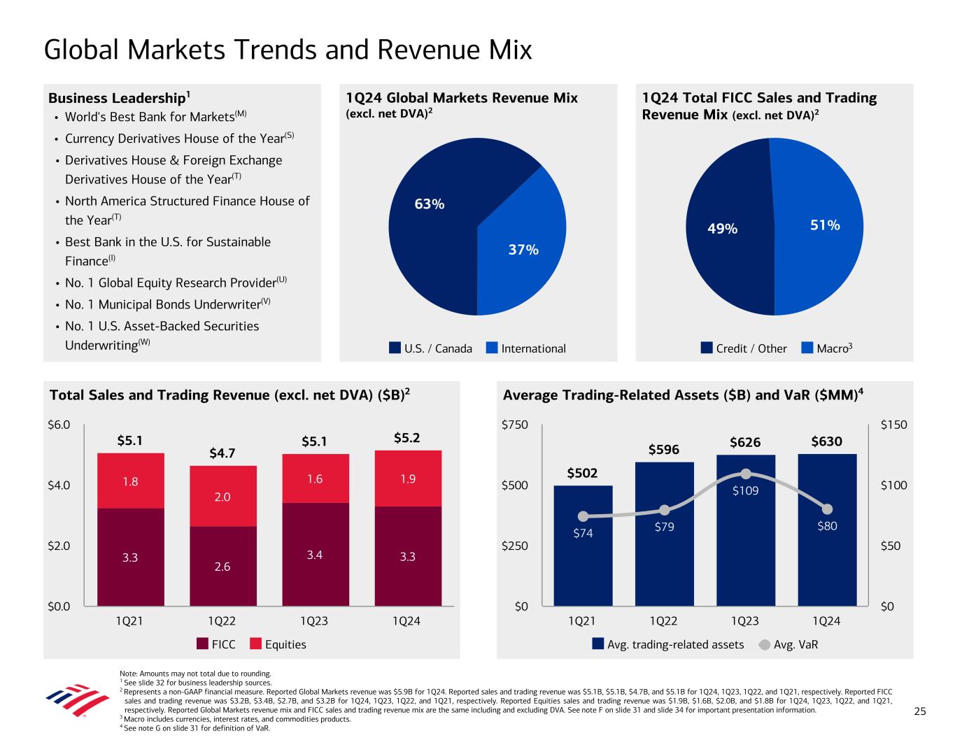Global Markets Trends and Revenue Mix Note: Amounts may not total due to rounding. 1 See slide 32 for business leadership sources. 2 Represents a non-GAAP financial measure. Reported Global Markets revenue was $5.9B for 1Q24. Reported sales and trading revenue was $5.1B, $5.1B, $4.7B, and $5.1B for 1Q24, 1Q23, 1Q22, and 1Q21, respectively. Reported FICC sales and trading revenue was $3.2B, $3.4B, $2.7B, and $3.2B for 1Q24, 1Q23, 1Q22, and 1Q21, respectively. Reported Equities sales and trading revenue was $1.9B, $1.6B, $2.0B, and $1.8B for 1Q24, 1Q23, 1Q22, and 1Q21, respectively. Reported Global Markets revenue mix and FICC sales and trading revenue mix are the same including and excluding DVA. See note F on slide 31 and slide 34 for important presentation information. 3 Macro includes currencies, interest rates, and commodities products. 4 See note G on slide 31 for definition of VaR. 1Q24 Global Markets Revenue Mix (excl. net DVA)2 Business Leadership1 • World's Best Bank for Markets(M) • Currency Derivatives House of the Year(S) • Derivatives House & Foreign Exchange Derivatives House of the Year(T) • North America Structured Finance House of the Year(T) • Best Bank in the U.S. for Sustainable Finance(I) • No. 1 Global Equity Research Provider(U) • No. 1 Municipal Bonds Underwriter(V) • No. 1 U.S. Asset-Backed Securities Underwriting(W) 1Q24 Total FICC Sales and Trading Revenue Mix (excl. net DVA)2 Total Sales and Trading Revenue (excl. net DVA) ($B)2 Average Trading-Related Assets ($B) and VaR ($MM)4 $5.1 $4.7 $5.1 $5.2 3.3 2.6 3.4 3.3 1.8 2.0 1.6 1.9 FICC Equities 1Q21 1Q22 1Q23 1Q24 $0.0 $2.0 $4.0 $6.0 $502 $596 $626 $630 $74 $79 $109 $80 Avg. trading-related assets Avg. VaR 1Q21 1Q22 1Q23 1Q24 $0 $250 $500 $750 $0 $50 $100 $150 63% 37% U.S. / Canada International 49% 51% Credit / Other Macro3 25