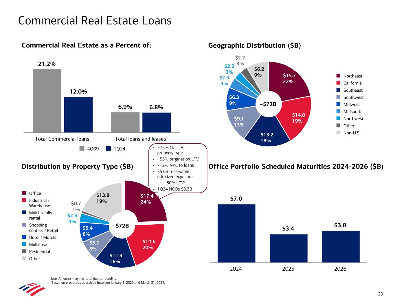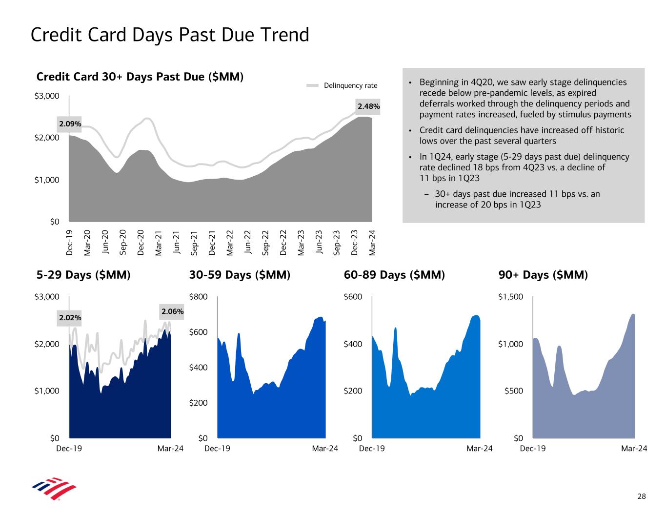 1,187 1,137 1,062 889 998 1Q23 2Q23 3Q23 4Q23 1Q24 0 500 1,000 1,500 Home Equity1 New Originations ($B)4 Consumer Credit Update 1 Includes loan production within Consumer Banking and GWIM. Consumer credit card balances include average balances of $3.3B, $3.4B, and $3.0B in 1Q24, 4Q23, and 1Q23, respectively, within GWIM. 2 Calculated as the difference between total revenue, net of interest expense, and net credit losses divided by average loans. 3 Represents Consumer Banking only. 4 Amounts represent the unpaid principal balance of loans and in the case of home equity, the principal amount of the total line of credit. Consumer Vehicle Lending3 New Originations ($B) Consumer Credit Card1 New Accounts (K) 27 Residential Mortgage1 New Originations ($B)4 Key Stats 1Q23 4Q23 1Q24 Average outstandings ($B) 91.8 100.4 99.8 NCO ratio 2.21% 3.07% 3.62% Risk-adjusted margin2 8.69% 7.18% 6.81% Average line FICO 774 775 777 $7.0 $6.8 $6.8 $6.1 $6.6 1Q23 2Q23 3Q23 4Q23 1Q24 $0.0 $2.5 $5.0 $7.5 Key Stats 1Q23 4Q23 1Q24 Average outstandings ($B) 53.9 55.5 55.9 NCO ratio (0.00%) 0.37% 0.51% Average booked FICO 795 799 801 $3.9 $5.9 $5.6 $3.9 $3.4 1Q23 2Q23 3Q23 4Q23 1Q24 $0.0 $2.5 $5.0 $7.5 Key Stats 1Q23 4Q23 1Q24 Average outstandings ($B)3 117.7 116.3 115.5 NCO ratio3 0.01% 0.03% 0.01% Average FICO 771 775 772 Average booked loan-to-value (LTV) 73% 72% 73% $2.6 $2.5 $2.4 $2.3 $1.9 1Q23 2Q23 3Q23 4Q23 1Q24 $0.0 $1.0 $2.0 $3.0 Key Stats 1Q23 4Q23 1Q24 Average outstandings ($B)3 21.6 21.3 21.3 NCO ratio3 (0.01%) (0.03%) (0.04%) Average FICO 789 788 791 Average booked combined LTV 58% 57% 55%