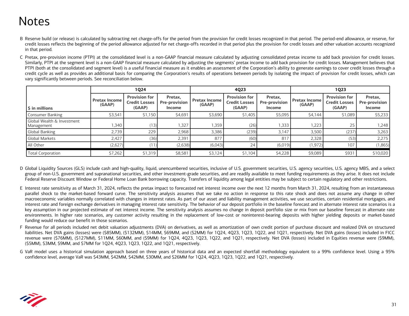 B Reserve build (or release) is calculated by subtracting net charge-offs for the period from the provision for credit losses recognized in that period. The period-end allowance, or reserve, for credit losses reflects the beginning of the period allowance adjusted for net charge-offs recorded in that period plus the provision for credit losses and other valuation accounts recognized in that period. C Pretax, pre-provision income (PTPI) at the consolidated level is a non-GAAP financial measure calculated by adjusting consolidated pretax income to add back provision for credit losses. Similarly, PTPI at the segment level is a non-GAAP financial measure calculated by adjusting the segments’ pretax income to add back provision for credit losses. Management believes that PTPI (both at the consolidated and segment level) is a useful financial measure as it enables an assessment of the Corporation’s ability to generate earnings to cover credit losses through a credit cycle as well as provides an additional basis for comparing the Corporation's results of operations between periods by isolating the impact of provision for credit losses, which can vary significantly between periods. See reconciliation below. D Global Liquidity Sources (GLS) include cash and high-quality, liquid, unencumbered securities, inclusive of U.S. government securities, U.S. agency securities, U.S. agency MBS, and a select group of non-U.S. government and supranational securities, and other investment-grade securities, and are readily available to meet funding requirements as they arise. It does not include Federal Reserve Discount Window or Federal Home Loan Bank borrowing capacity. Transfers of liquidity among legal entities may be subject to certain regulatory and other restrictions. E Interest rate sensitivity as of March 31, 2024, reflects the pretax impact to forecasted net interest income over the next 12 months from March 31, 2024, resulting from an instantaneous parallel shock to the market-based forward curve. The sensitivity analysis assumes that we take no action in response to this rate shock and does not assume any change in other macroeconomic variables normally correlated with changes in interest rates. As part of our asset and liability management activities, we use securities, certain residential mortgages, and interest rate and foreign exchange derivatives in managing interest rate sensitivity. The behavior of our deposit portfolio in the baseline forecast and in alternate interest rate scenarios is a key assumption in our projected estimate of net interest income. The sensitivity analysis assumes no change in deposit portfolio size or mix from our baseline forecast in alternate rate environments. In higher rate scenarios, any customer activity resulting in the replacement of low-cost or noninterest-bearing deposits with higher yielding deposits or market-based funding would reduce our benefit in those scenarios. F Revenue for all periods included net debit valuation adjustments (DVA) on derivatives, as well as amortization of own credit portion of purchase discount and realized DVA on structured liabilities. Net DVA gains (losses) were ($85MM), ($132MM), $14MM, $69MM, and ($2MM) for 1Q24, 4Q23, 1Q23, 1Q22, and 1Q21, respectively. Net DVA gains (losses) included in FICC revenue were ($76MM), ($127MM), $11MM, $60MM, and ($9MM) for 1Q24, 4Q23, 1Q23, 1Q22, and 1Q21, respectively. Net DVA (losses) included in Equities revenue were ($9MM), ($5MM), $3MM, $9MM, and $7MM for 1Q24, 4Q23, 1Q23, 1Q22, and 1Q21, respectively. G VaR model uses a historical simulation approach based on three years of historical data and an expected shortfall methodology equivalent to a 99% confidence level. Using a 95% confidence level, average VaR was $43MM, $42MM, $42MM, $30MM, and $26MM for 1Q24, 4Q23, 1Q23, 1Q22, and 1Q21, respectively. Notes $ in millions 1Q24 4Q23 1Q23 Pretax Income (GAAP) Provision for Credit Losses (GAAP) Pretax, Pre-provision Income Pretax Income (GAAP) Provision for Credit Losses (GAAP) Pretax, Pre-provision Income Pretax Income (GAAP) Provision for Credit Losses (GAAP) Pretax, Pre-provision Income Consumer Banking $3,541 $1,150 $4,691 $3,690 $1,405 $5,095 $4,144 $1,089 $5,233 Global Wealth & Investment Management 1,340 (13) 1,327 1,359 (26) 1,333 1,223 25 1,248 Global Banking 2,739 229 2,968 3,386 (239) 3,147 3,500 (237) 3,263 Global Markets 2,427 (36) 2,391 877 (60) 817 2,328 (53) 2,275 All Other (2,627) (11) (2,638) (6,043) 24 (6,019) (1,972) 107 (1,865) Total Corporation $7,262 $1,319 $8,581 $3,124 $1,104 $4,228 $9,089 $931 $10,020 31