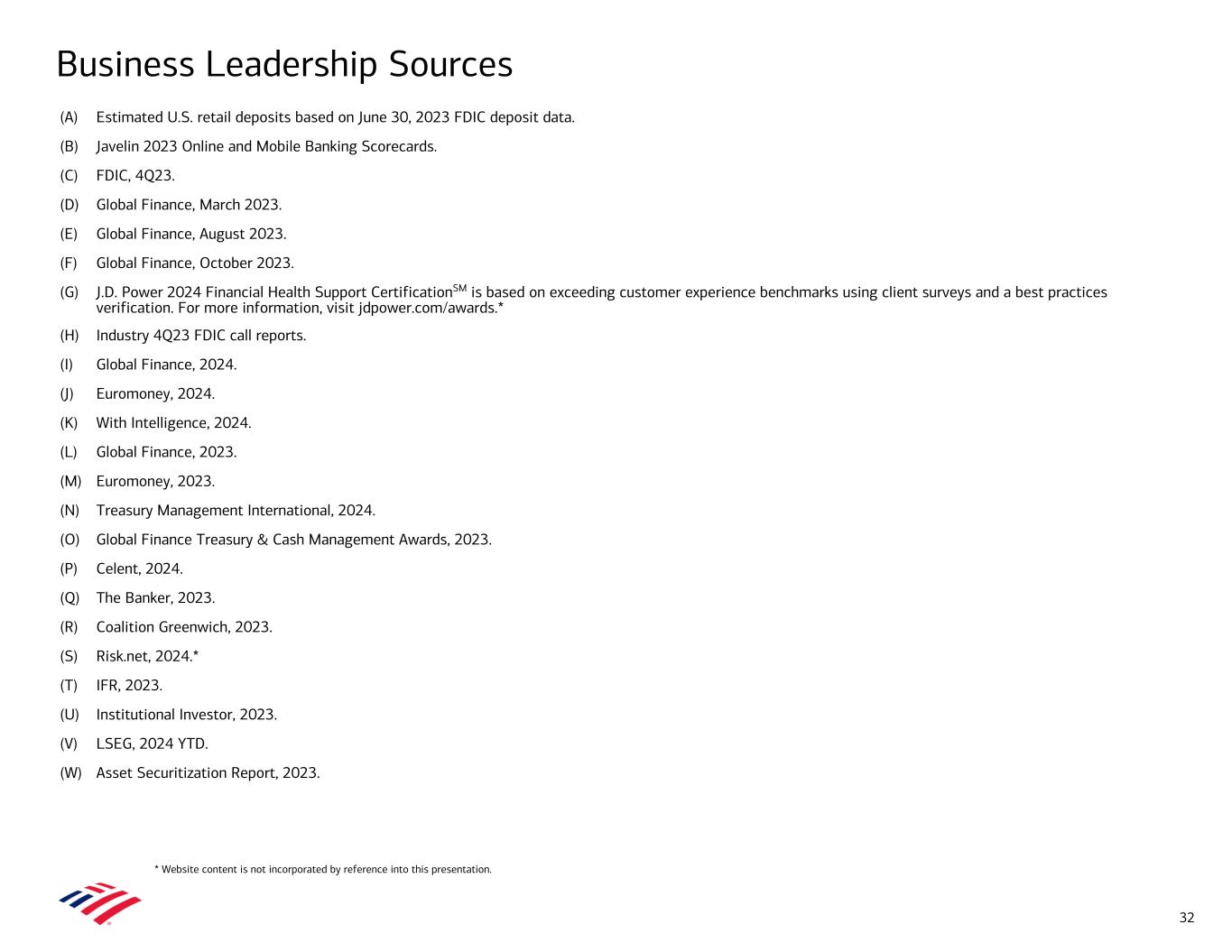 Business Leadership Sources (A) Estimated U.S. retail deposits based on June 30, 2023 FDIC deposit data. (B) Javelin 2023 Online and Mobile Banking Scorecards. (C) FDIC, 4Q23. (D) Global Finance, March 2023. (E) Global Finance, August 2023. (F) Global Finance, October 2023. (G) J.D. Power 2024 Financial Health Support CertificationSM is based on exceeding customer experience benchmarks using client surveys and a best practices verification. For more information, visit jdpower.com/awards.* (H) Industry 4Q23 FDIC call reports. (I) Global Finance, 2024. (J) Euromoney, 2024. (K) With Intelligence, 2024. (L) Global Finance, 2023. (M) Euromoney, 2023. (N) Treasury Management International, 2024. (O) Global Finance Treasury & Cash Management Awards, 2023. (P) Celent, 2024. (Q) The Banker, 2023. (R) Coalition Greenwich, 2023. (S) Risk.net, 2024.* (T) IFR, 2023. (U) Institutional Investor, 2023. (V) LSEG, 2024 YTD. (W) Asset Securitization Report, 2023. 32 * Website content is not incorporated by reference into this presentation.