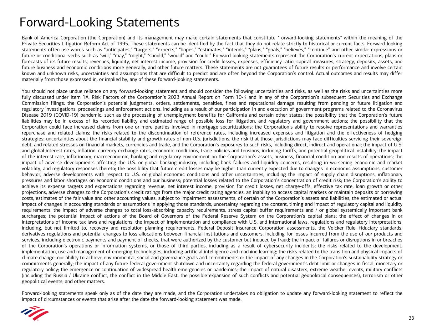Forward-Looking Statements Bank of America Corporation (the Corporation) and its management may make certain statements that constitute “forward-looking statements” within the meaning of the Private Securities Litigation Reform Act of 1995. These statements can be identified by the fact that they do not relate strictly to historical or current facts. Forward-looking statements often use words such as “anticipates,” “targets,” “expects,” “hopes,” “estimates,” “intends,” “plans,” “goals,” “believes,” “continue” and other similar expressions or future or conditional verbs such as “will,” “may,” “might,” “should,” “would” and “could.” Forward-looking statements represent the Corporation’s current expectations, plans or forecasts of its future results, revenues, liquidity, net interest income, provision for credit losses, expenses, efficiency ratio, capital measures, strategy, deposits, assets, and future business and economic conditions more generally, and other future matters. These statements are not guarantees of future results or performance and involve certain known and unknown risks, uncertainties and assumptions that are difficult to predict and are often beyond the Corporation’s control. Actual outcomes and results may differ materially from those expressed in, or implied by, any of these forward-looking statements. You should not place undue reliance on any forward-looking statement and should consider the following uncertainties and risks, as well as the risks and uncertainties more fully discussed under Item 1A. Risk Factors of the Corporation’s 2023 Annual Report on Form 10-K and in any of the Corporation’s subsequent Securities and Exchange Commission filings: the Corporation’s potential judgments, orders, settlements, penalties, fines and reputational damage resulting from pending or future litigation and regulatory investigations, proceedings and enforcement actions, including as a result of our participation in and execution of government programs related to the Coronavirus Disease 2019 (COVID-19) pandemic, such as the processing of unemployment benefits for California and certain other states; the possibility that the Corporation's future liabilities may be in excess of its recorded liability and estimated range of possible loss for litigation, and regulatory and government actions; the possibility that the Corporation could face increased claims from one or more parties involved in mortgage securitizations; the Corporation’s ability to resolve representations and warranties repurchase and related claims; the risks related to the discontinuation of reference rates, including increased expenses and litigation and the effectiveness of hedging strategies; uncertainties about the financial stability and growth rates of non-U.S. jurisdictions, the risk that those jurisdictions may face difficulties servicing their sovereign debt, and related stresses on financial markets, currencies and trade, and the Corporation’s exposures to such risks, including direct, indirect and operational; the impact of U.S. and global interest rates, inflation, currency exchange rates, economic conditions, trade policies and tensions, including tariffs, and potential geopolitical instability; the impact of the interest rate, inflationary, macroeconomic, banking and regulatory environment on the Corporation’s assets, business, financial condition and results of operations; the impact of adverse developments affecting the U.S. or global banking industry, including bank failures and liquidity concerns, resulting in worsening economic and market volatility, and regulatory responses thereto; the possibility that future credit losses may be higher than currently expected due to changes in economic assumptions, customer behavior, adverse developments with respect to U.S. or global economic conditions and other uncertainties, including the impact of supply chain disruptions, inflationary pressures and labor shortages on economic conditions and our business; potential losses related to the Corporation’s concentration of credit risk; the Corporation's ability to achieve its expense targets and expectations regarding revenue, net interest income, provision for credit losses, net charge-offs, effective tax rate, loan growth or other projections; adverse changes to the Corporation’s credit ratings from the major credit rating agencies; an inability to access capital markets or maintain deposits or borrowing costs; estimates of the fair value and other accounting values, subject to impairment assessments, of certain of the Corporation’s assets and liabilities; the estimated or actual impact of changes in accounting standards or assumptions in applying those standards; uncertainty regarding the content, timing and impact of regulatory capital and liquidity requirements; the impact of adverse changes to total loss-absorbing capacity requirements, stress capital buffer requirements and / or global systemically important bank surcharges; the potential impact of actions of the Board of Governors of the Federal Reserve System on the Corporation’s capital plans; the effect of changes in or interpretations of income tax laws and regulations; the impact of implementation and compliance with U.S. and international laws, regulations and regulatory interpretations, including, but not limited to, recovery and resolution planning requirements, Federal Deposit Insurance Corporation assessments, the Volcker Rule, fiduciary standards, derivatives regulations and potential changes to loss allocations between financial institutions and customers, including for losses incurred from the use of our products and services, including electronic payments and payment of checks, that were authorized by the customer but induced by fraud; the impact of failures or disruptions in or breaches of the Corporation’s operations or information systems, or thos