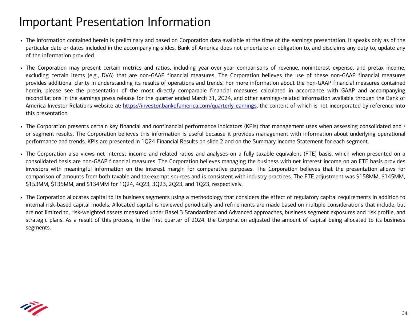 Important Presentation Information 34 • The information contained herein is preliminary and based on Corporation data available at the time of the earnings presentation. It speaks only as of the particular date or dates included in the accompanying slides. Bank of America does not undertake an obligation to, and disclaims any duty to, update any of the information provided. • The Corporation may present certain metrics and ratios, including year-over-year comparisons of revenue, noninterest expense, and pretax income, excluding certain items (e.g., DVA) that are non-GAAP financial measures. The Corporation believes the use of these non-GAAP financial measures provides additional clarity in understanding its results of operations and trends. For more information about the non-GAAP financial measures contained herein, please see the presentation of the most directly comparable financial measures calculated in accordance with GAAP and accompanying reconciliations in the earnings press release for the quarter ended March 31, 2024, and other earnings-related information available through the Bank of America Investor Relations website at: https://investor.bankofamerica.com/quarterly-earnings, the content of which is not incorporated by reference into this presentation. • The Corporation presents certain key financial and nonfinancial performance indicators (KPIs) that management uses when assessing consolidated and / or segment results. The Corporation believes this information is useful because it provides management with information about underlying operational performance and trends. KPIs are presented in 1Q24 Financial Results on slide 2 and on the Summary Income Statement for each segment. • The Corporation also views net interest income and related ratios and analyses on a fully taxable-equivalent (FTE) basis, which when presented on a consolidated basis are non-GAAP financial measures. The Corporation believes managing the business with net interest income on an FTE basis provides investors with meaningful information on the interest margin for comparative purposes. The Corporation believes that the presentation allows for comparison of amounts from both taxable and tax-exempt sources and is consistent with industry practices. The FTE adjustment was $158MM, $145MM, $153MM, $135MM, and $134MM for 1Q24, 4Q23, 3Q23, 2Q23, and 1Q23, respectively. • The Corporation allocates capital to its business segments using a methodology that considers the effect of regulatory capital requirements in addition to internal risk-based capital models. Allocated capital is reviewed periodically and refinements are made based on multiple considerations that include, but are not limited to, risk-weighted assets measured under Basel 3 Standardized and Advanced approaches, business segment exposures and risk profile, and strategic plans. As a result of this process, in the first quarter of 2024, the Corporation adjusted the amount of capital being allocated to its business segments.