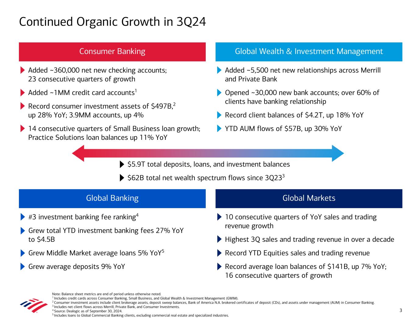 #3 investment banking fee ranking4 Grew total YTD investment banking fees 27% YoY to $4.5B Grew Middle Market average loans 5% YoY5 Grew average deposits 9% YoY 10 consecutive quarters of YoY sales and trading revenue growth Highest 3Q sales and trading revenue in over a decade Record YTD Equities sales and trading revenue Record average loan balances of $141B, up 7% YoY; 16 consecutive quarters of growth Added ~5,500 net new relationships across Merrill and Private Bank Opened ~30,000 new bank accounts; over 60% of clients have banking relationship Record client balances of $4.2T, up 18% YoY YTD AUM flows of $57B, up 30% YoY Continued Organic Growth in 3Q24 3 Consumer Banking Global Wealth & Investment Management Global Banking Global Markets Added ~360,000 net new checking accounts; 23 consecutive quarters of growth Added ~1MM credit card accounts1 Record consumer investment assets of $497B,2 up 28% YoY; 3.9MM accounts, up 4% 14 consecutive quarters of Small Business loan growth; Practice Solutions loan balances up 11% YoY $5.9T total deposits, loans, and investment balances $62B total net wealth spectrum flows since 3Q233 Note: Balance sheet metrics are end of period unless otherwise noted. 1 Includes credit cards across Consumer Banking, Small Business, and Global Wealth & Investment Management (GWIM). 2 Consumer investment assets include client brokerage assets, deposit sweep balances, Bank of America N.A. brokered certificates of deposit (CDs), and assets under management (AUM) in Consumer Banking. 3 Includes net client flows across Merrill, Private Bank, and Consumer Investments. 4 Source: Dealogic as of September 30, 2024. 5 Includes loans to Global Commercial Banking clients, excluding commercial real estate and specialized industries.