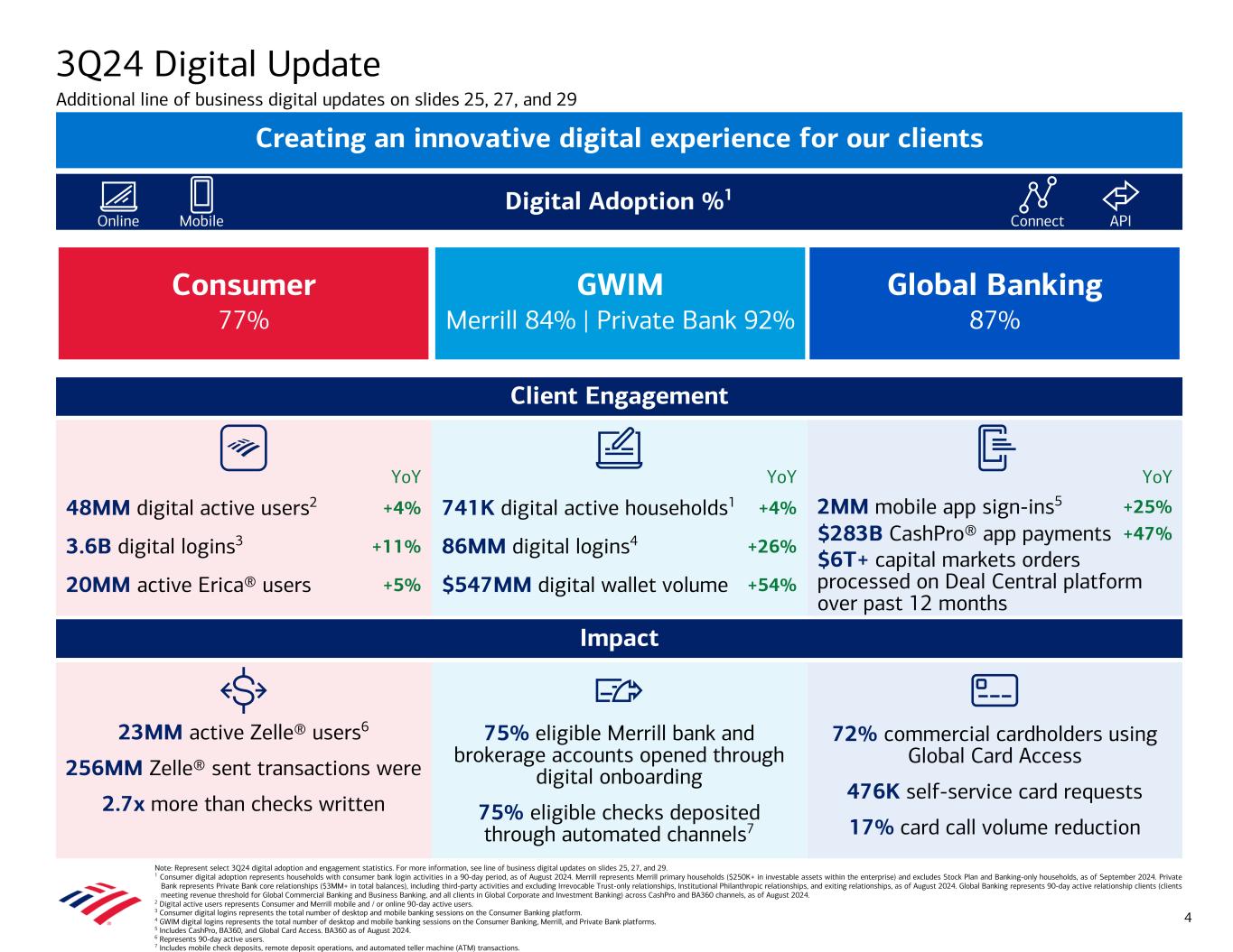 Note: Represent select 3Q24 digital adoption and engagement statistics. For more information, see line of business digital updates on slides 25, 27, and 29. 1 Consumer digital adoption represents households with consumer bank login activities in a 90-day period, as of August 2024. Merrill represents Merrill primary households ($250K+ in investable assets within the enterprise) and excludes Stock Plan and Banking-only households, as of September 2024. Private Bank represents Private Bank core relationships ($3MM+ in total balances), including third-party activities and excluding Irrevocable Trust-only relationships, Institutional Philanthropic relationships, and exiting relationships, as of August 2024. Global Banking represents 90-day active relationship clients (clients meeting revenue threshold for Global Commercial Banking and Business Banking, and all clients in Global Corporate and Investment Banking) across CashPro and BA360 channels, as of August 2024. 2 Digital active users represents Consumer and Merrill mobile and / or online 90-day active users. 3 Consumer digital logins represents the total number of desktop and mobile banking sessions on the Consumer Banking platform. 4 GWIM digital logins represents the total number of desktop and mobile banking sessions on the Consumer Banking, Merrill, and Private Bank platforms. 5 Includes CashPro, BA360, and Global Card Access. BA360 as of August 2024. 6 Represents 90-day active users. 7 Includes mobile check deposits, remote deposit operations, and automated teller machine (ATM) transactions. 23MM active Zelle® users6 256MM Zelle® sent transactions were 2.7x more than checks written 3Q24 Digital Update Additional line of business digital updates on slides 25, 27, and 29 4 Digital Adoption %1 72% commercial cardholders using Global Card Access 476K self-service card requests 17% card call volume reduction 75% eligible Merrill bank and brokerage accounts opened through digital onboarding 75% eligible checks deposited through automated channels7 Client Engagement Impact Creating an innovative digital experience for our clients Online Mobile Connect API YoY 48MM digital active users2 +4% 3.6B digital logins3 +11% 20MM active Erica® users +5% YoY 741K digital active households1 +4% 86MM digital logins4 +26% $547MM digital wallet volume +54% YoY 2MM mobile app sign-ins5 +25% $283B CashPro® app payments +47% $6T+ capital markets orders processed on Deal Central platform over past 12 months GWIM Merrill 84% | Private Bank 92% Consumer 77% Global Banking 87%