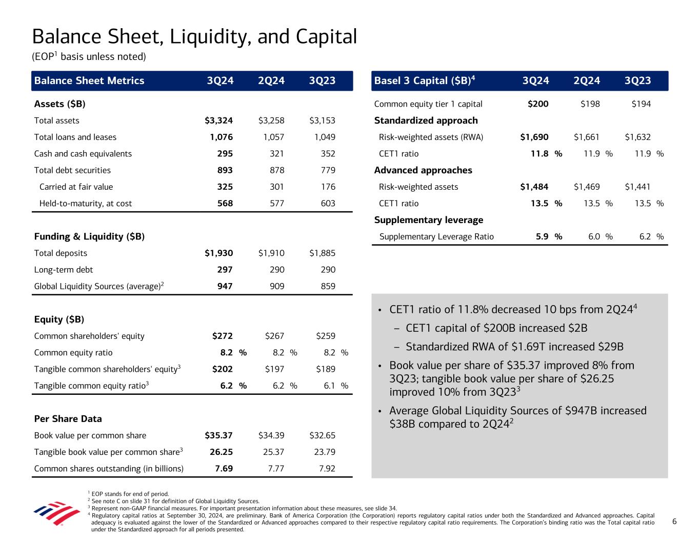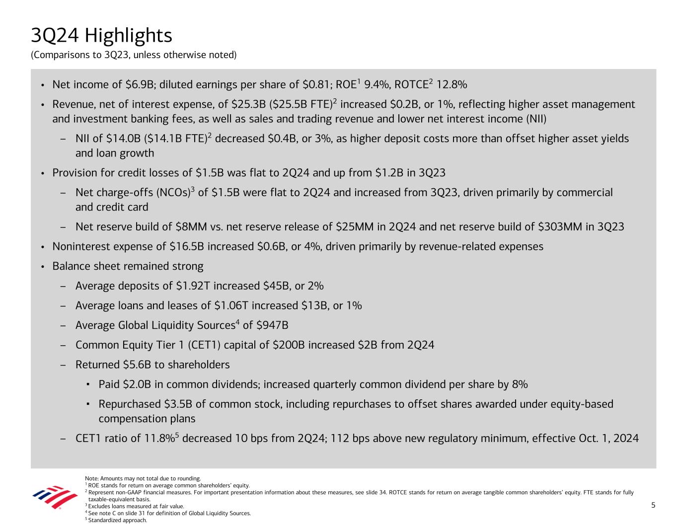 Note: Amounts may not total due to rounding. 1 ROE stands for return on average common shareholders’ equity. 2 Represent non-GAAP financial measures. For important presentation information about these measures, see slide 34. ROTCE stands for return on average tangible common shareholders’ equity. FTE stands for fully taxable-equivalent basis. 3 Excludes loans measured at fair value. 4 See note C on slide 31 for definition of Global Liquidity Sources. 5 Standardized approach. 3Q24 Highlights (Comparisons to 3Q23, unless otherwise noted) • Net income of $6.9B; diluted earnings per share of $0.81; ROE1 9.4%, ROTCE2 12.8% • Revenue, net of interest expense, of $25.3B ($25.5B FTE)2 increased $0.2B, or 1%, reflecting higher asset management and investment banking fees, as well as sales and trading revenue and lower net interest income (NII) – NII of $14.0B ($14.1B FTE)2 decreased $0.4B, or 3%, as higher deposit costs more than offset higher asset yields and loan growth • Provision for credit losses of $1.5B was flat to 2Q24 and up from $1.2B in 3Q23 – Net charge-offs (NCOs)3 of $1.5B were flat to 2Q24 and increased from 3Q23, driven primarily by commercial and credit card – Net reserve build of $8MM vs. net reserve release of $25MM in 2Q24 and net reserve build of $303MM in 3Q23 • Noninterest expense of $16.5B increased $0.6B, or 4%, driven primarily by revenue-related expenses • Balance sheet remained strong – Average deposits of $1.92T increased $45B, or 2% – Average loans and leases of $1.06T increased $13B, or 1% – Average Global Liquidity Sources4 of $947B – Common Equity Tier 1 (CET1) capital of $200B increased $2B from 2Q24 – Returned $5.6B to shareholders ▪ Paid $2.0B in common dividends; increased quarterly common dividend per share by 8% ▪ Repurchased $3.5B of common stock, including repurchases to offset shares awarded under equity-based compensation plans – CET1 ratio of 11.8%5 decreased 10 bps from 2Q24; 112 bps above new regulatory minimum, effective Oct. 1, 2024 5