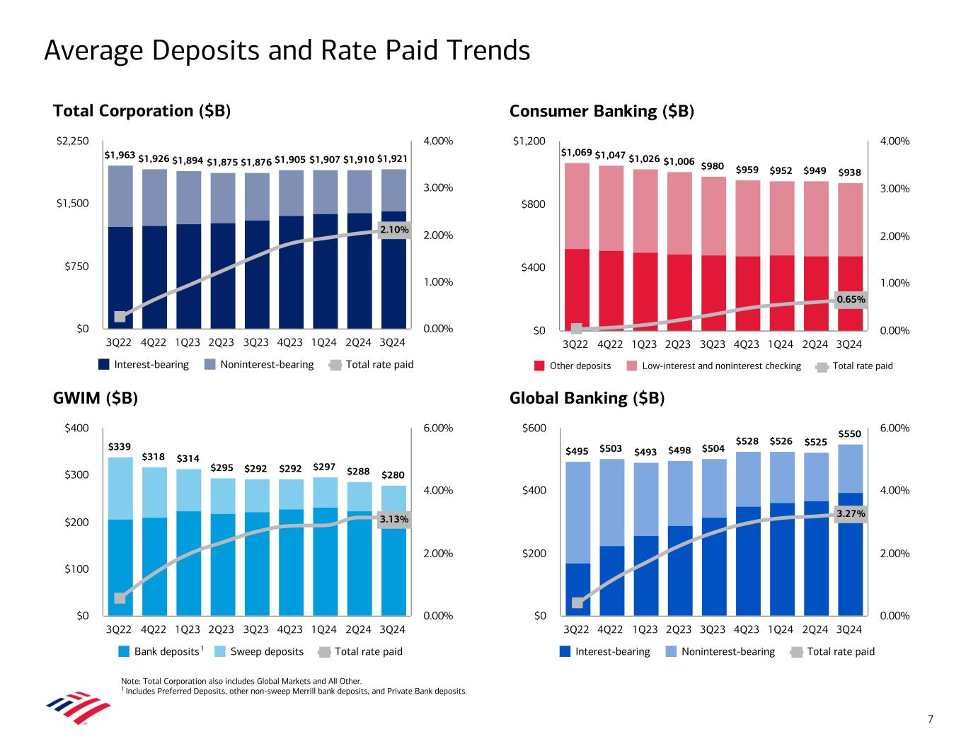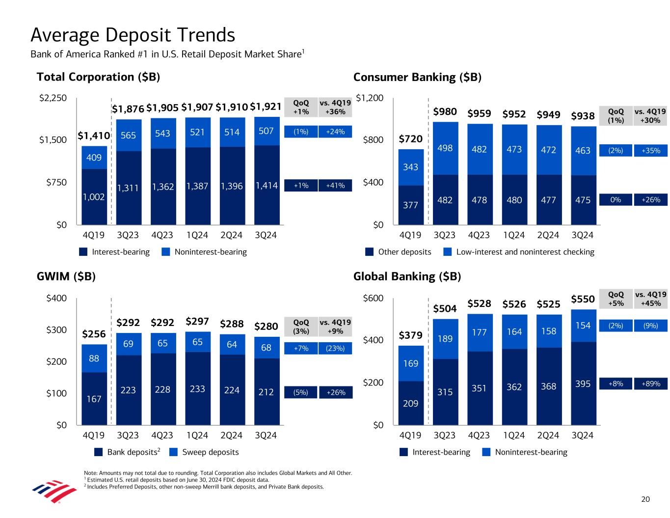 Consumer Banking ($B) GWIM ($B) Global Banking ($B) Total Corporation ($B) Average Deposit Trends Bank of America Ranked #1 in U.S. Retail Deposit Market Share1 Note: Amounts may not total due to rounding. Total Corporation also includes Global Markets and All Other. 1 Estimated U.S. retail deposits based on June 30, 2024 FDIC deposit data. 2 Includes Preferred Deposits, other non-sweep Merrill bank deposits, and Private Bank deposits. $256 $292 $292 $297 $288 $280 167 223 228 233 224 212 88 69 65 65 64 68 Bank deposits Sweep deposits 4Q19 3Q23 4Q23 1Q24 2Q24 3Q24 $0 $100 $200 $300 $400 $1,410 $1,876 $1,905 $1,907 $1,910 $1,921 1,002 1,311 1,362 1,387 1,396 1,414 409 565 543 521 514 507 Interest-bearing Noninterest-bearing 4Q19 3Q23 4Q23 1Q24 2Q24 3Q24 $0 $750 $1,500 $2,250 $379 $504 $528 $526 $525 $550 209 315 351 362 368 395 169 189 177 164 158 154 Interest-bearing Noninterest-bearing 4Q19 3Q23 4Q23 1Q24 2Q24 3Q24 $0 $200 $400 $600 (5%) +7% +1% (1%) QoQ +1% QoQ (3%) QoQ (1%) +8% (2%) 0% QoQ +5% 20 $720 $980 $959 $952 $949 $938 377 482 478 480 477 475 343 498 482 473 472 463 Other deposits Low-interest and noninterest checking 4Q19 3Q23 4Q23 1Q24 2Q24 3Q24 $0 $400 $800 $1,200 (2%) +41% +24% vs. 4Q19 +36% +26% (23%) vs. 4Q19 +9% +26% +35% vs. 4Q19 +30% +89% (9%) vs. 4Q19 +45% 2