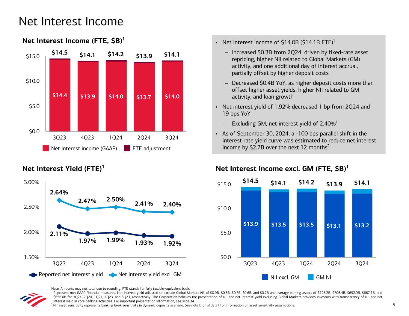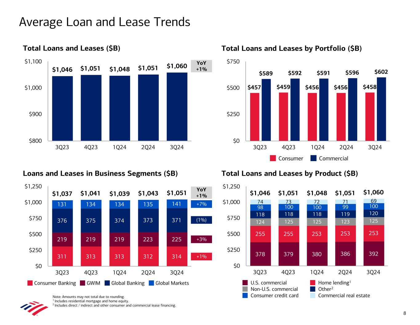 $1,037 $1,041 $1,039 $1,043 $1,051 311 313 313 312 314 219 219 219 223 225 376 375 374 373 371 131 134 134 135 141 Consumer Banking GWIM Global Banking Global Markets 3Q23 4Q23 1Q24 2Q24 3Q24 $0 $250 $500 $750 $1,000 $1,250 $1,046 $1,051 $1,048 $1,051 $1,060 3Q23 4Q23 1Q24 2Q24 3Q24 $800 $900 $1,000 $1,100 +1% +3% (1%) +7% Average Loan and Lease Trends YoY +1% YoY +1% Note: Amounts may not total due to rounding. 1 Includes residential mortgage and home equity. 2 Includes direct / indirect and other consumer and commercial lease financing. Total Loans and Leases by Product ($B) Loans and Leases in Business Segments ($B) Total Loans and Leases by Portfolio ($B)Total Loans and Leases ($B) $457 $459 $456 $456 $458 $589 $592 $591 $596 $602 Consumer Commercial 3Q23 4Q23 1Q24 2Q24 3Q24 $0 $250 $500 $750 8 $1,046 $1,051 $1,048 $1,051 $1,060 378 379 380 386 392 255 255 253 253 253 124 125 125 123 125 118 118 118 119 120 98 100 100 99 100 74 73 72 71 69 U.S. commercial Home lending Non-U.S. commercial Other Consumer credit card Commercial real estate 3Q23 4Q23 1Q24 2Q24 3Q24 $0 $250 $500 $750 $1,000 $1,250 2 1