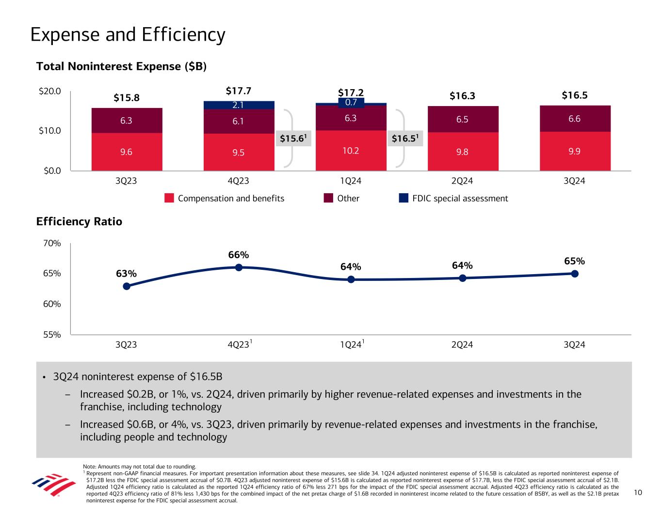 • Net interest income of $14.0B ($14.1B FTE)1 – Increased $0.3B from 2Q24, driven by fixed-rate asset repricing, higher NII related to Global Markets (GM) activity, and one additional day of interest accrual, partially offset by higher deposit costs – Decreased $0.4B YoY, as higher deposit costs more than offset higher asset yields, higher NII related to GM activity, and loan growth • Net interest yield of 1.92% decreased 1 bp from 2Q24 and 19 bps YoY – Excluding GM, net interest yield of 2.40%1 • As of September 30, 2024, a -100 bps parallel shift in the interest rate yield curve was estimated to reduce net interest income by $2.7B over the next 12 months2 Net Interest Income (FTE, $B)1 Net Interest Income Net Interest Yield (FTE)1 Note: Amounts may not total due to rounding. FTE stands for fully taxable-equivalent basis. 1 Represent non-GAAP financial measures. Net interest yield adjusted to exclude Global Markets NII of $0.9B, $0.8B, $0.7B, $0.6B, and $0.7B and average earning assets of $728.2B, $706.4B, $692.9B, $667.1B, and $656.0B for 3Q24, 2Q24, 1Q24, 4Q23, and 3Q23, respectively. The Corporation believes the presentation of NII and net interest yield excluding Global Markets provides investors with transparency of NII and net interest yield in core banking activities. For important presentation information, see slide 34. 2 NII asset sensitivity represents banking book sensitivity in dynamic deposits scenario. See note D on slide 31 for information on asset sensitivity assumptions. 2.11% 1.97% 1.99% 1.93% 1.92% 2.64% 2.47% 2.50% 2.41% 2.40% Reported net interest yield Net interest yield excl. GM 3Q23 4Q23 1Q24 2Q24 3Q24 1.50% 2.00% 2.50% 3.00% $14.5 $14.1 $14.2 $13.9 $14.1 $14.4 $13.9 $14.0 $13.7 $14.0 Net interest income (GAAP) FTE adjustment 3Q23 4Q23 1Q24 2Q24 3Q24 $0.0 $5.0 $10.0 $15.0 9 Net Interest Income excl. GM (FTE, $B)1 $14.5 $14.1 $14.2 $13.9 $14.1 $13.9 $13.5 $13.5 $13.1 $13.2 NII excl. GM GM NII 3Q23 4Q23 1Q24 2Q24 3Q24 $0.0 $5.0 $10.0 $15.0