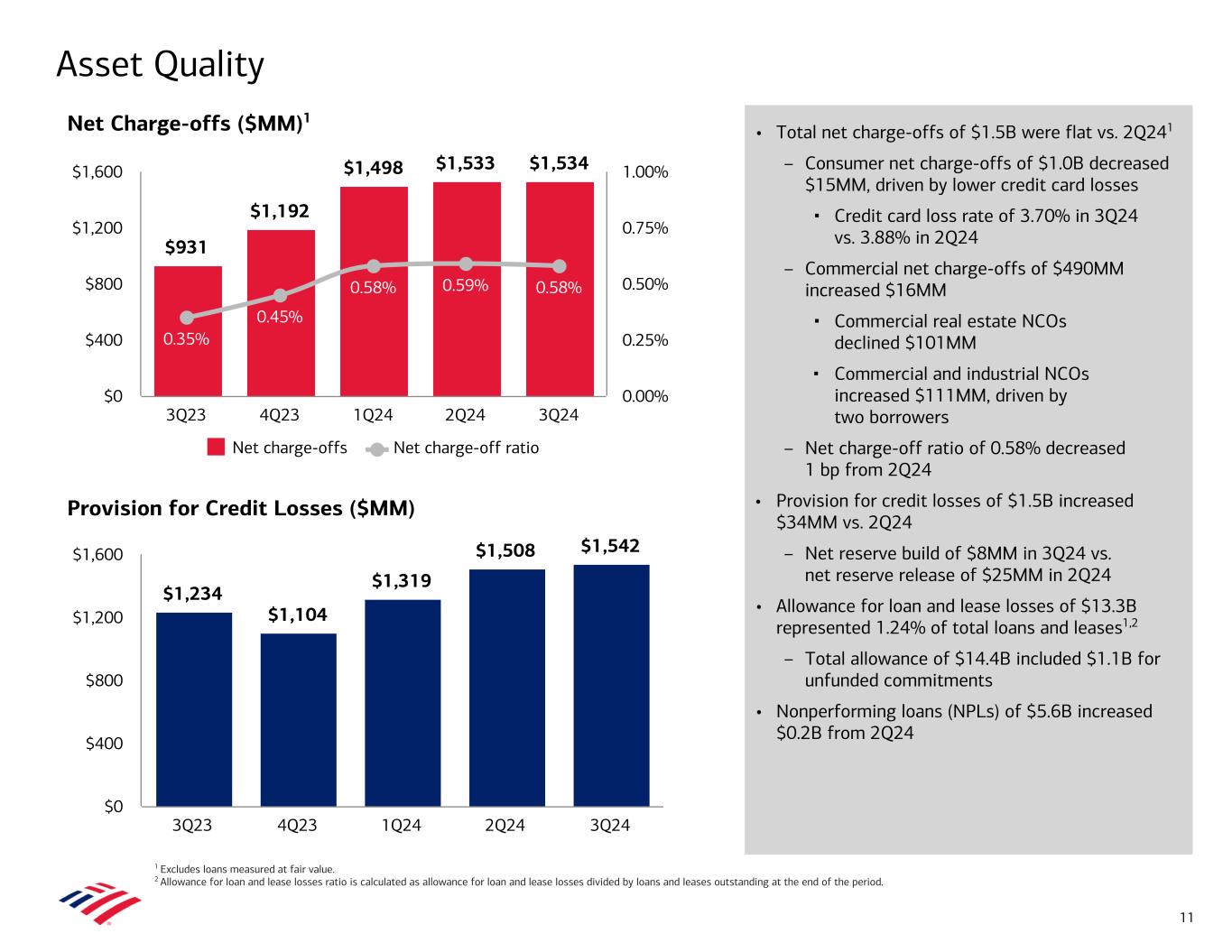 • 3Q24 noninterest expense of $16.5B – Increased $0.2B, or 1%, vs. 2Q24, driven primarily by higher revenue-related expenses and investments in the franchise, including technology – Increased $0.6B, or 4%, vs. 3Q23, driven primarily by revenue-related expenses and investments in the franchise, including people and technology $15.8 $17.7 $17.2 $16.3 $16.5 9.6 9.5 10.2 9.8 9.9 6.3 6.1 6.3 6.5 6.6 2.1 0.7 Compensation and benefits Other FDIC special assessment 3Q23 4Q23 1Q24 2Q24 3Q24 $0.0 $10.0 $20.0 63% 66% 64% 64% 65% 3Q23 4Q23 1Q24 2Q24 3Q24 55% 60% 65% 70% Total Noninterest Expense ($B) Efficiency Ratio Expense and Efficiency 10 1 $16.51 Note: Amounts may not total due to rounding. 1 Represent non-GAAP financial measures. For important presentation information about these measures, see slide 34. 1Q24 adjusted noninterest expense of $16.5B is calculated as reported noninterest expense of $17.2B less the FDIC special assessment accrual of $0.7B. 4Q23 adjusted noninterest expense of $15.6B is calculated as reported noninterest expense of $17.7B, less the FDIC special assessment accrual of $2.1B. Adjusted 1Q24 efficiency ratio is calculated as the reported 1Q24 efficiency ratio of 67% less 271 bps for the impact of the FDIC special assessment accrual. Adjusted 4Q23 efficiency ratio is calculated as the reported 4Q23 efficiency ratio of 81% less 1,430 bps for the combined impact of the net pretax charge of $1.6B recorded in noninterest income related to the future cessation of BSBY, as well as the $2.1B pretax noninterest expense for the FDIC special assessment accrual. $15.61 1 .