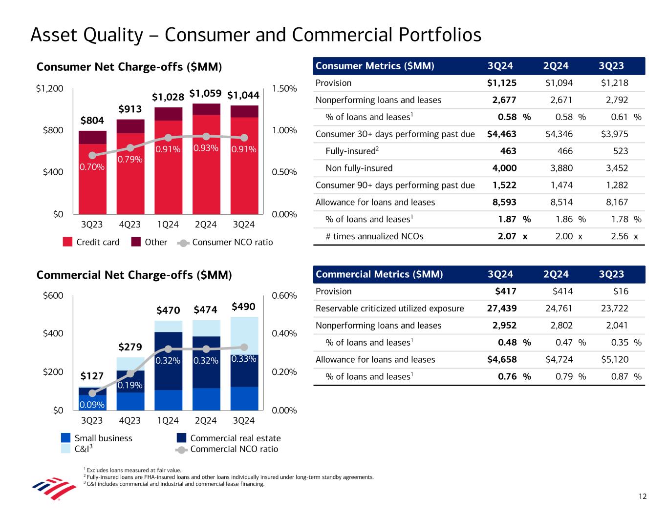 Asset Quality 1 Excludes loans measured at fair value. 2 Allowance for loan and lease losses ratio is calculated as allowance for loan and lease losses divided by loans and leases outstanding at the end of the period. Provision for Credit Losses ($MM) Net Charge-offs ($MM)1 $1,234 $1,104 $1,319 $1,508 $1,542 3Q23 4Q23 1Q24 2Q24 3Q24 $0 $400 $800 $1,200 $1,600 $931 $1,192 $1,498 $1,533 $1,534 0.35% 0.45% 0.58% 0.59% 0.58% Net charge-offs Net charge-off ratio 3Q23 4Q23 1Q24 2Q24 3Q24 $0 $400 $800 $1,200 $1,600 0.00% 0.25% 0.50% 0.75% 1.00% 11 • Total net charge-offs of $1.5B were flat vs. 2Q241 – Consumer net charge-offs of $1.0B decreased $15MM, driven by lower credit card losses ▪ Credit card loss rate of 3.70% in 3Q24 vs. 3.88% in 2Q24 – Commercial net charge-offs of $490MM increased $16MM ▪ Commercial real estate NCOs declined $101MM ▪ Commercial and industrial NCOs increased $111MM, driven by two borrowers – Net charge-off ratio of 0.58% decreased 1 bp from 2Q24 • Provision for credit losses of $1.5B increased $34MM vs. 2Q24 – Net reserve build of $8MM in 3Q24 vs. net reserve release of $25MM in 2Q24 • Allowance for loan and lease losses of $13.3B represented 1.24% of total loans and leases1,2 – Total allowance of $14.4B included $1.1B for unfunded commitments • Nonperforming loans (NPLs) of $5.6B increased $0.2B from 2Q24