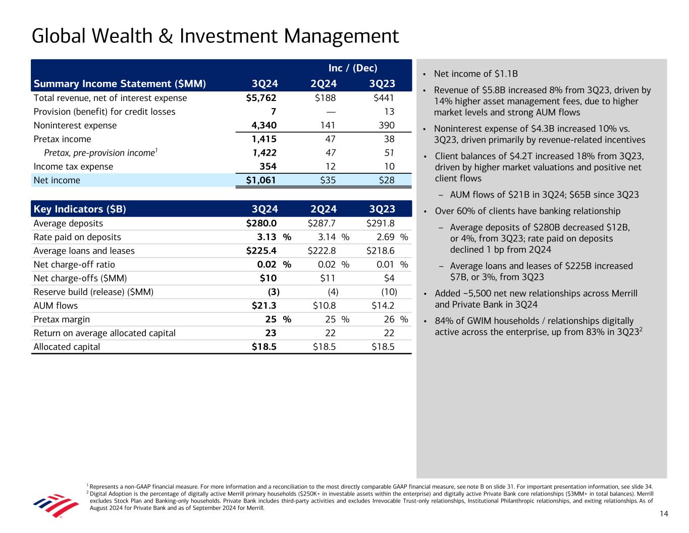 • Net income of $2.7B • Revenue of $10.4B decreased 1% from 3Q23 • Provision for credit losses of $1.3B decreased $95MM, or 7%, from 3Q23 – Net reserve build of $127MM vs. $486MM in 3Q23 – Net charge-offs of $1.2B increased $264MM from 3Q23, driven by credit card • Noninterest expense of $5.5B increased 5% compared to 3Q23, driven by investments in the business, including people and technology – Efficiency ratio of 53% • Average deposits of $938B decreased $42B, or 4%, from 3Q23 – 58% of deposits in checking accounts; 92% are primary accounts5 • Average loans and leases of $314B increased $3B, or 1%, from 3Q23 • Combined credit / debit card spend of $232B increased 3% from 3Q234 • Record consumer investment assets of $497B grew $109B, or 28%, from 3Q23,3 driven by higher market valuations and $29B of net client flows from new and existing clients – 3.9MM consumer investment accounts, up 4% • 11.2MM clients enrolled in Preferred Rewards, up 4% from 3Q236 – 99% annualized retention rate • 77% of households digitally active, up from 74% in 3Q237 Consumer Banking 1 Represents a non-GAAP financial measure. For more information and a reconciliation to the most directly comparable GAAP financial measure, see note B on slide 31. For important presentation information, see slide 34. 2 Cost of deposits calculated as annualized noninterest expense as a percentage of total average deposits within the Deposits sub-segment. 3 End of period. Consumer investment assets includes client brokerage assets, deposit sweep balances, Bank of America, N.A. brokered CDs, and AUM in Consumer Banking. 4 Includes consumer credit card portfolios in Consumer Banking and GWIM. 5 Represents the percentage of consumer checking accounts that are estimated to be the customer’s primary account based on multiple relationship factors (e.g., linked to their direct deposit). 6 As of August 2024. Includes clients in Consumer, Small Business, and GWIM. 7 As of August 2024. Represents households with consumer bank login activities in a 90-day period. Inc / (Dec) Summary Income Statement ($MM) 3Q24 2Q24 3Q23 Total revenue, net of interest expense $10,418 $212 ($54) Provision for credit losses 1,302 21 (95) Noninterest expense 5,534 70 278 Pretax income 3,582 121 (237) Pretax, pre-provision income1 4,884 142 (332) Income tax expense 895 29 (60) Net income $2,687 $92 ($177) Key Indicators ($B) 3Q24 2Q24 3Q23 Average deposits $938.4 $949.2 $980.1 Rate paid on deposits 0.65 % 0.60 % 0.34 % Cost of deposits2 1.46 1.44 1.32 Average loans and leases $313.8 $312.3 $310.8 Net charge-off ratio 1.49 % 1.53 % 1.16 % Net charge-offs ($MM) $1,175 $1,188 $911 Reserve build ($MM) 127 93 486 Consumer investment assets3 $496.6 $476.1 $387.5 Active mobile banking users (MM) 39.6 39.0 37.5 % Consumer sales through digital channels 54 % 53 % 46 % Number of financial centers 3,741 3,786 3,862 Combined credit / debit purchase volumes4 $231.9 $233.6 $225.3 Total consumer credit card risk-adjusted margin4 7.22 % 6.75 % 7.70 % Return on average allocated capital 25 24 27 Allocated capital $43.3 $43.3 $42.0 Efficiency ratio 53 % 54 % 50 % 13