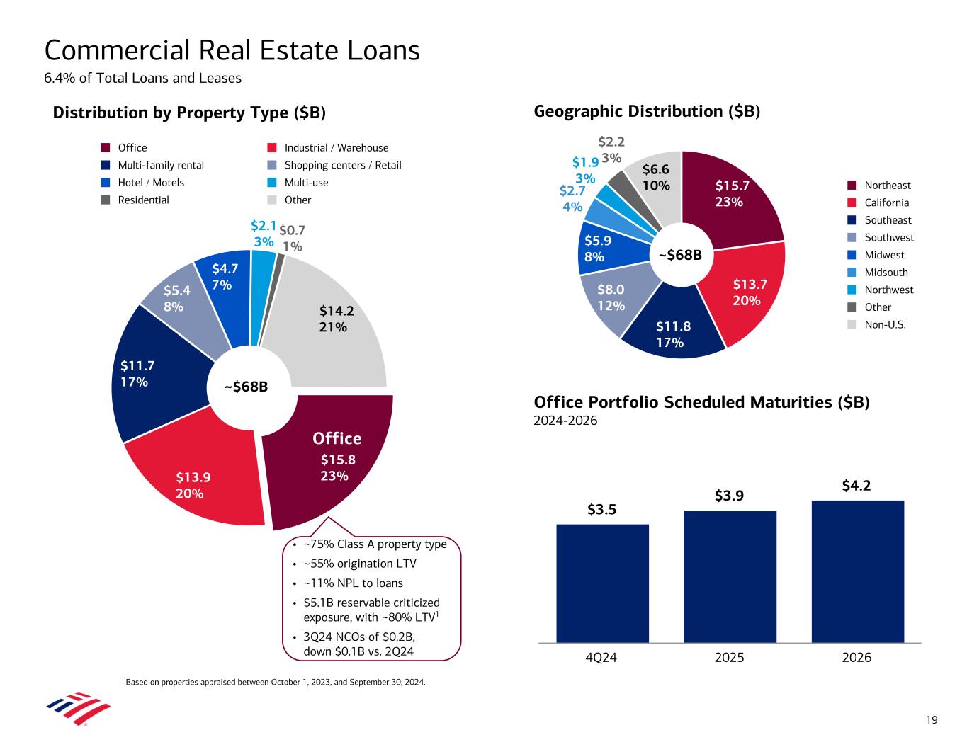Commercial Net Charge-offs ($MM) Consumer Net Charge-offs ($MM) Asset Quality – Consumer and Commercial Portfolios 1 Excludes loans measured at fair value. 2 Fully-insured loans are FHA-insured loans and other loans individually insured under long-term standby agreements. 3 C&I includes commercial and industrial and commercial lease financing. $127 $279 $470 $474 $490 0.09% 0.19% 0.32% 0.32% 0.33% Small business Commercial real estate C&I Commercial NCO ratio 3Q23 4Q23 1Q24 2Q24 3Q24 $0 $200 $400 $600 0.00% 0.20% 0.40% 0.60% $804 $913 $1,028 $1,059 $1,044 0.70% 0.79% 0.91% 0.93% 0.91% Credit card Other Consumer NCO ratio 3Q23 4Q23 1Q24 2Q24 3Q24 $0 $400 $800 $1,200 0.00% 0.50% 1.00% 1.50% Commercial Metrics ($MM) 3Q24 2Q24 3Q23 Provision $417 $414 $16 Reservable criticized utilized exposure 27,439 24,761 23,722 Nonperforming loans and leases 2,952 2,802 2,041 % of loans and leases1 0.48 % 0.47 % 0.35 % Allowance for loans and leases $4,658 $4,724 $5,120 % of loans and leases1 0.76 % 0.79 % 0.87 % Consumer Metrics ($MM) 3Q24 2Q24 3Q23 Provision $1,125 $1,094 $1,218 Nonperforming loans and leases 2,677 2,671 2,792 % of loans and leases1 0.58 % 0.58 % 0.61 % Consumer 30+ days performing past due $4,463 $4,346 $3,975 Fully-insured2 463 466 523 Non fully-insured 4,000 3,880 3,452 Consumer 90+ days performing past due 1,522 1,474 1,282 Allowance for loans and leases 8,593 8,514 8,167 % of loans and leases1 1.87 % 1.86 % 1.78 % # times annualized NCOs 2.07 x 2.00 x 2.56 x 12 3